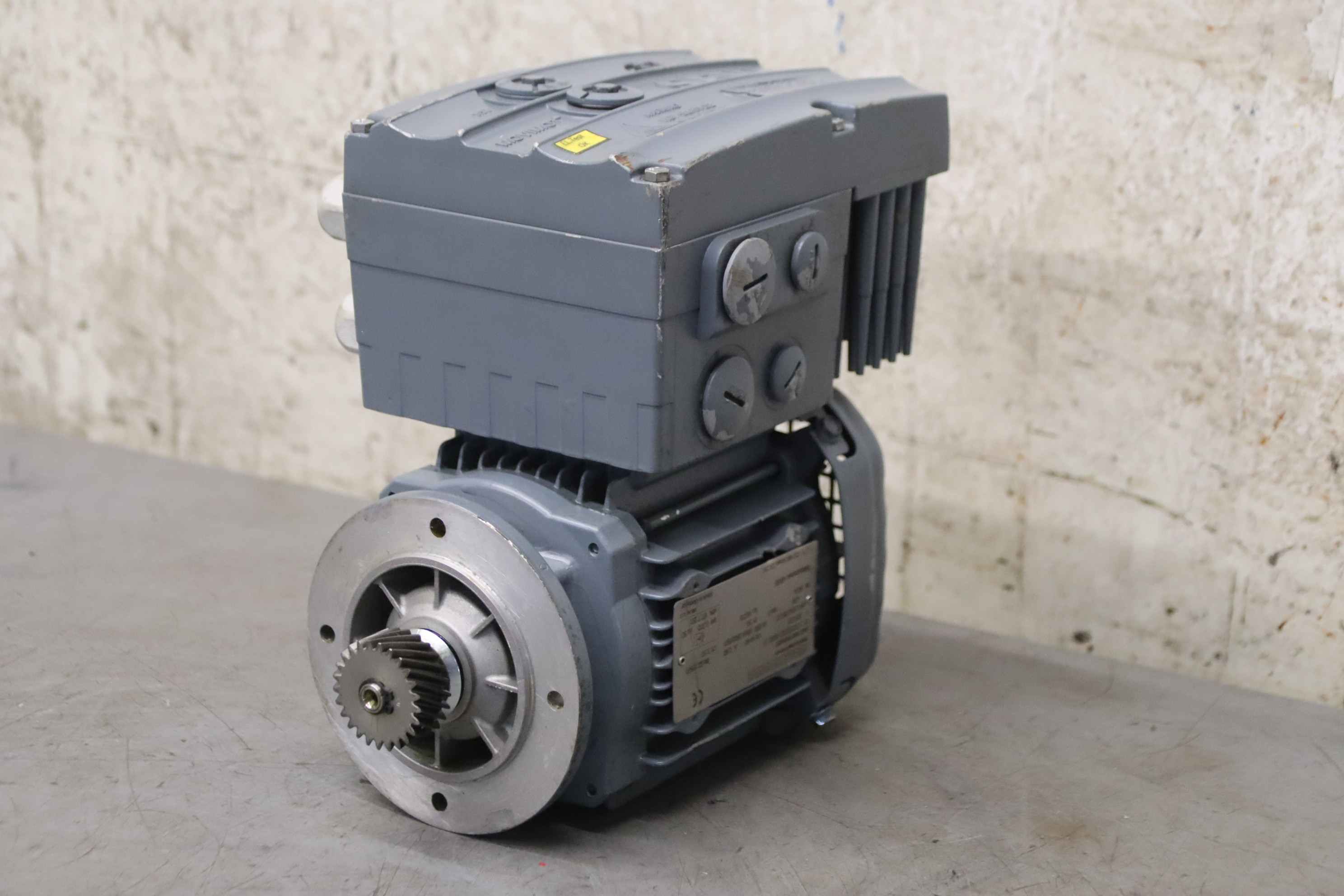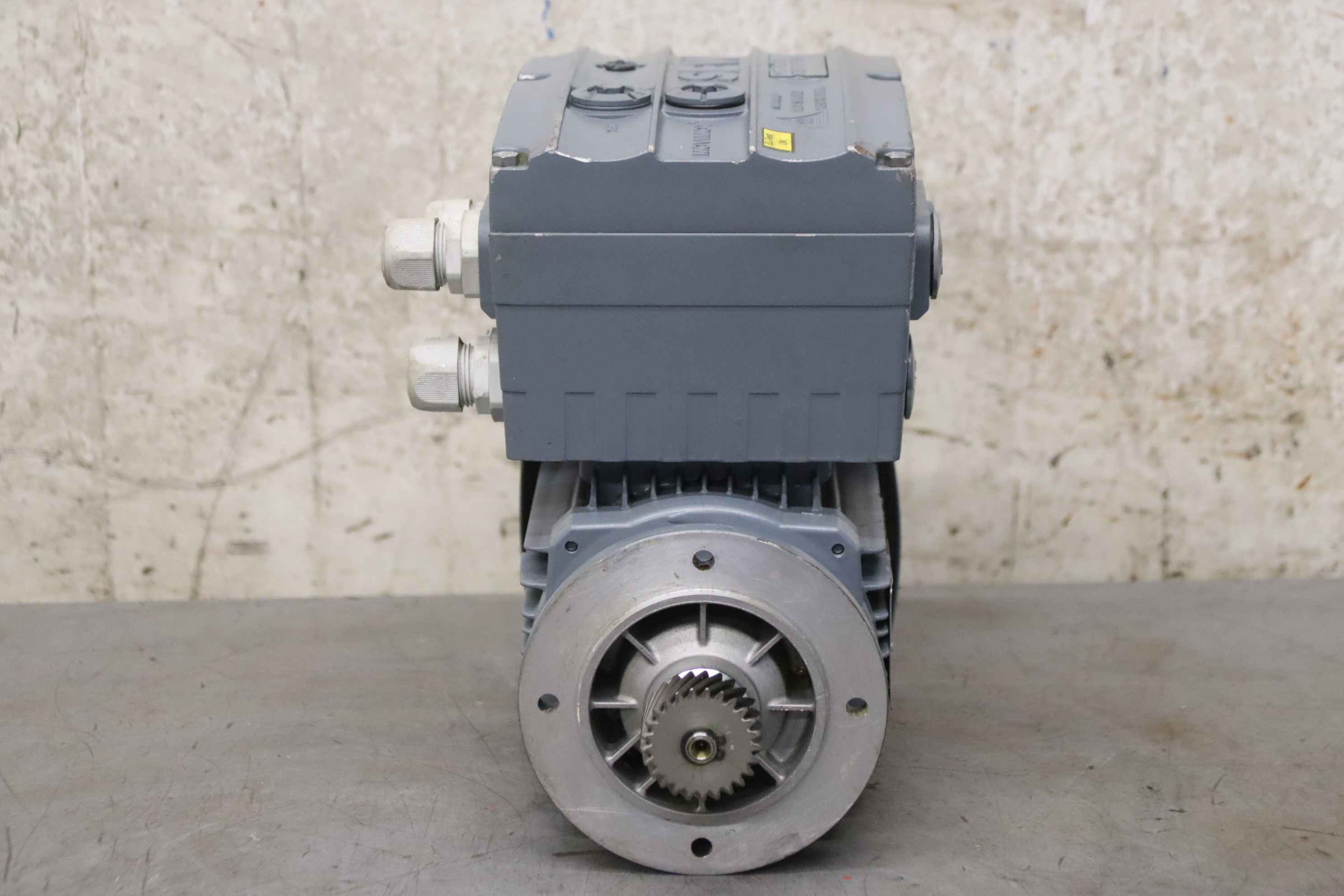 Gear motor, electric motor, electric gear motor, adjustable gear motor, variable speed gear motor-Manufacturer: SEW-Eurodrive, electric geared motor without gearbox-Type SA37 DRS71S4/MM07-Drive motor: with frequency converter MM07D-503-00 -Motor speed 2900/597 rpm-Power: 0.55/0.055 kW-Shaft: Ø 10 -14 mm, spur gear see photos-Protection rating: IP54-Dimensions: 240/186/H245 mm-Weight: 8.4 kg