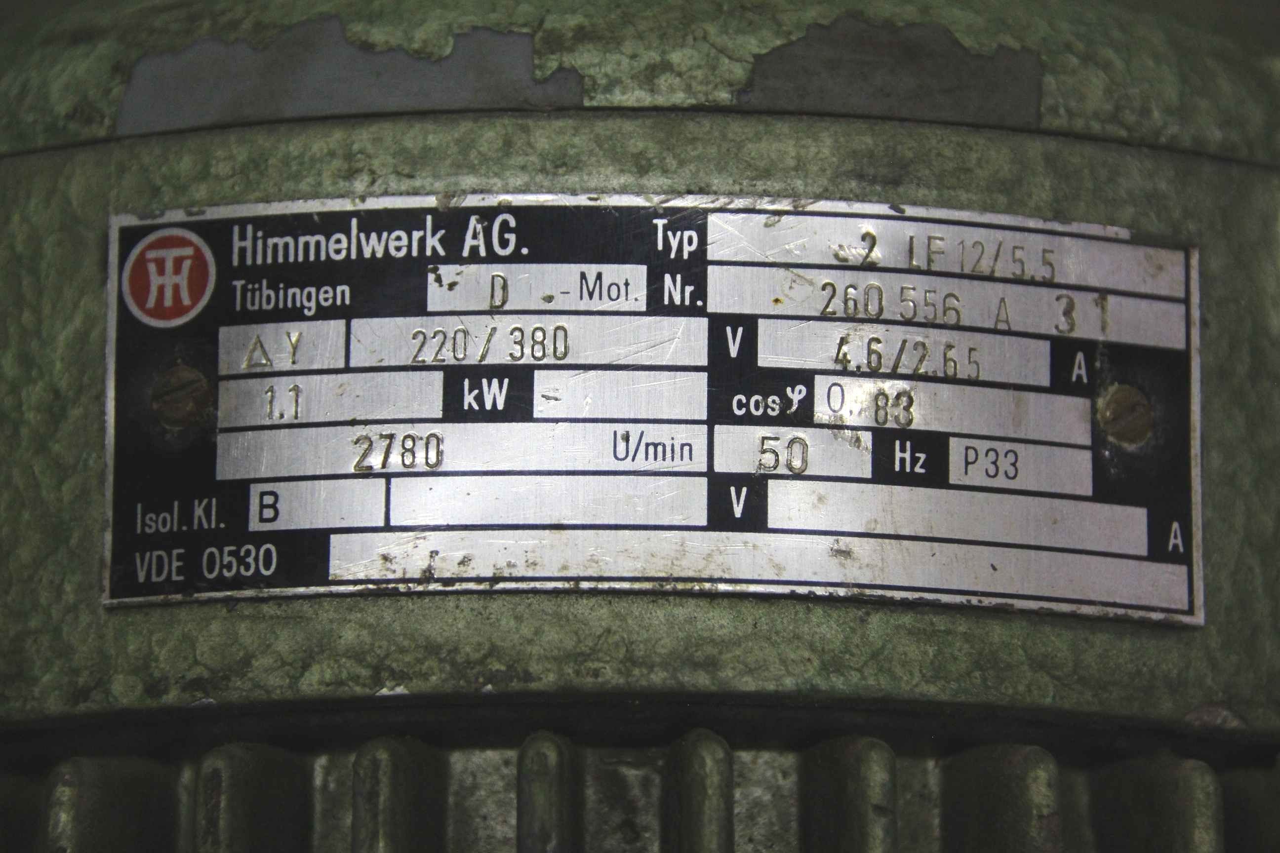 Electric motor, three-phase motor-Manufacturer: Himmelwerk, electric motor type 2 LF12 / 5.5-Power: 1.1 kW-Speed: 2780 rpm-Shaft: Ø 19 x 40 mm-Construction: B14-Dimensions: 250/180 / H270 mm-Weight: 10 kg