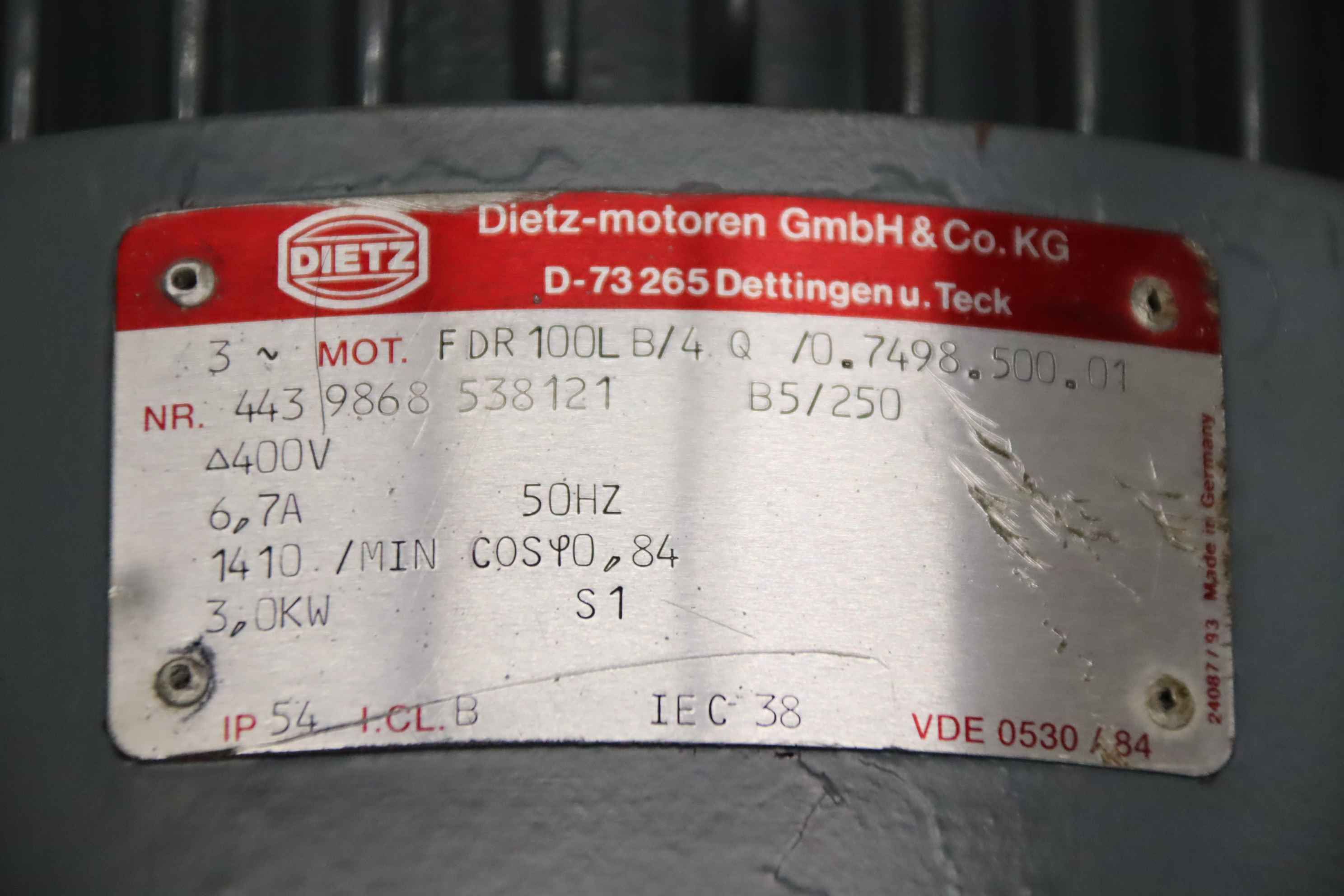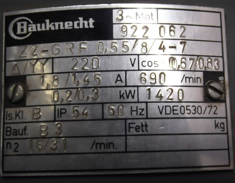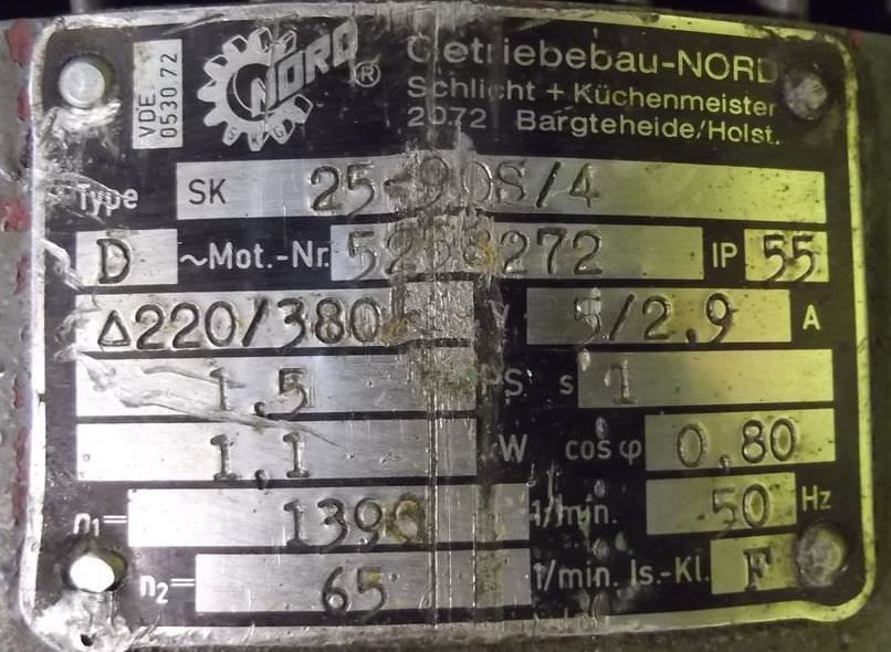 Geared motor, electric motor, electric geared motor, bevel geared motor -Speed: 5.3 rpm -Power: 3.0 kW -Design: B3 -Protection class: IP55 -Shaft: Ø 65 x 130 mm -Gearbox: Nord Getriebebau Type SK.63 IEC 100 -Electric motor: DIETZ type FDR100LB/4 -Dimensions: 890/330/H490 mm -Weight: 166 kg
