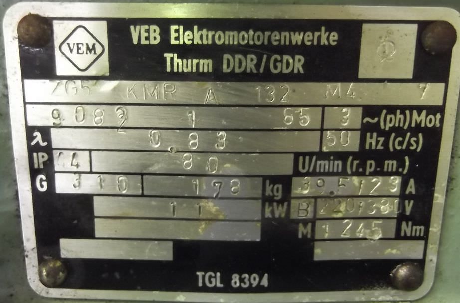 electric motor, three-phase motor -Input: 415 volts -Power: 55 kW -Speed: 2950 rpm -Shaft diameter: 60 mm -Design: B5 -Protection class: IP 54 -Dimensions: 930/600/H610 mm -Weight: 380 kg