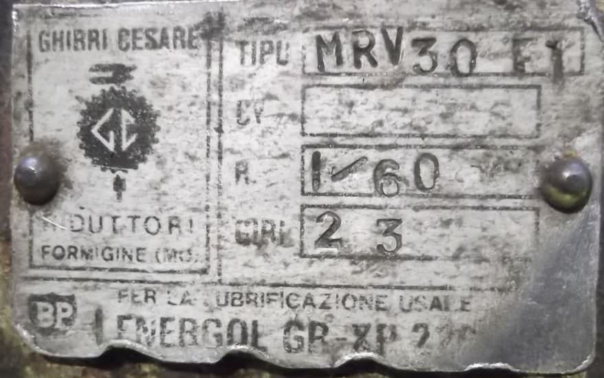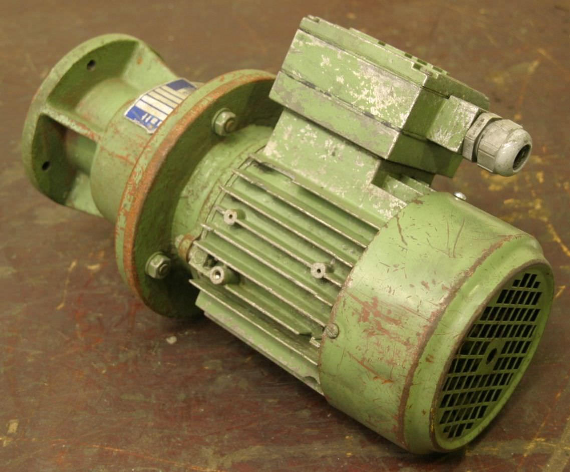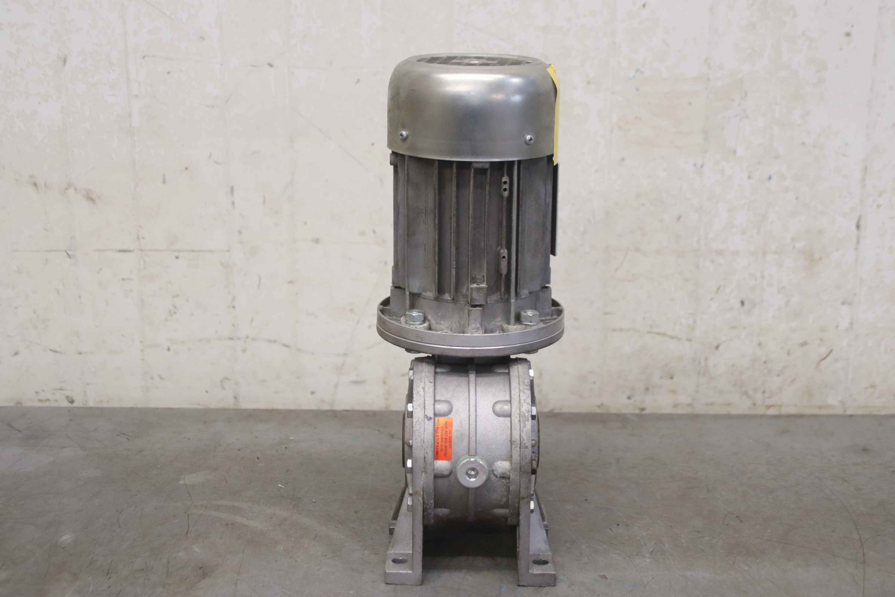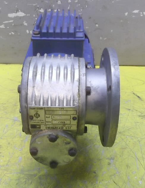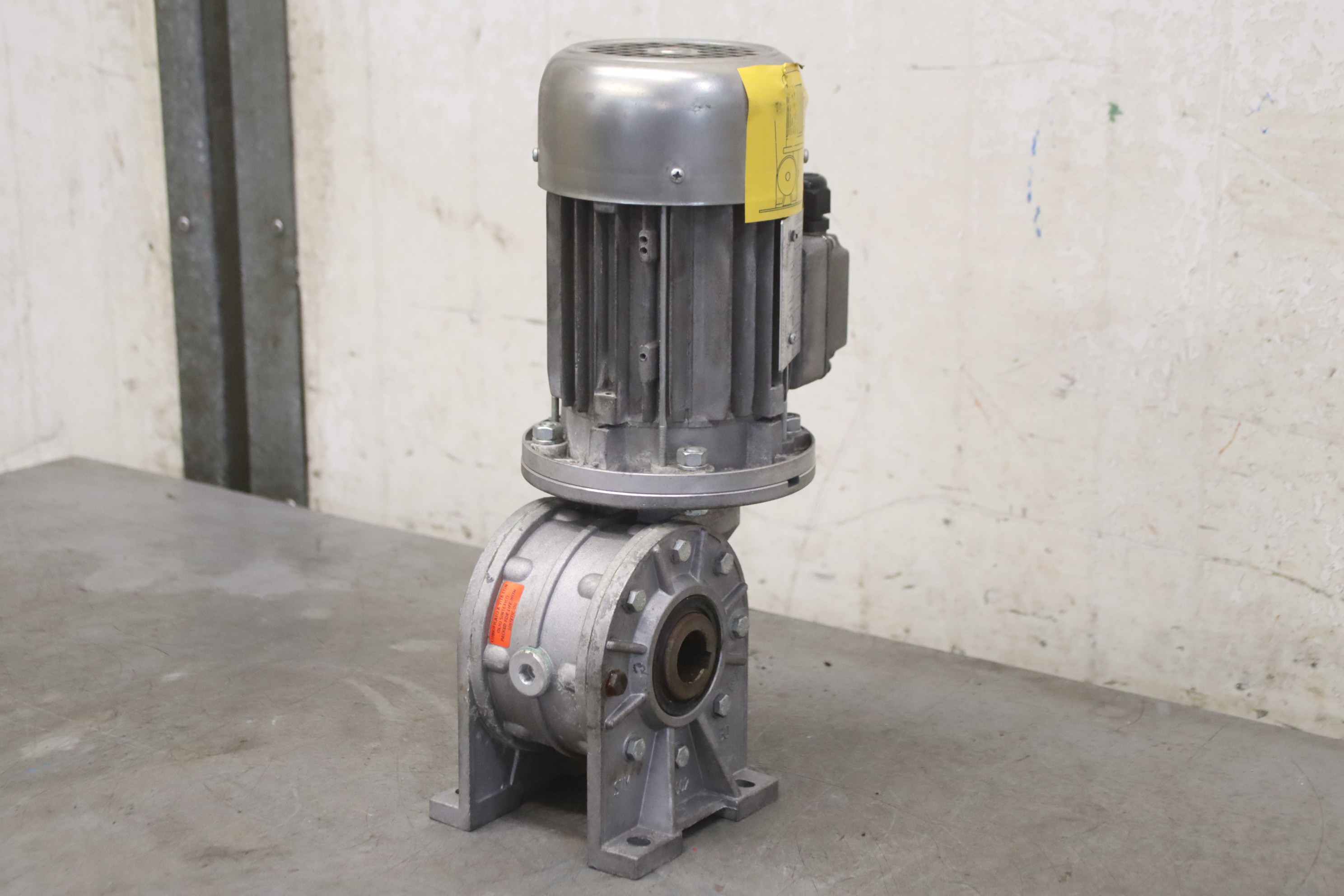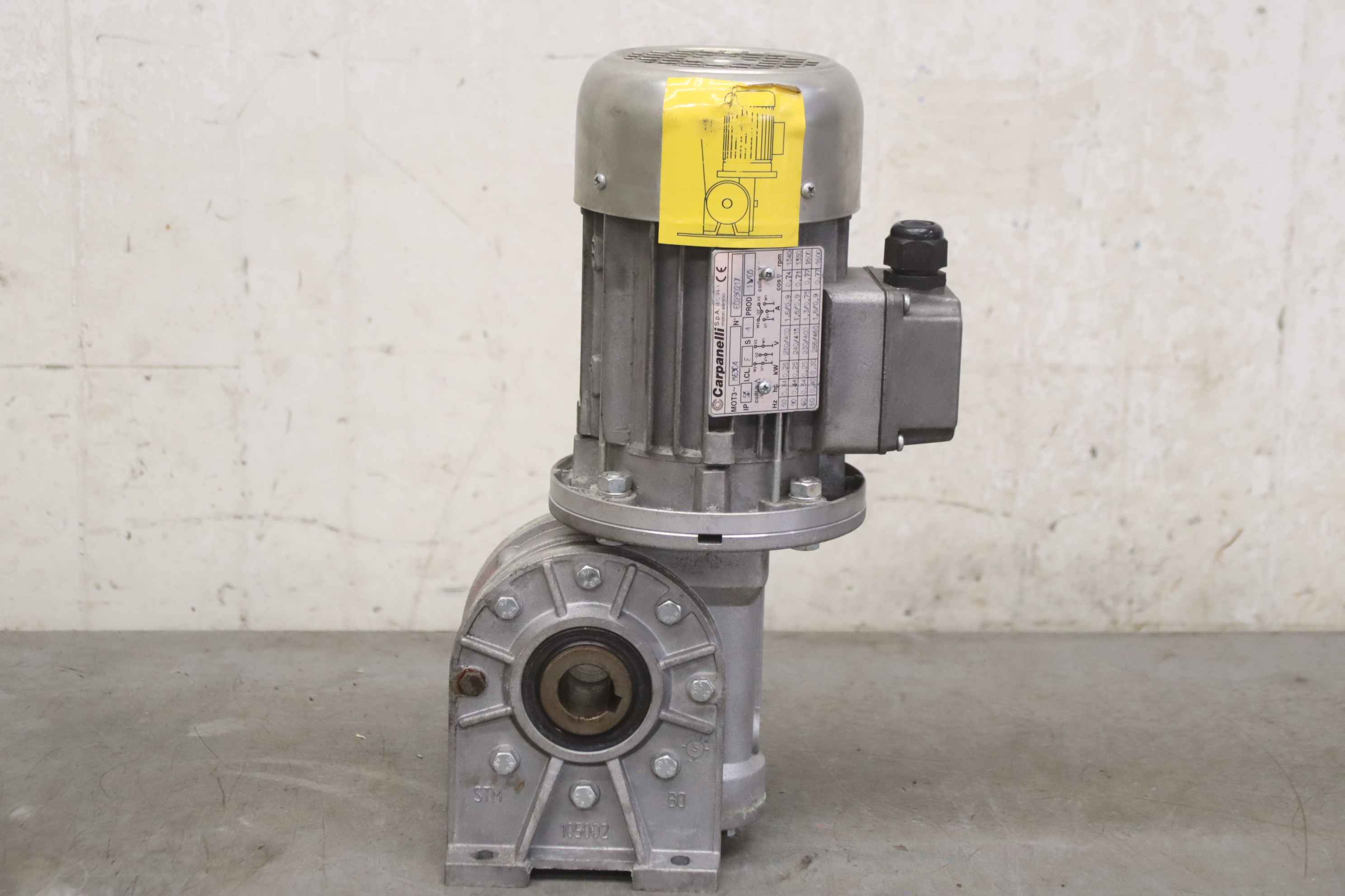 Gear motor, electric motor, three-phase motor, electric gear motor-Manufacturer: STM, geared motor type RMI 50 D-Speed speeds: approx. 13 rpm i= 1/100-Manufacturer engine: Carpanelli type M63C4-Power: 0.25 kW / 1340 rpm-Hollow shaft: Ø 24 x 100 mm-Quantity: 4x geared motor available-Price: per piece-Dimensions: 210/140/H350 mm-Weight: 8.7 kg/pc.