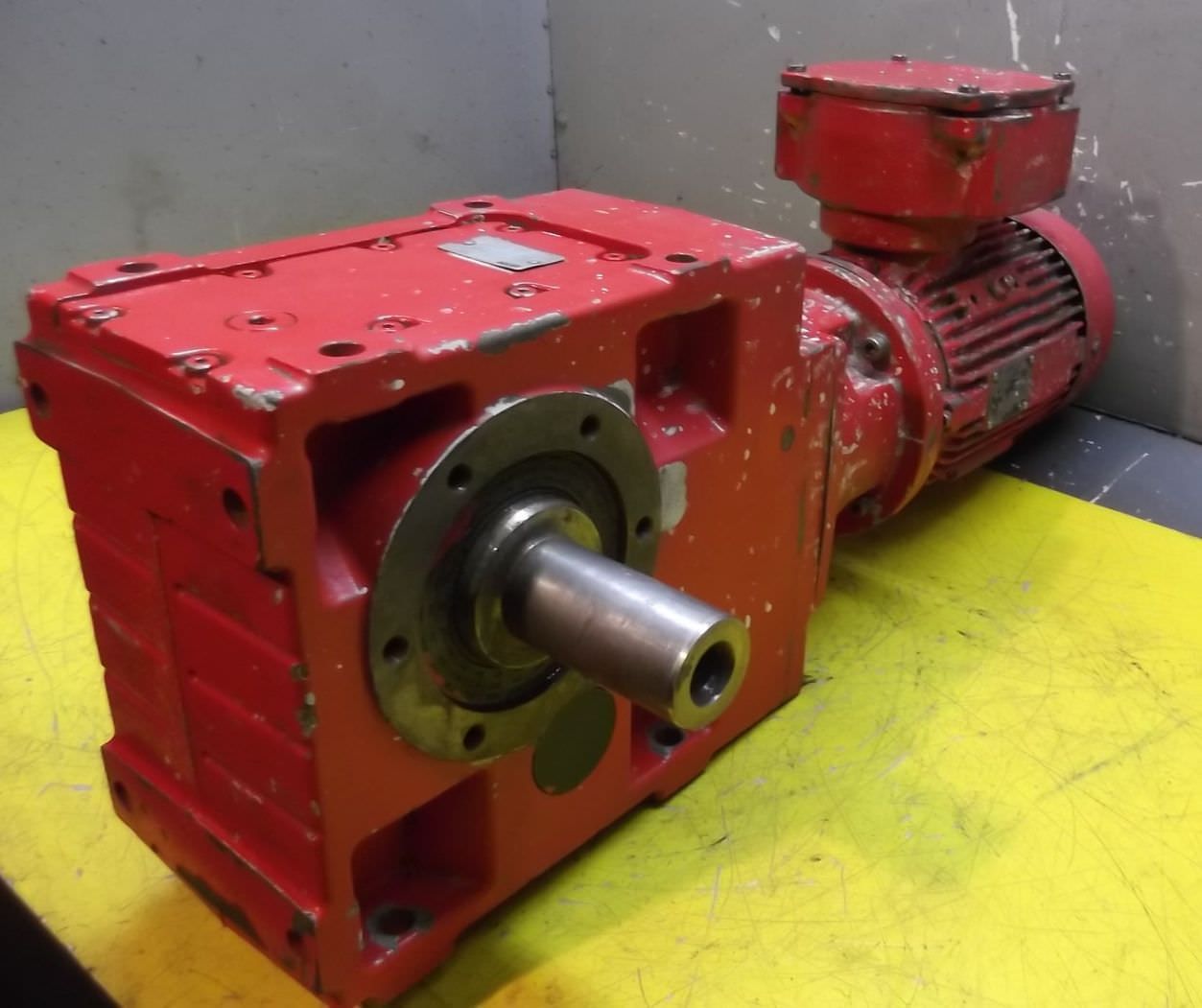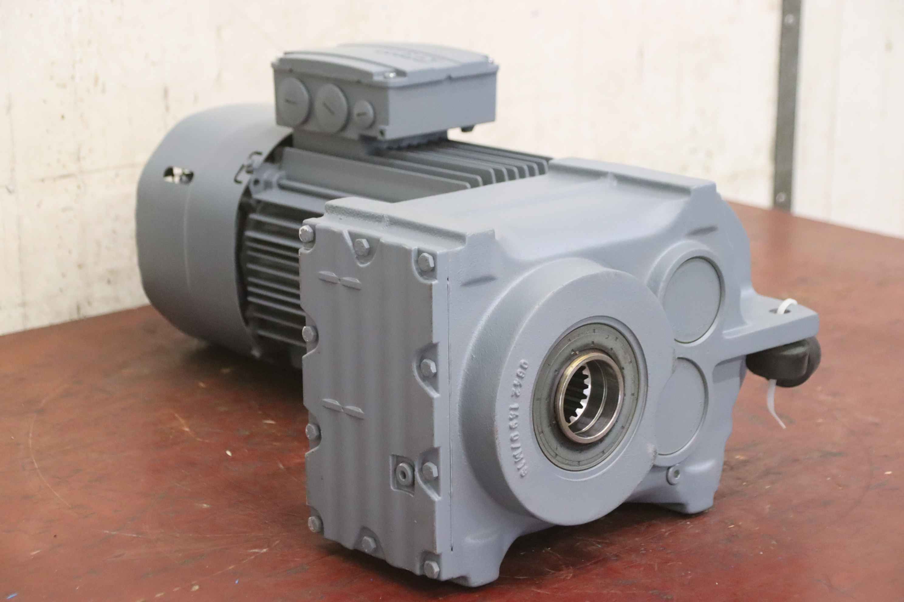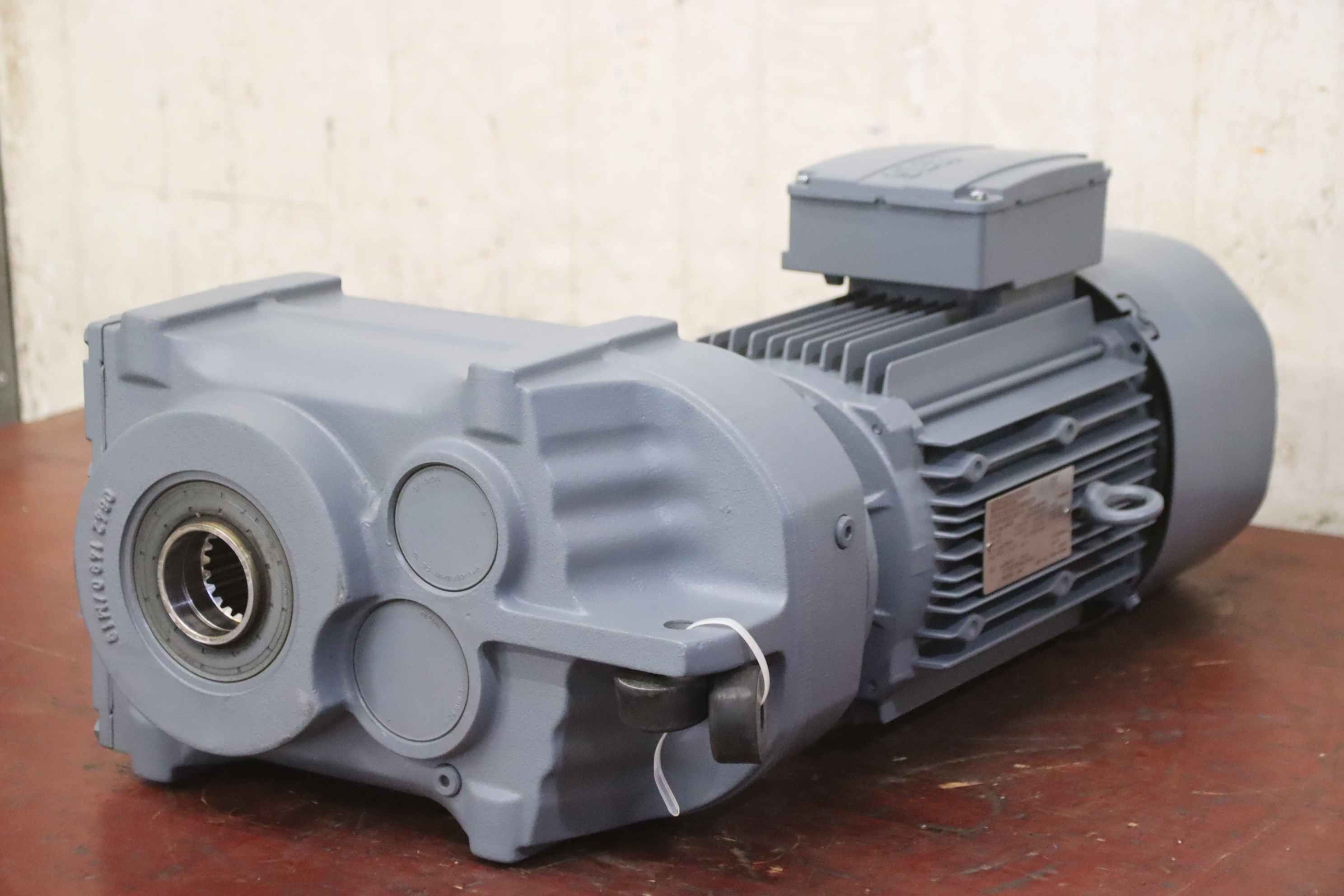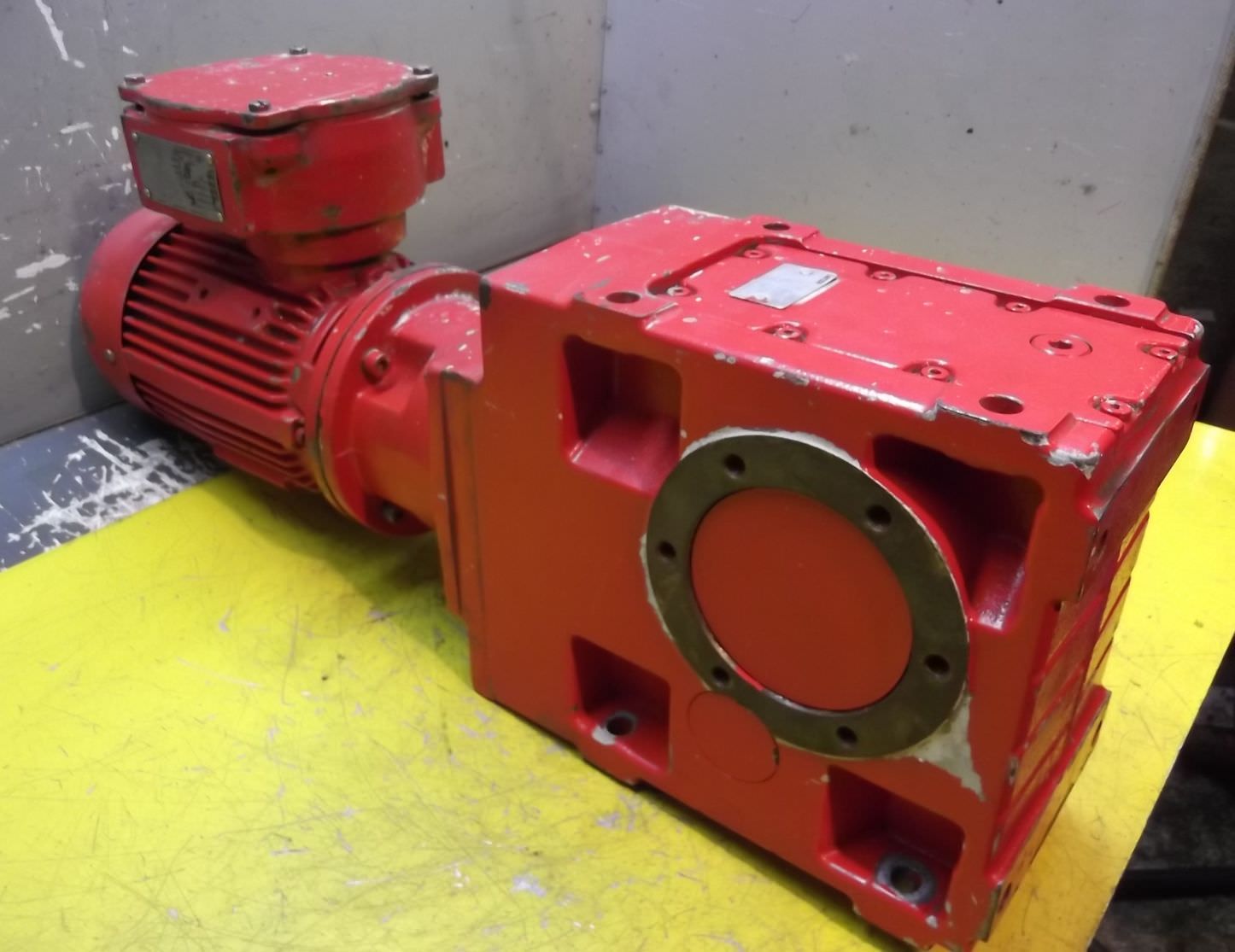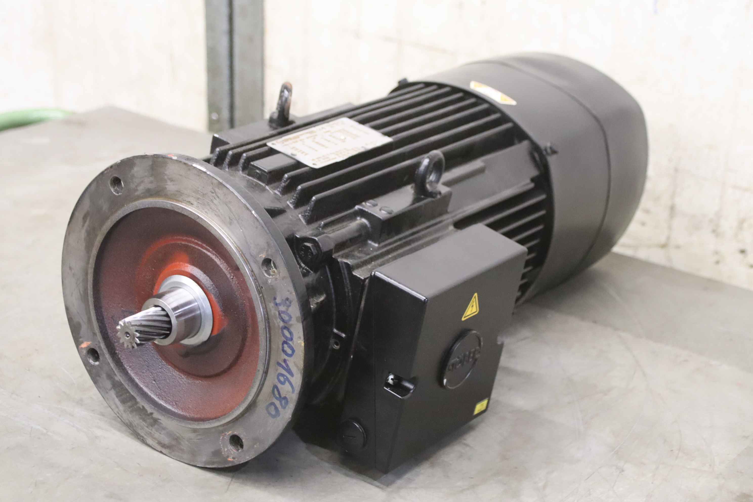 Gear motor, electric motor, electric gear motor, worm gear motor, parallel shaft gear motor -Condition: Gear motor is unused -Manufacturer: SEW-Eurodrive, gear motor with brake, parallel shaft gear unit series F -Type: FV67/G DRE100LC4BE5HF/TF -Translation: i= 25.13 -Speed: 58 rpm -Power: 3 kW -Protection class: IP54 -Gear shaft: Ø 47/41.2 x 180 mm -Brake: 28 Nm -Dimensions: 610/360/H260mm -Weight: 70kg