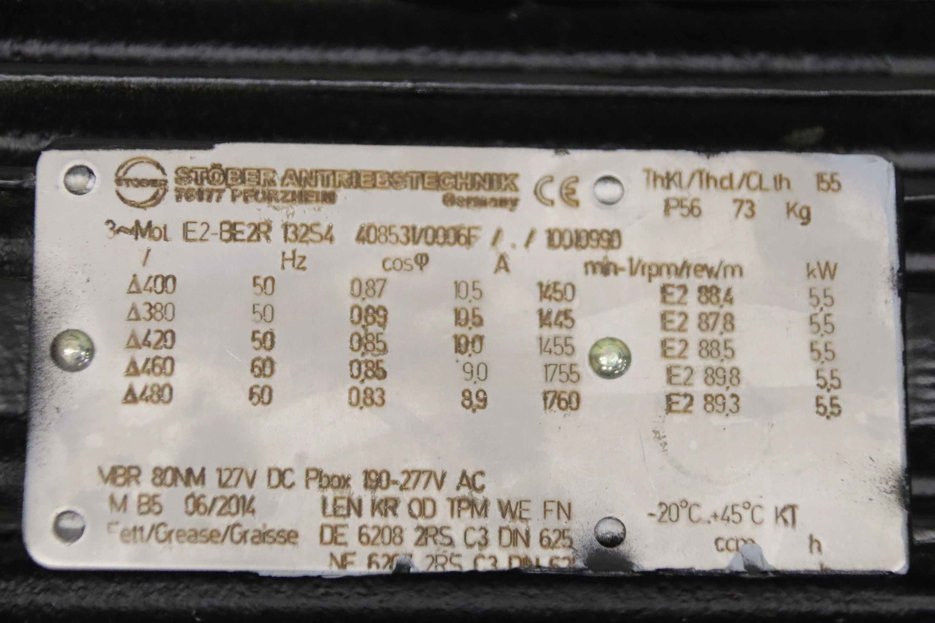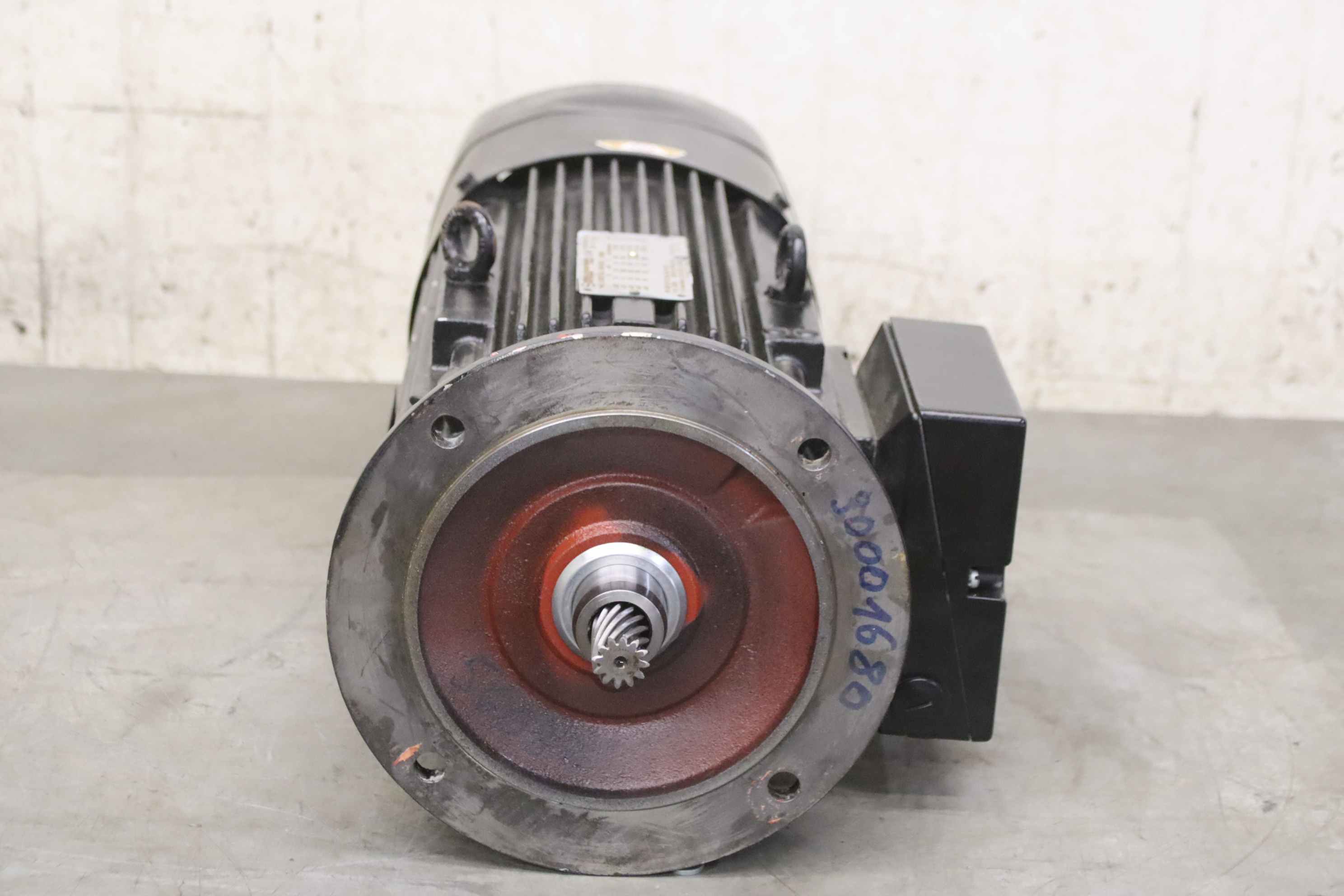 Three-phase synchronous motor, geared motor, electric motor -Three-phase synchronous motor: Baumüller type DSG 56-S -Gearbox: Nord SK. 02053F-IEC 80 -Speed: 6000 rpm -Power: 2.9 kW -Brake -Speedometer -Shaft diameter: Ø 25 mm -Brake -Protection class: IP 54 -Dimensions: 630/250/H190 mm -Weight: 35 kg