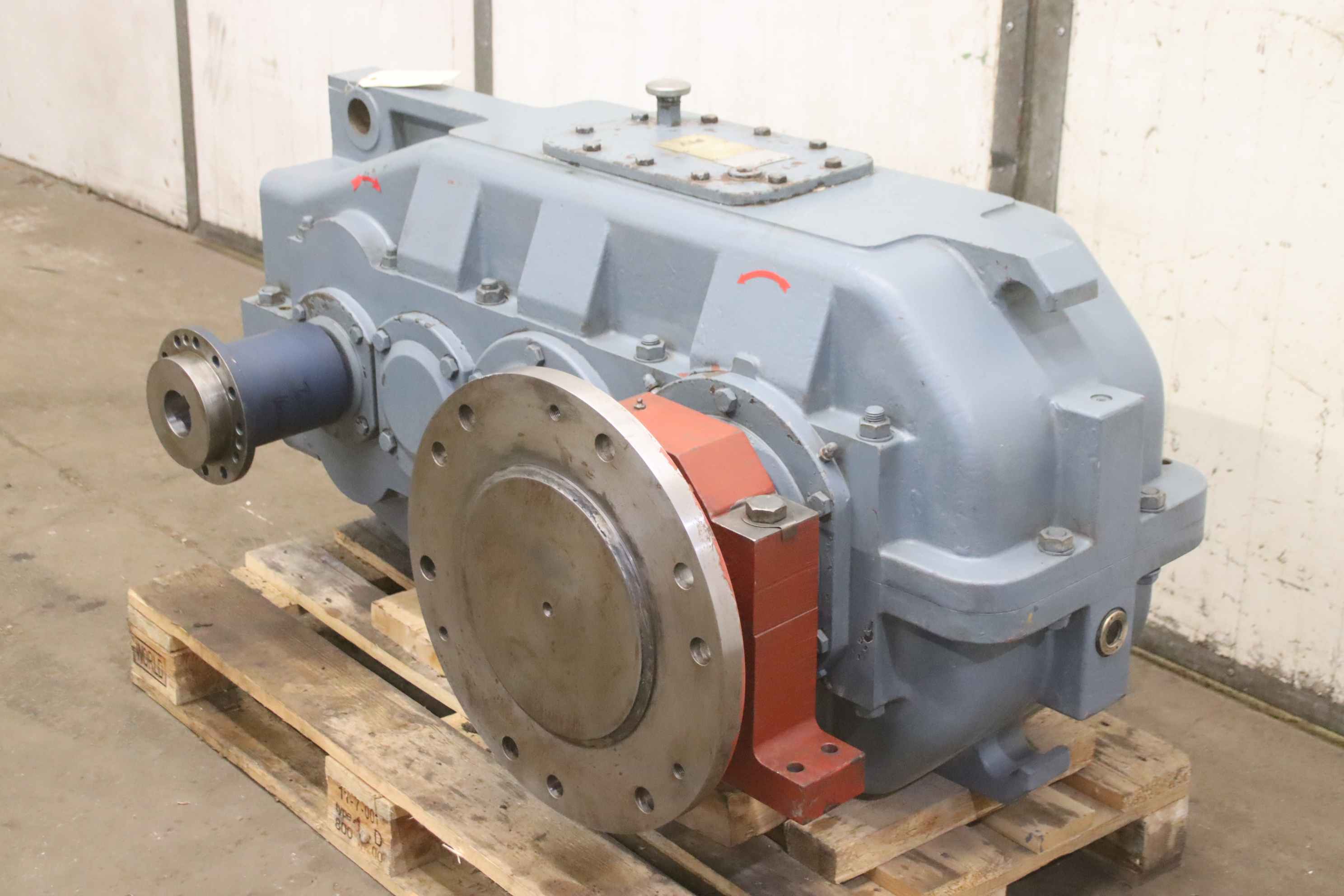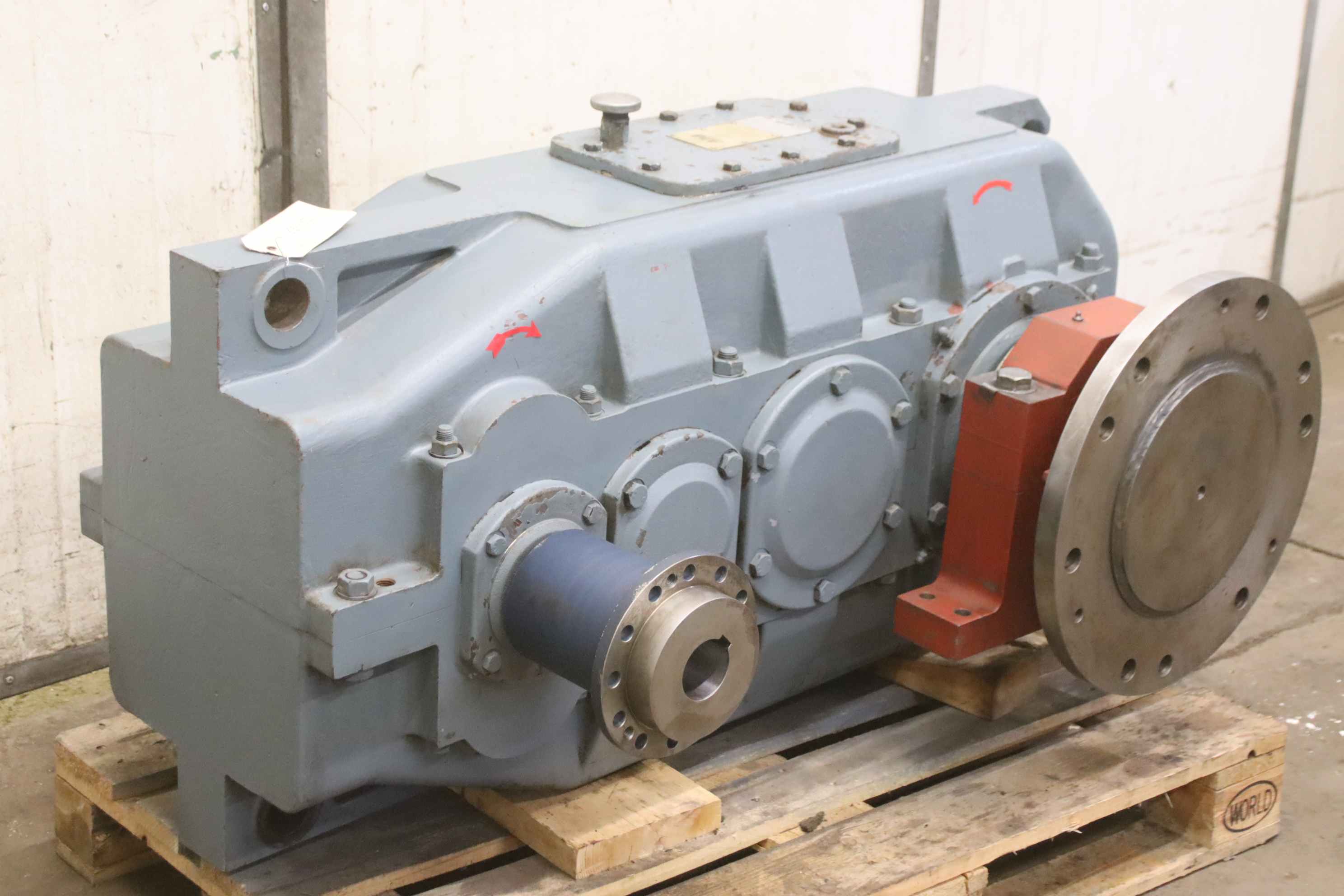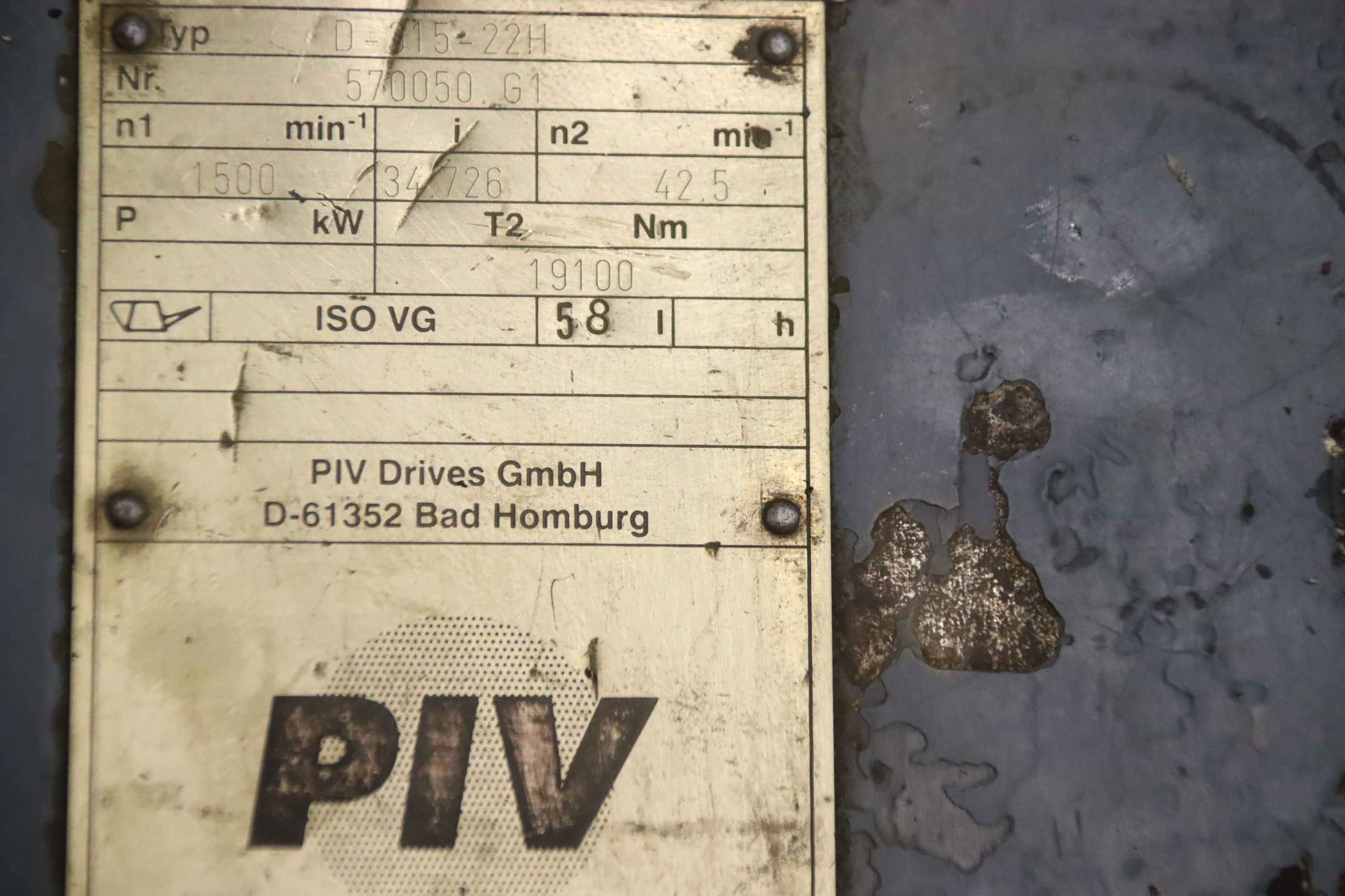 Gearboxes, spur gears, bevel gears, transmission gears, crane gears, hoist gears, grab lifting and closing gears -Manufacturer: PIV Drives, gearbox type D-315-22H -Translation: 34.726 :1 -Motor: without electric motor (can be supplied at extra cost) -Input- shaft: Ø 60 x 140 mm -Output hollow shaft: Ø 160 x 500 mm -Dimensions: 720/1300/H725 mm -Weight: 1321 kg