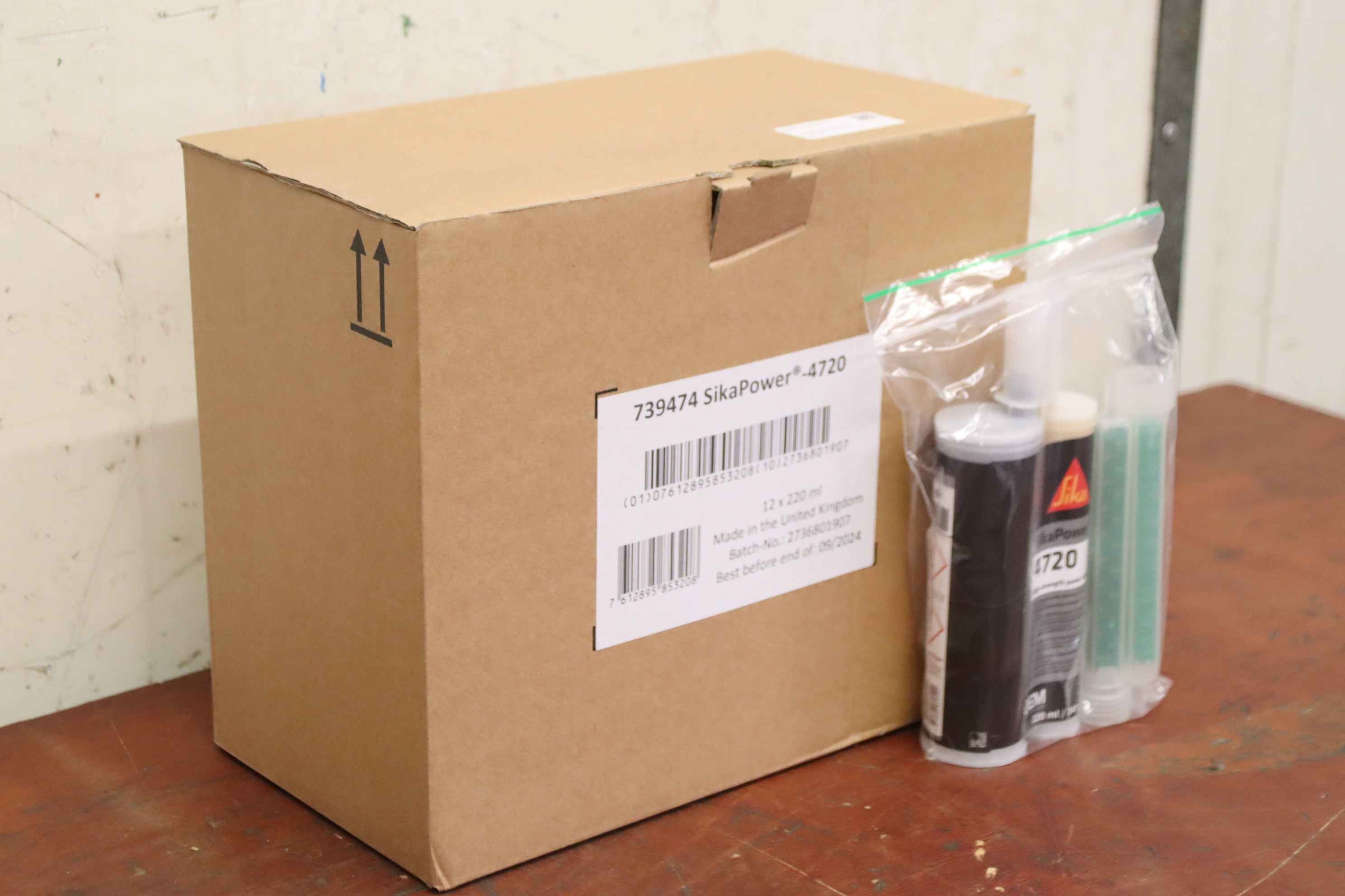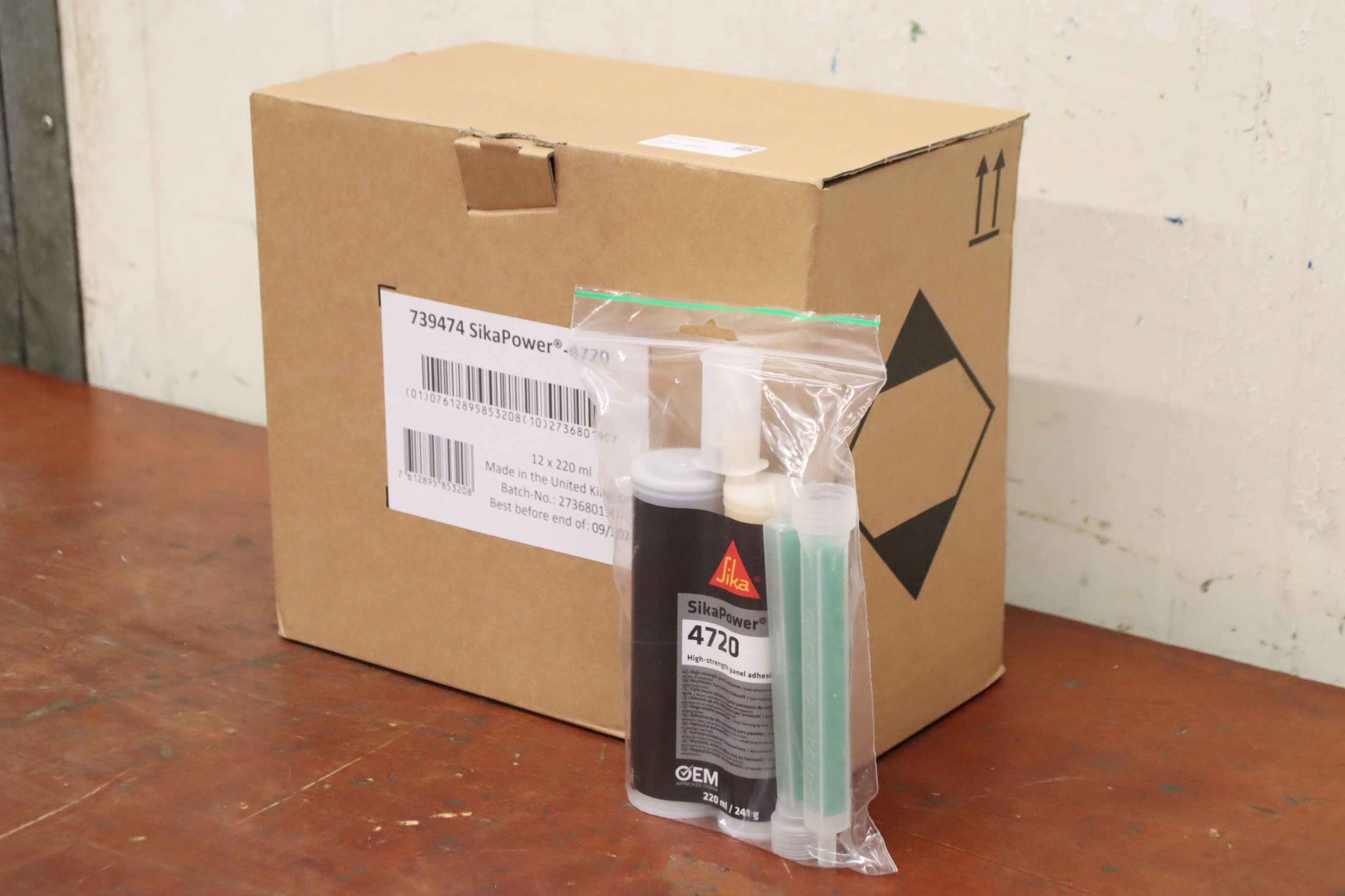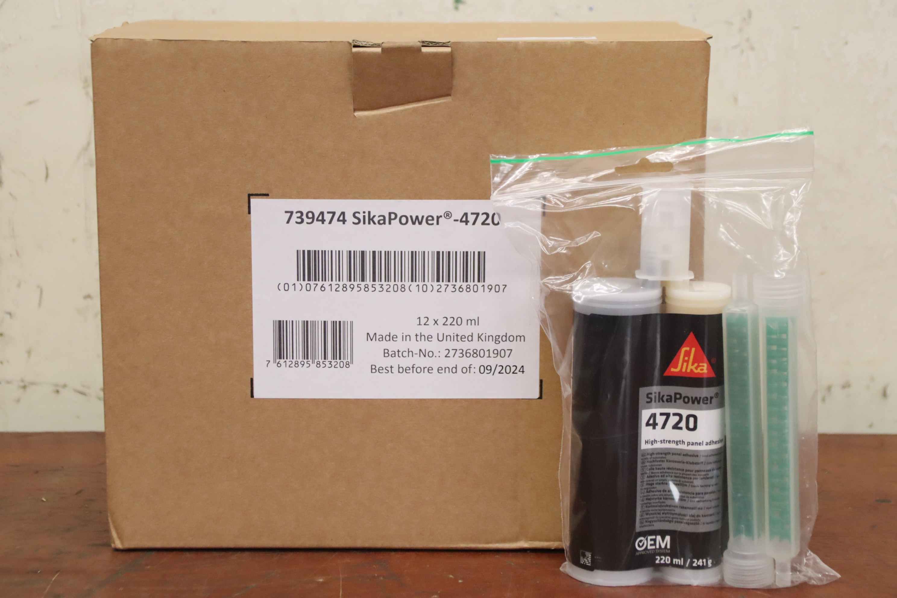 Adhesive, universal adhesive, bodywork adhesive -Manufacturer: Sika, 2-component epoxy adhesive type SikaPower -4720 2K 12 cartridges -Item No.: 739474 -Expiry date: 09/24 -Color: black -Carton: Contents 12 x 220 ml -Quantity: 20 boxes available -Price/Distribution: per carton -Cardboard dimensions: 310/170/H270 mm -Weight: 4.9 kg/carton