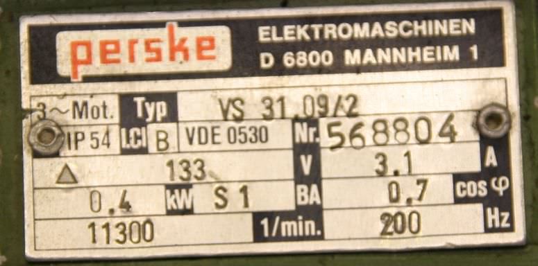 Double-end tenoner, edge processing machine, scoring motor, chipper motor, spindle motor, milling motor -Power: 0.15 kW at 11160 rpm at 200 Hz -Power: 0.22 kW at 17250 rpm at 300 Hz -Voltage: 133/200 volts -Receiving shaft: Ø 15 mm -Tool: Ø 150 x 3.0 mm -Dimensions: 200/85/H70 mm -Weight: 3 kg
