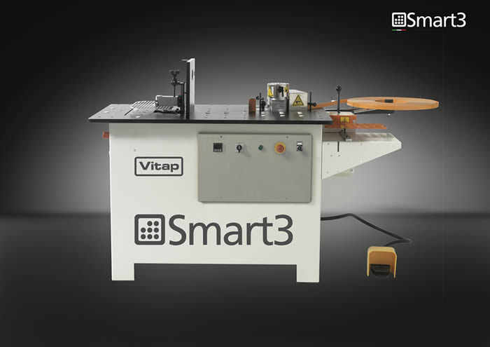 Contour edge banding & trimming machine Make: VITAP Type: SMART-3 New machine - With swivable trimming station - For straight and formed workpieces (convex and concave) - 1 glue spreading roller for 10-60 mm panel thickness - Guillotine to cut bands up to 3 mm thickness - edge 0,5-3mm 2 tape feeding speed (3 m/min or 7 m/min) -Glue pot 1kg capacity - Tape plate Ø=520mm Solid Phenolic table - Easy to clean - With no heat transmission - Electronic temperature control - Foot pedal command for the guillotine Tilting trimming unit - with 1 high frequency motor HP 0.75 (kw0,55) - 1 cutter Head with 2 knives r1mm/r2mm/r3mm - Support tape plate Ø 600 mm - Semi-automatic end-cutter with motor 0,5 kw and blade Ø=125 mm - Working table 400 x 300 mm. - CE standards. Optional available for an extra charge: - Cutter (without knives) - Set ...