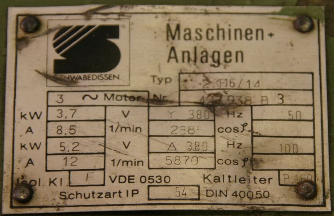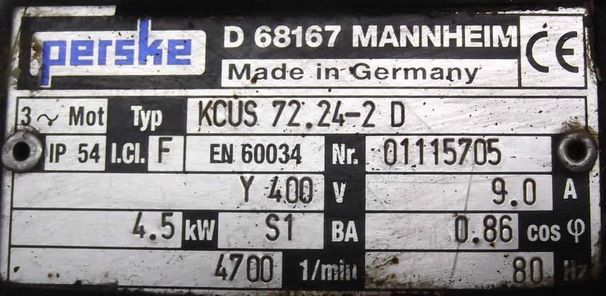 Double-end tenoner, edge processing machine, scoring motor, cutting motor, electric motor, spindle motor, milling motor -Unfortunately, no type plate, therefore data approx. -Power: 3.7 kW 2885 rpm at 50 Hz -Power: 5.2 kW 5870 rpm at 100 Hz -Voltage: 380 volts -Receiving shaft: Ø 40 mm -Tool: Ø 200 x 20 mm -Dimensions: 520/250/H160 mm -Weight: 42 kg