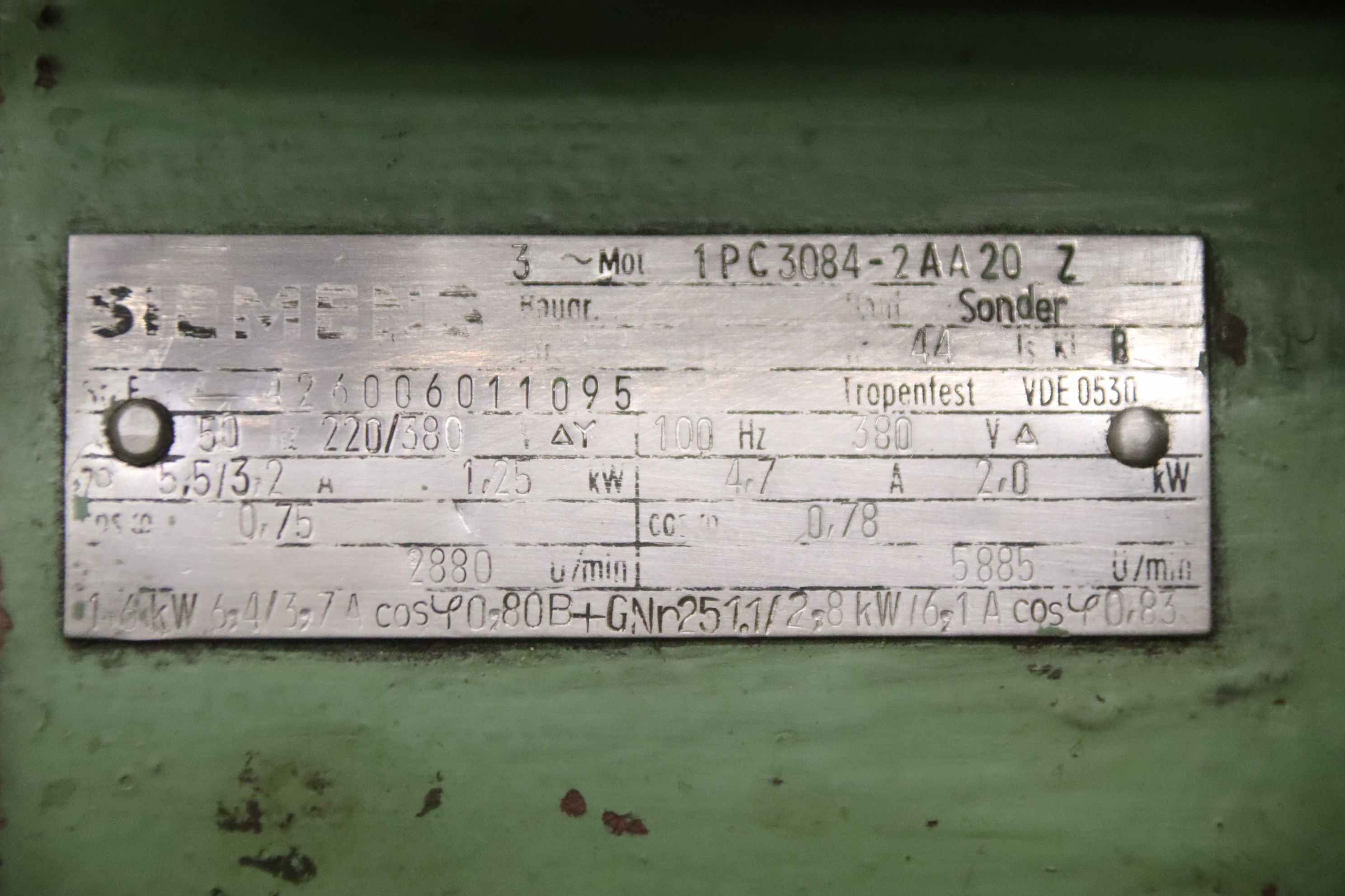 Double-end tenoner, edge processing machine, scoring motor, chipper motor, milling motor, spindle motor, electric motor-Manufacturer: Siemens, milling motor electric motor type 1PC3084-2AA20 Z-Power: 50 Hz 1.25 kW 2880 rpm / 100 Hz 2.0 kW 5885 rpm-Voltage: 220/380 V-Mounting shaft: Ø 30 mm-Quick clamping system: Leuco with saw blade Ø 200 x 3.2 mm-Dimensions: 390/300/H220 mm-Weight: 36 kg
