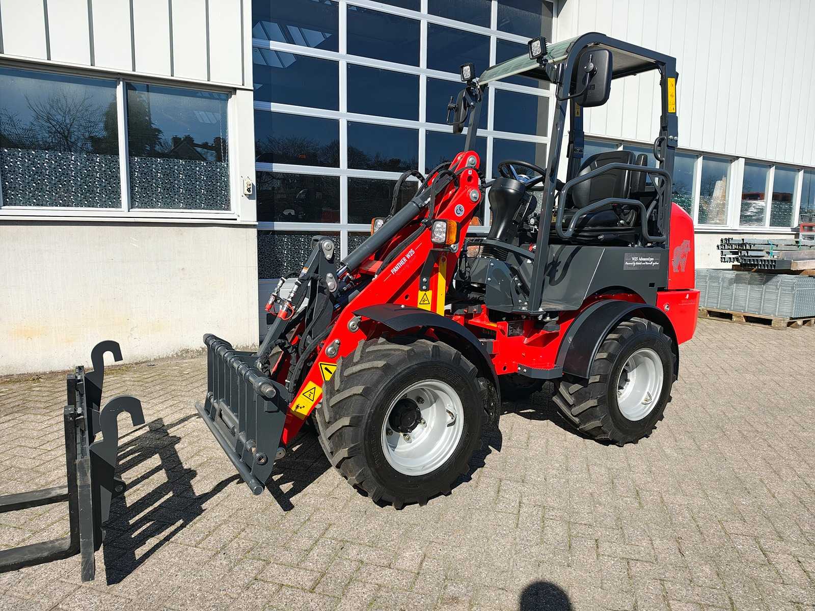 Miniloader powered with Kubota V1505 4 cylinder EURO5 diesel engine, water-cooled, 18.4KW, capacity 1,498 Liters, Advanced version; Hydraulics equipped with Rexroth plunger pump and Rexroth Travel motor, electronic control lever with soft operation and operation of several functions at the same time, Travel motor with 2 speed controls also operable on drive lever, LED work lights front and rear, Toyota adjustable and sprung seat with electronic sensor (switches off engine after 20 sec), Hydraulic quick couplings for fitting parts (euro connection), Cabin with heating and radio, LED work lighting. Lifting capacity 850 - 1250kg, Hydraulic tank 32 liters, fuel tank 30 liters, machine weight 2570kg, dimensions 3000x1500x2200mm. Incl. bucket and spoon board, unused machine Auction-ID: A1-40417-10