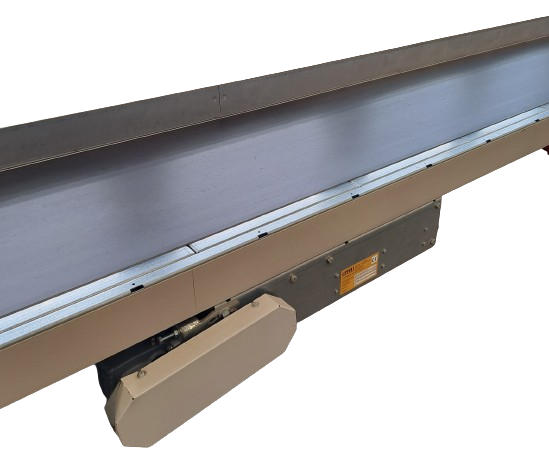 Transnorm conveyor belt GF 11380-600-500RA2095Technical data:Conveyor length (NL): 11380 mm frame width (NB): 600 mm, 700 mm with motorbelt width (GuB): 500 mmOverall height (BH): 80 mm, 430 mm with motor Supporting feet: optionally availableConveying speed (v m/s): Contact us and we will try to meet your preferred conveying speed.Drive: SEW gear motor, SA37/T DRS71M4/MM07/LNElectrical data: 50Hz V380-500, kW 0,75 S1Drive drum: Ø = 81 mmBelt return roller: Ø = 81 mmOptionally available:SupportsSide guide on one side and on both sidesFrequency converter for stepless speed change,13 - 32 m/minAdjust length (longer/shorter)Prices net plus VAT ex central warehouse Dr. Sonntag GmbH & Co KG, 97076 Würzburg, GermanyFeatures: Construction year: 2014condition: good (used)Conveying length in mm: 11380Nominal / outside width in mm: 600Belt width in mm: 500Driven: YESEngine type: SEW Eurodrive Ze ...