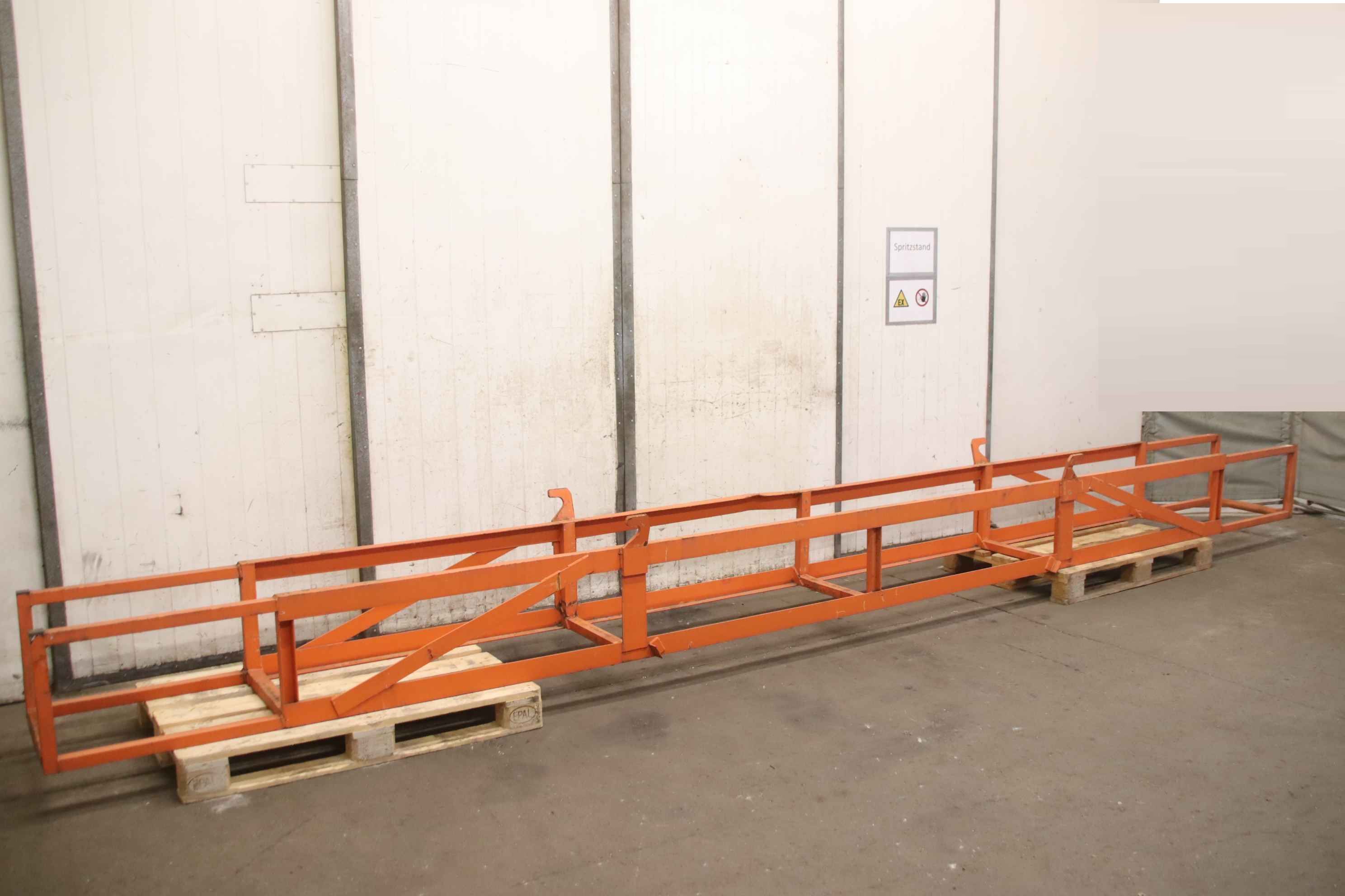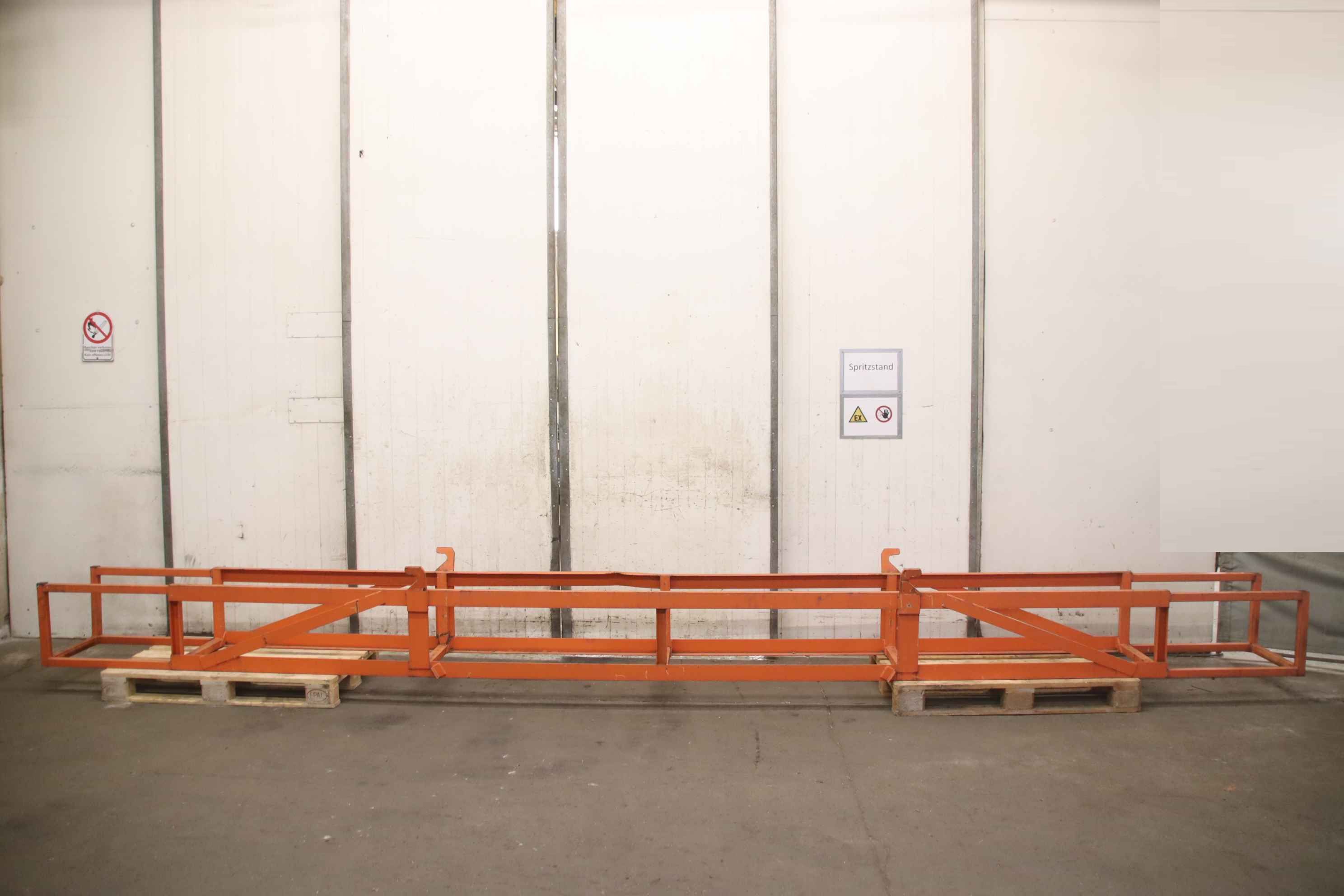 Storage containers, transport storage containers, long goods racks, long goods pallets -Long goods rack: Stackable long goods pallet, length 4920 mm -Crane eyes: 4 pieces -Number: 5x long goods racks available Price: per piece -Dimensions: 4920/640/H550 mm -Weight: 147 kg/unit