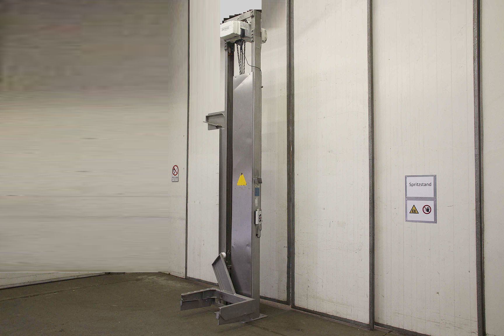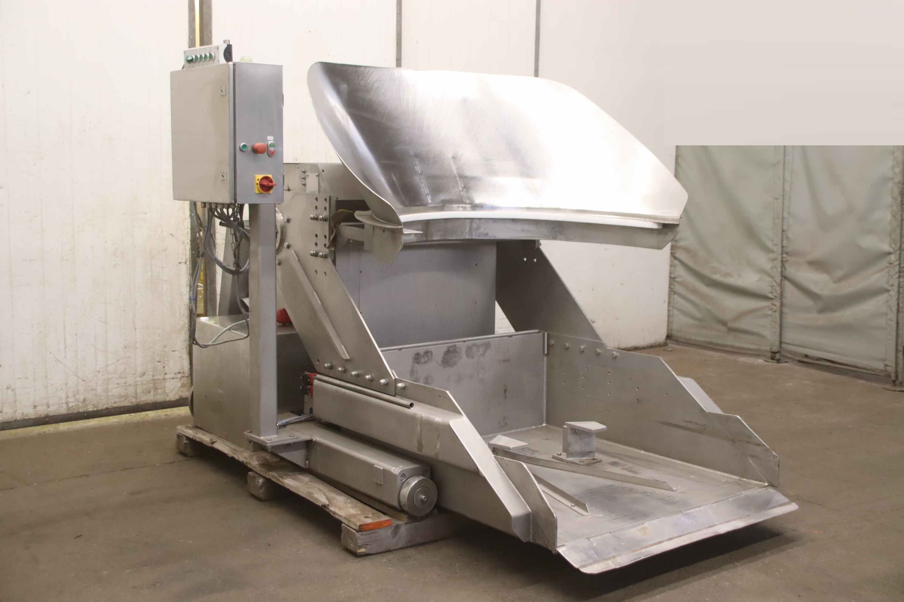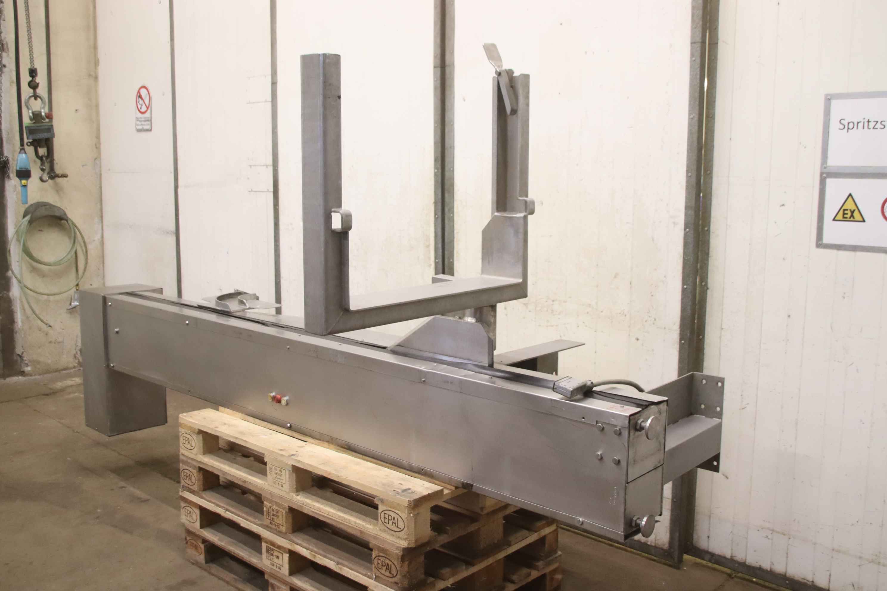 Swing loader, rotating and tipping frame, lifting tipper, forklift tipping container, tipping container, tipping skip, tipping device for loading trolleys, loading trolleys -Handover: in its current condition as inspected -Status: cannot be tested because no software has been programmed. -Tipping device: made of stainless steel -Ejection height: approx. 1600 mm -Use: for bakery products or the food industry -Individual components/dimensions: see photos, roller spacing 1640 mm -Dimensions: 2500/2000/H1720 mm -Weight: 1740 kg