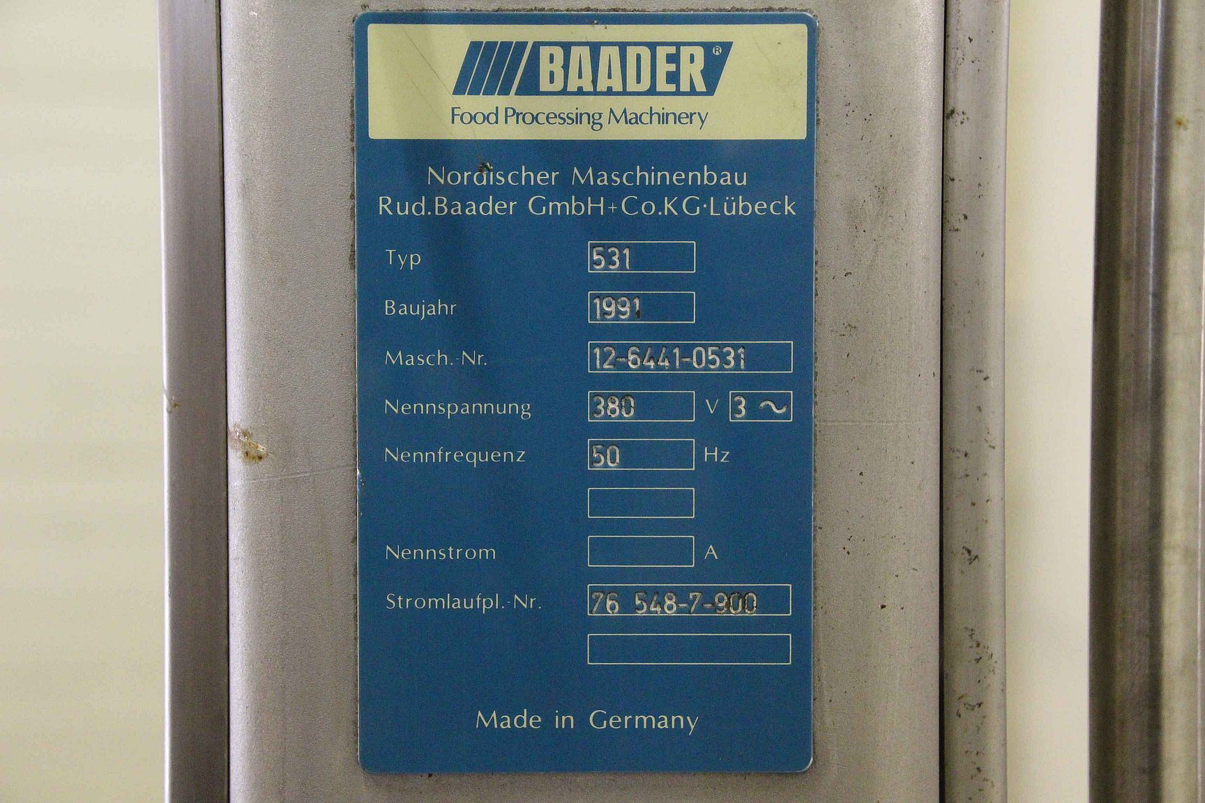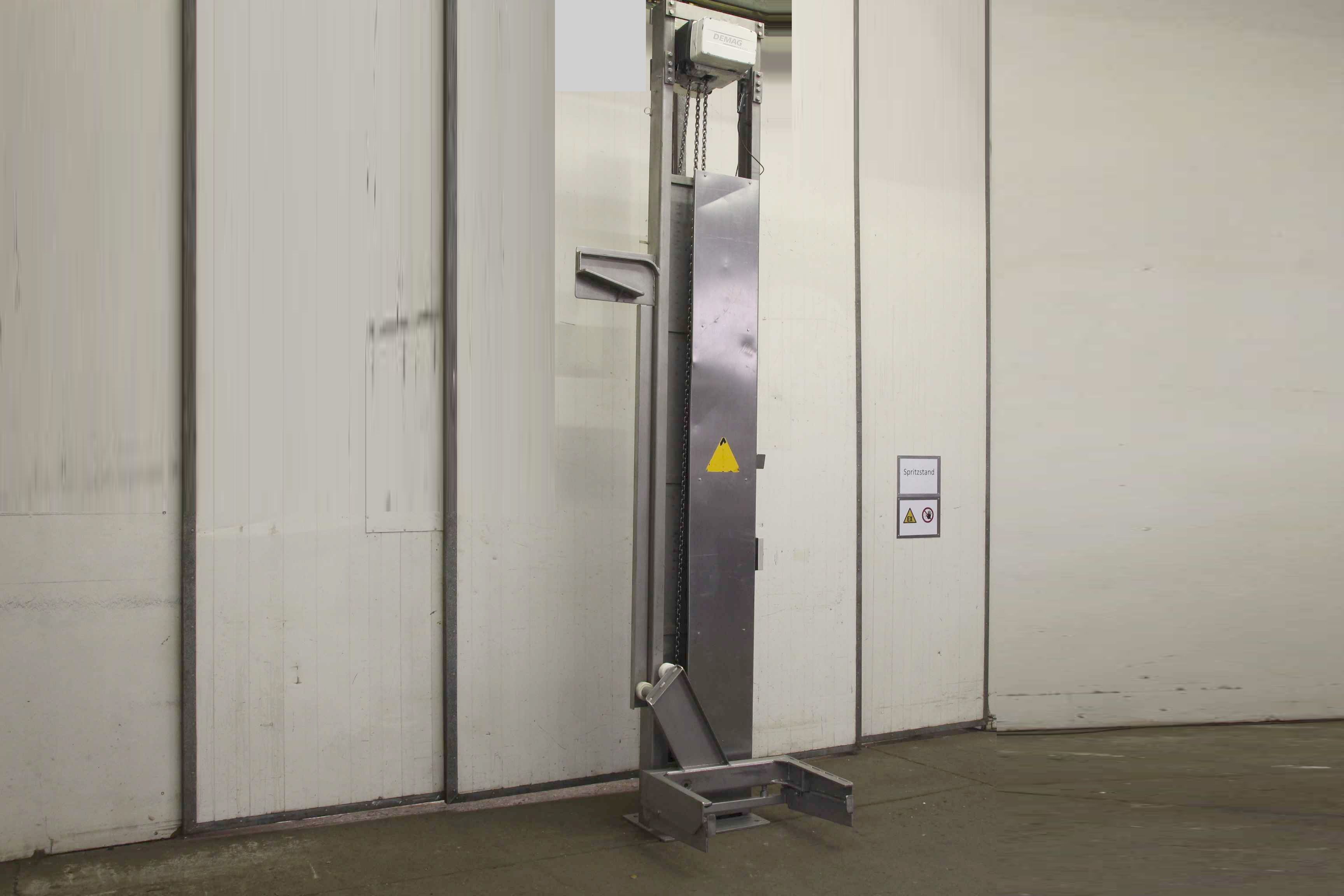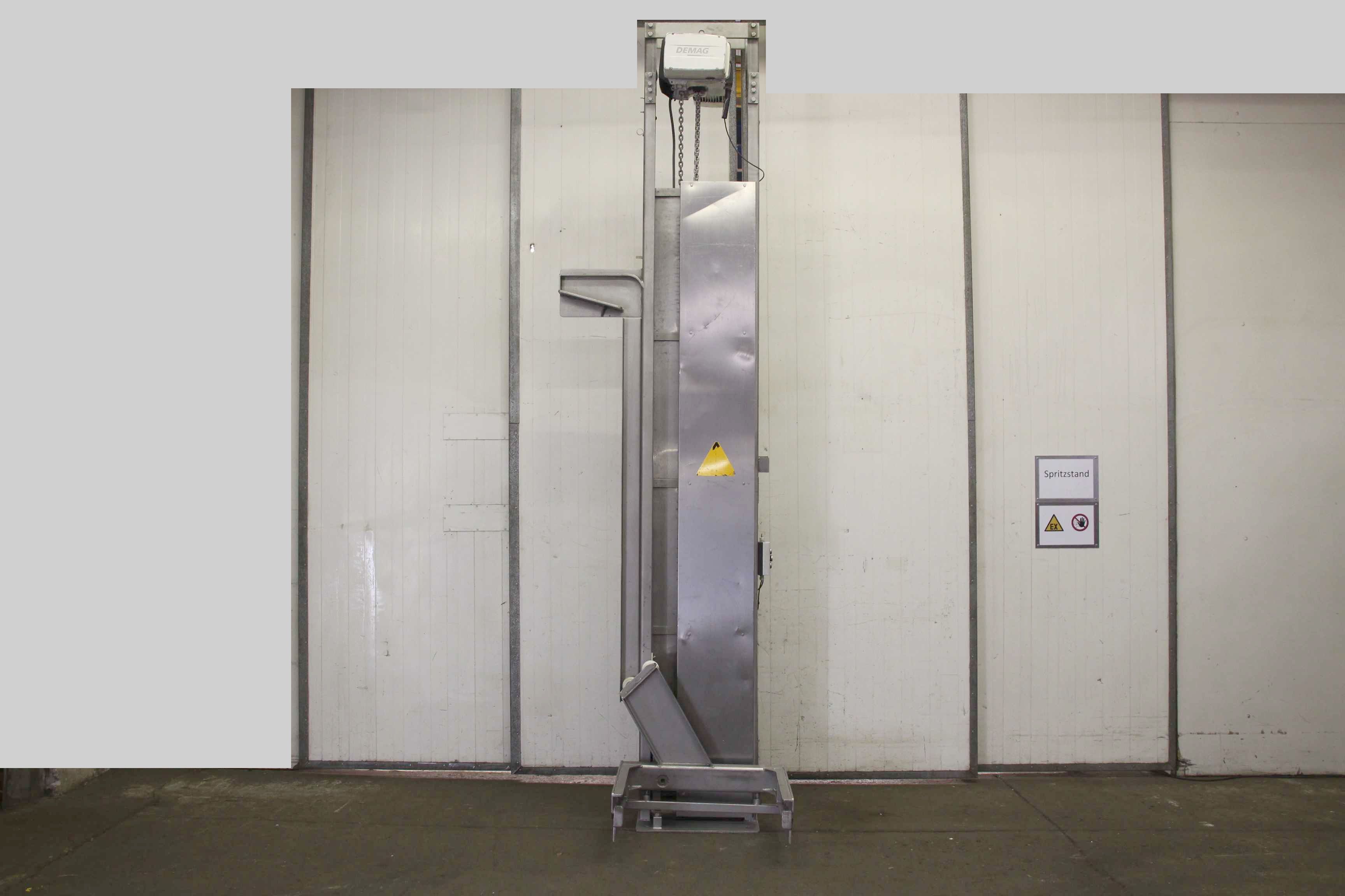 Lifting tipper, forklift tipping container, tipping container, tipping trough, forklift trough, -Body: made of stainless steel -Manufacturer BAADER Type 531 -Tilt height: 2500 mm (can be changed for an extra charge) -Max. tine width: 740 mm -Chain hoist: Demag, year of manufacture 2007 -Dimensions: 3800/890/H1060 mm -Weight: 326 kg -without documentation