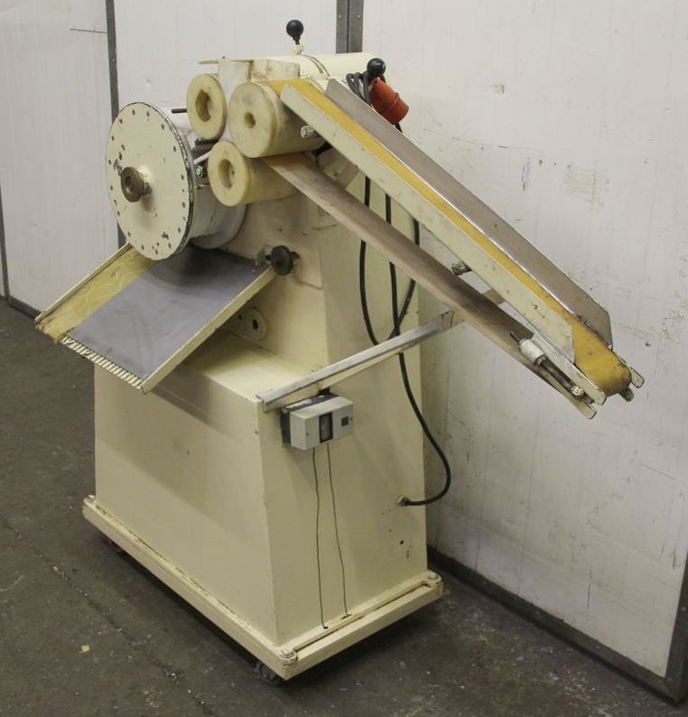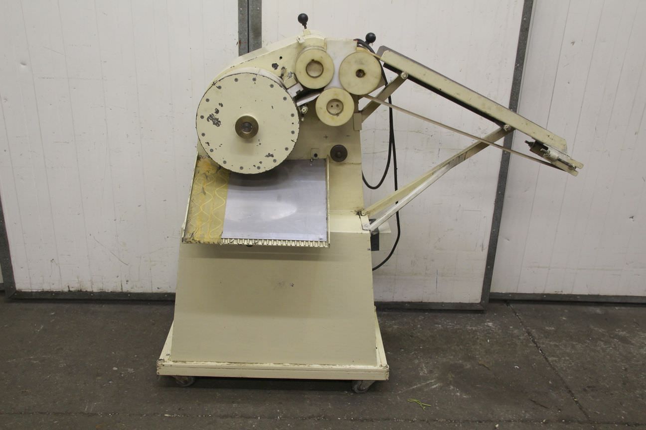 Dough rolling and shaping machine, combination rolling machine, rolling machine -Roll width: approx. 600 mm -Rolling thickness: from 0.3 - 30 mm -with round and long wire type: SR0 -flour container -16 A-CEE plug -Connection: 380 V, 0.75 kW -The rolling machine is mobile -Dimensions: 1900/1250/H1900 mm -Weight: 430 kg