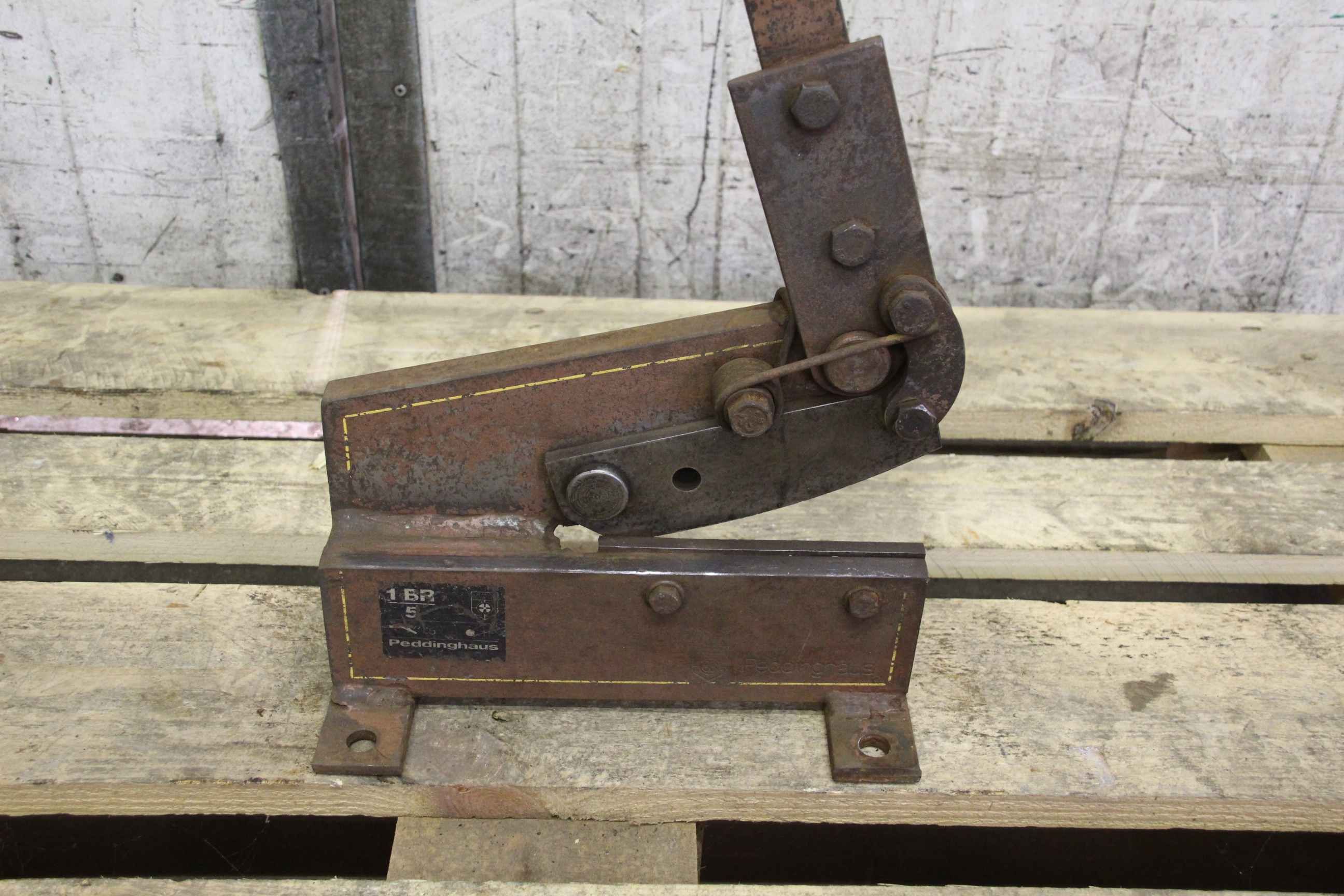 Hand lever shears, long-blade sheet metal and round steel shears, sheet metal shears -Manufacturer: Peddinghaus sheet metal and round steel shear type 1 BR 5 -Steel sheet: up to 5 mm -Round steel: up to 11 mm -Blade length: 150 mm -Lever arm with: safety spring -Quantity: 1x lever scissors available -Price: per piece -Dimensions: 275/100/H1180 mm -Weight: 11 kg/pc.