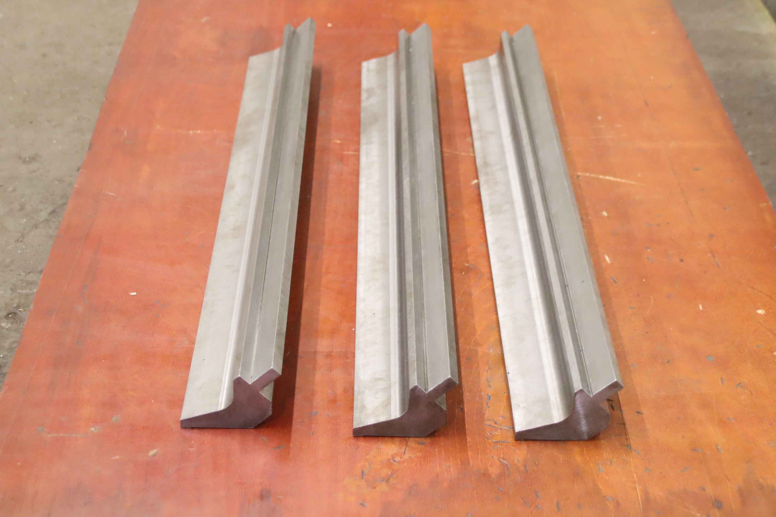 Bending tool, die, upper knife, upper tool, straight tool-Tool: for press brake, 3 parts-Tool angle: 90° / 3 mm flat-Dimensions: see drawing in the photos-Dimension: 75 x 119 mm-Total length: 2505 mm / 3 x 835 mm-Total weight: 63.2 kg