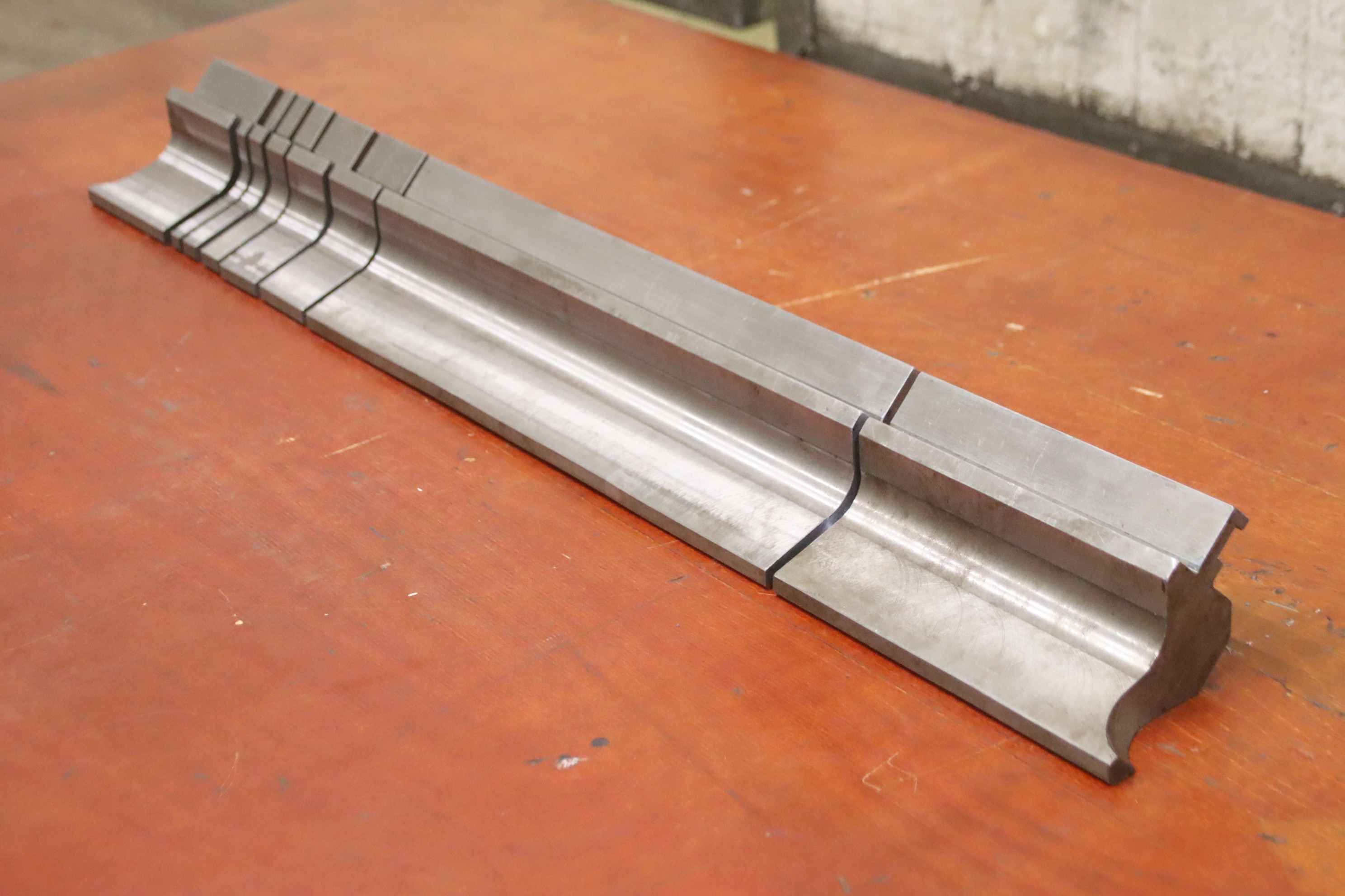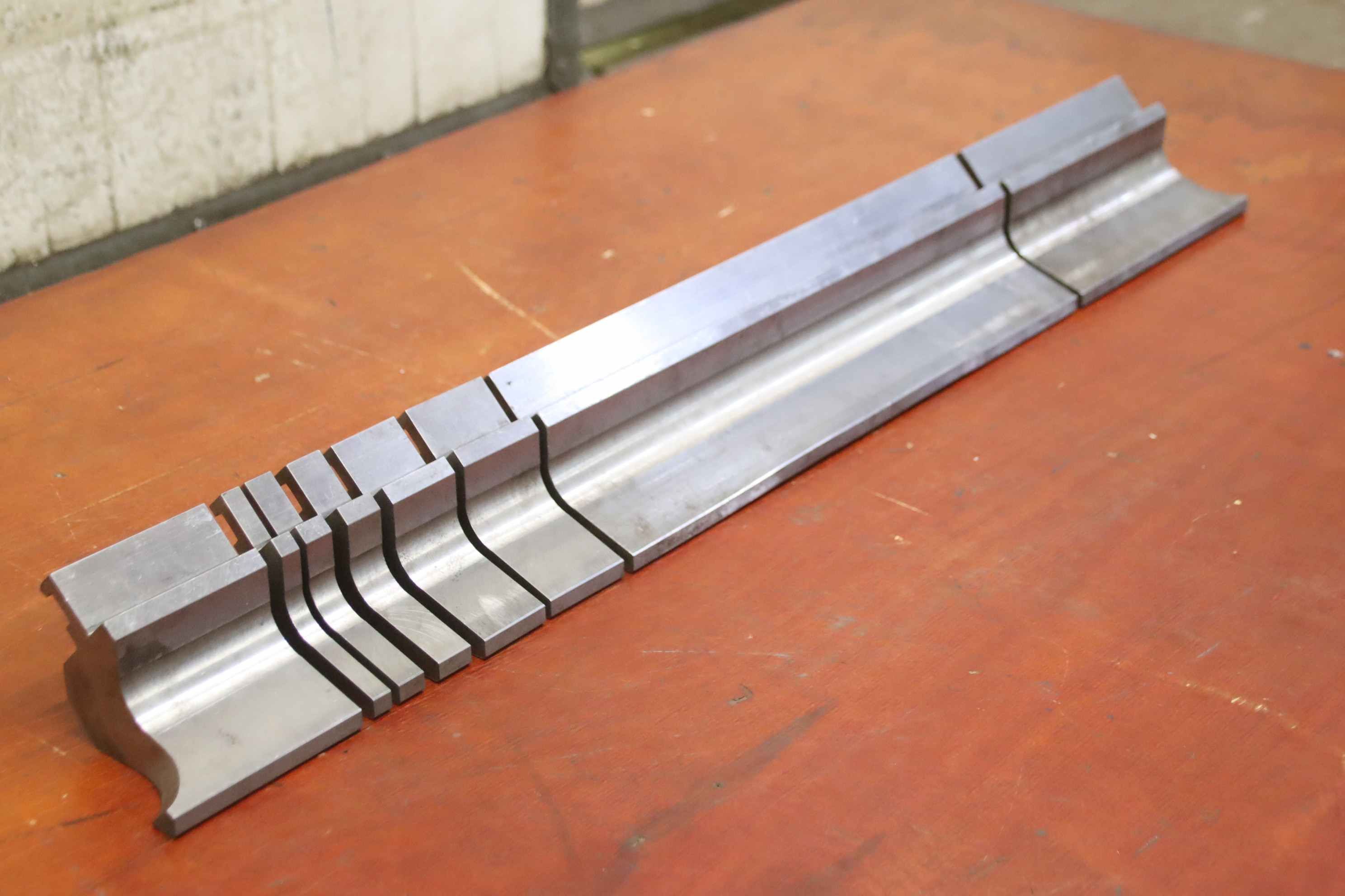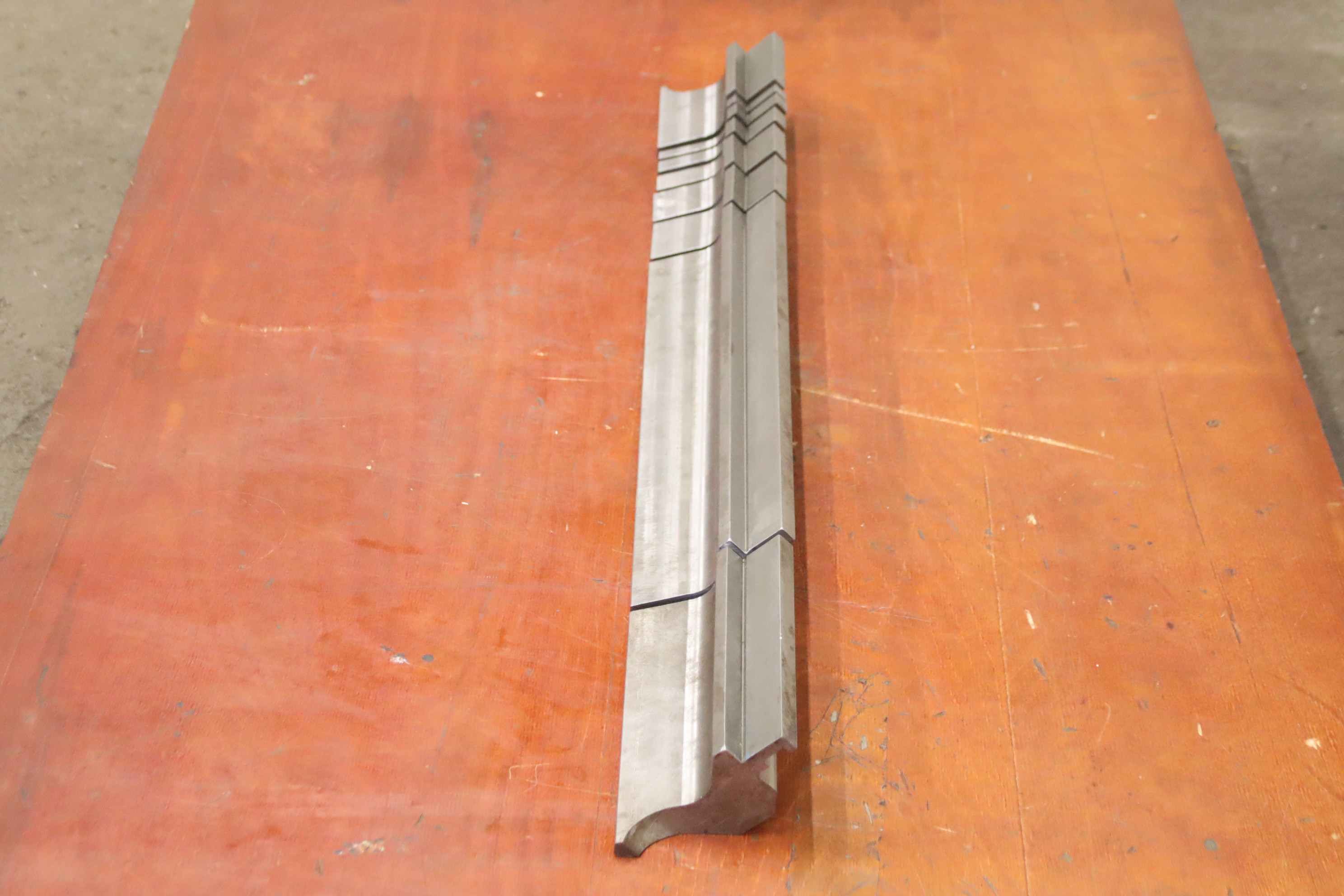 Bending tool, die, upper knife, upper tool, straight tool-Tool: for press brake, 8 pieces-Tool angle: 90° / 3 mm flat-Dimensions: see drawing in the photos-Dimension: 80 x 119 mm-Total length: 835 mm / 1x 400/200/100/50/40/20/15/10 mm each-Total weight: approx. 22 kg