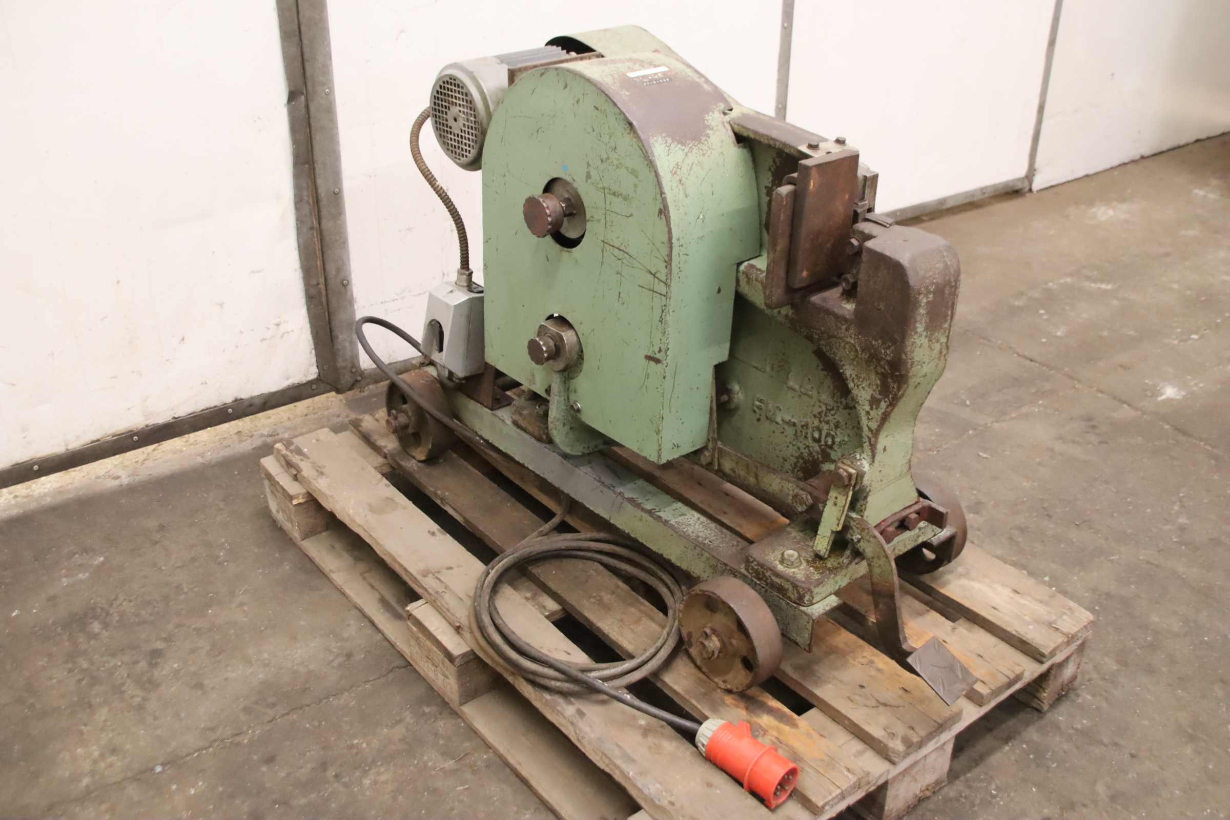 Reinforcing steel shear, reinforcing steel cutting machine, construction steel shear, profile shear, punch, punching machine -Manufacturer: L & L, steel shear with chassis -Type: FM1001 -Drive: 1.5 kW motor -Cutting width: 20 mm -Cutting height: 100 mm -Dimensions: 1160/500/H765 mm -Weight: 334 kg