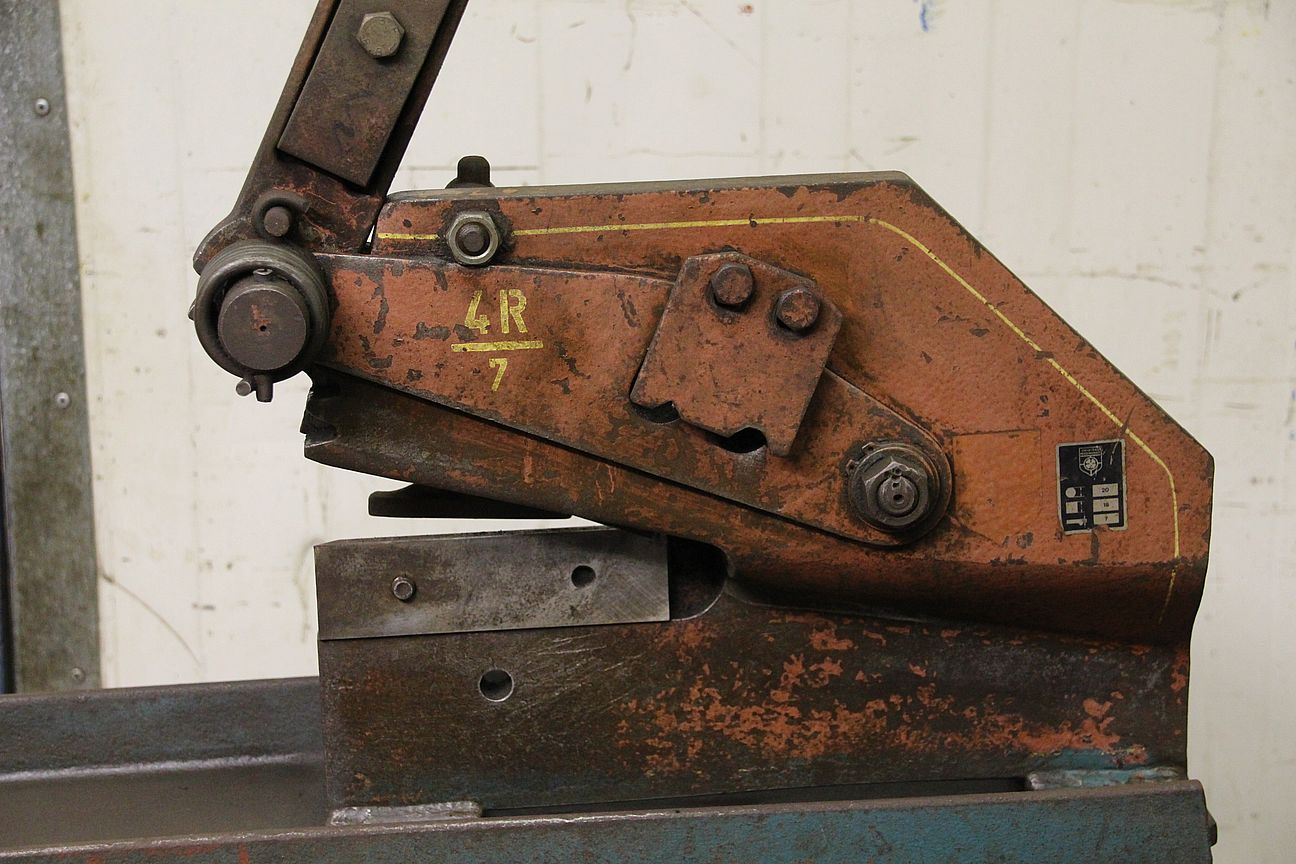 Hand lever shears, long-blade sheet metal and round steel shears -Peddinghau:s 4R/7, long-blade sheet metal and round steel shears -Particularly stable scissor body made of: tempered steel -Lever arm with: safety spring -Infinitely adjustable: hold-down device -Steel sheet up to: 7 mm -Round steel up to: 20 mm -Square: 18 mm -Cutting length up to: 170 mm -Performance rating for: Material with a strength of 450 N/mm² -Dimensions: 770/650/H2250 mm -Weight: 91 kg