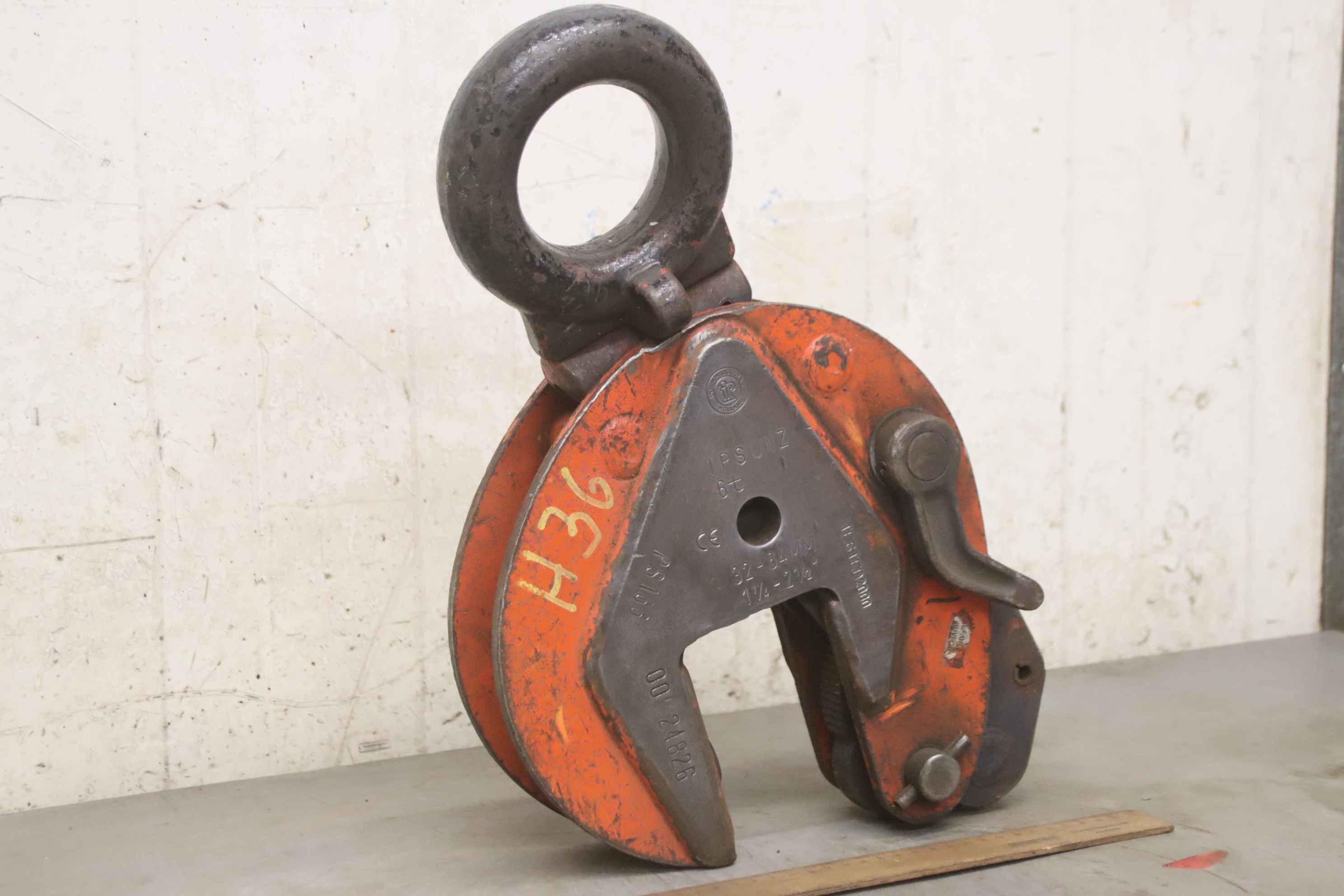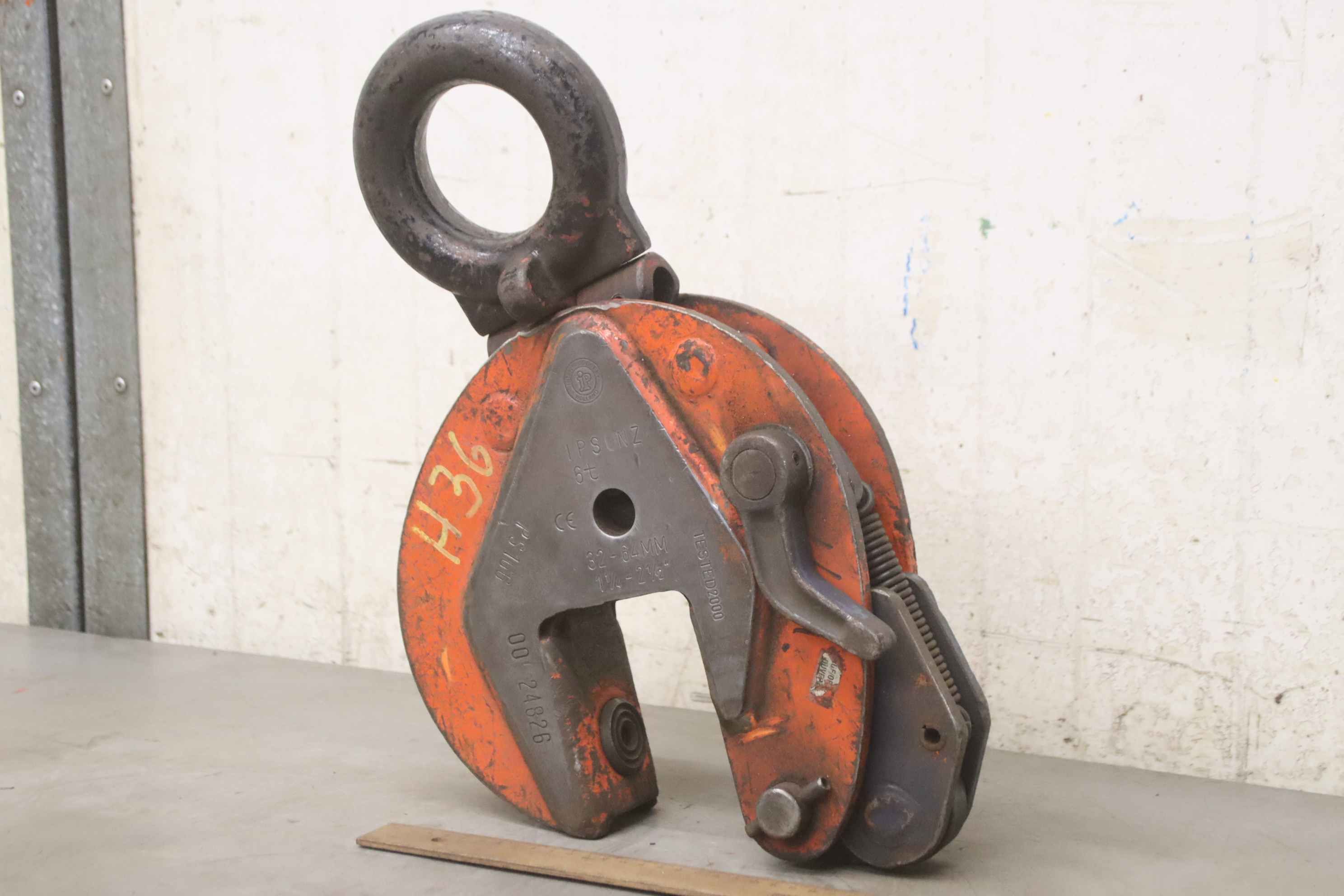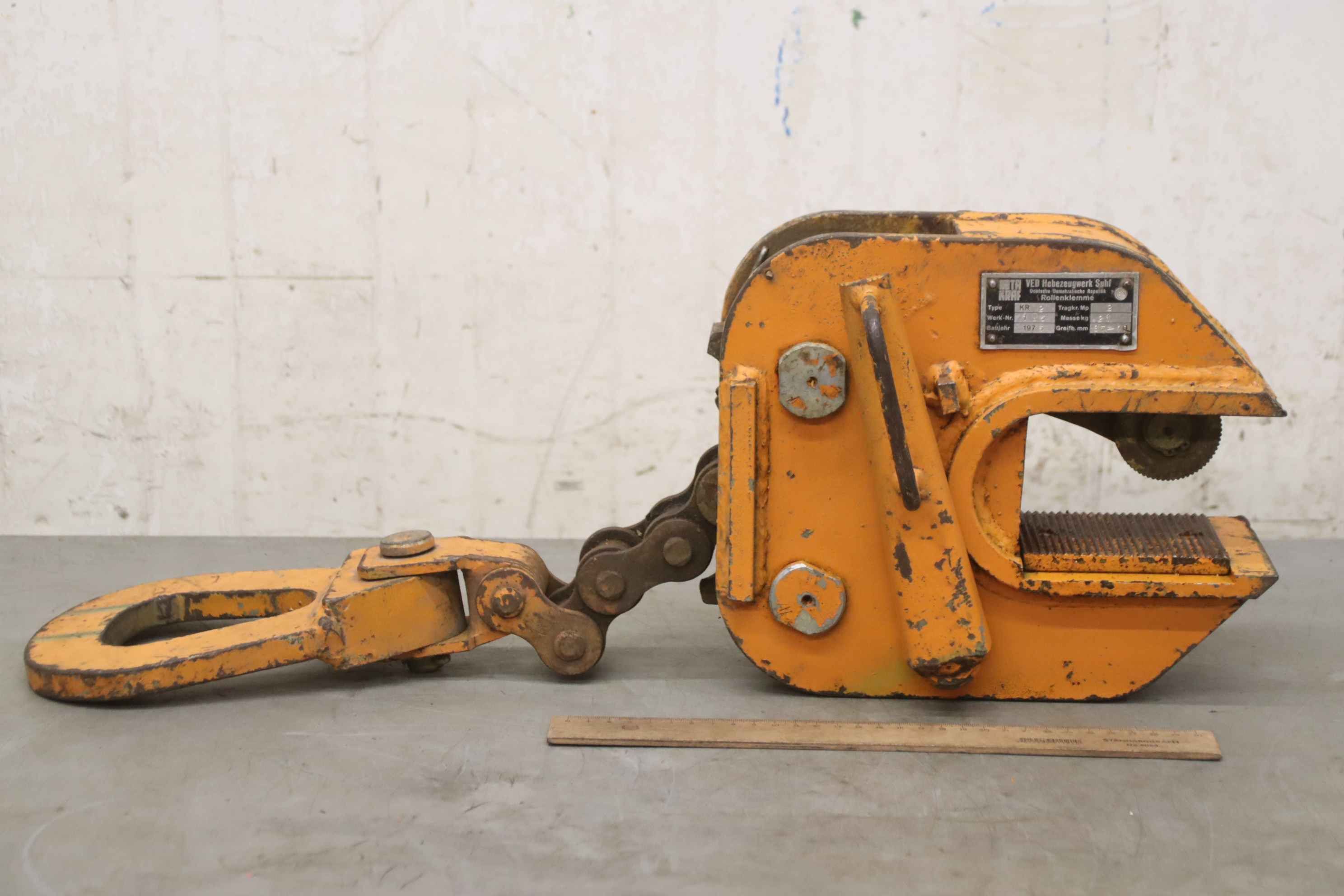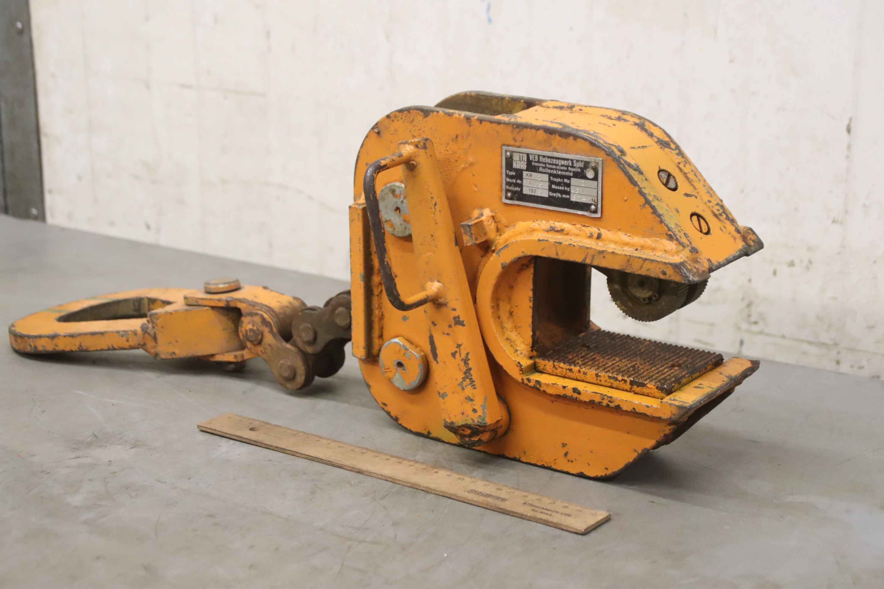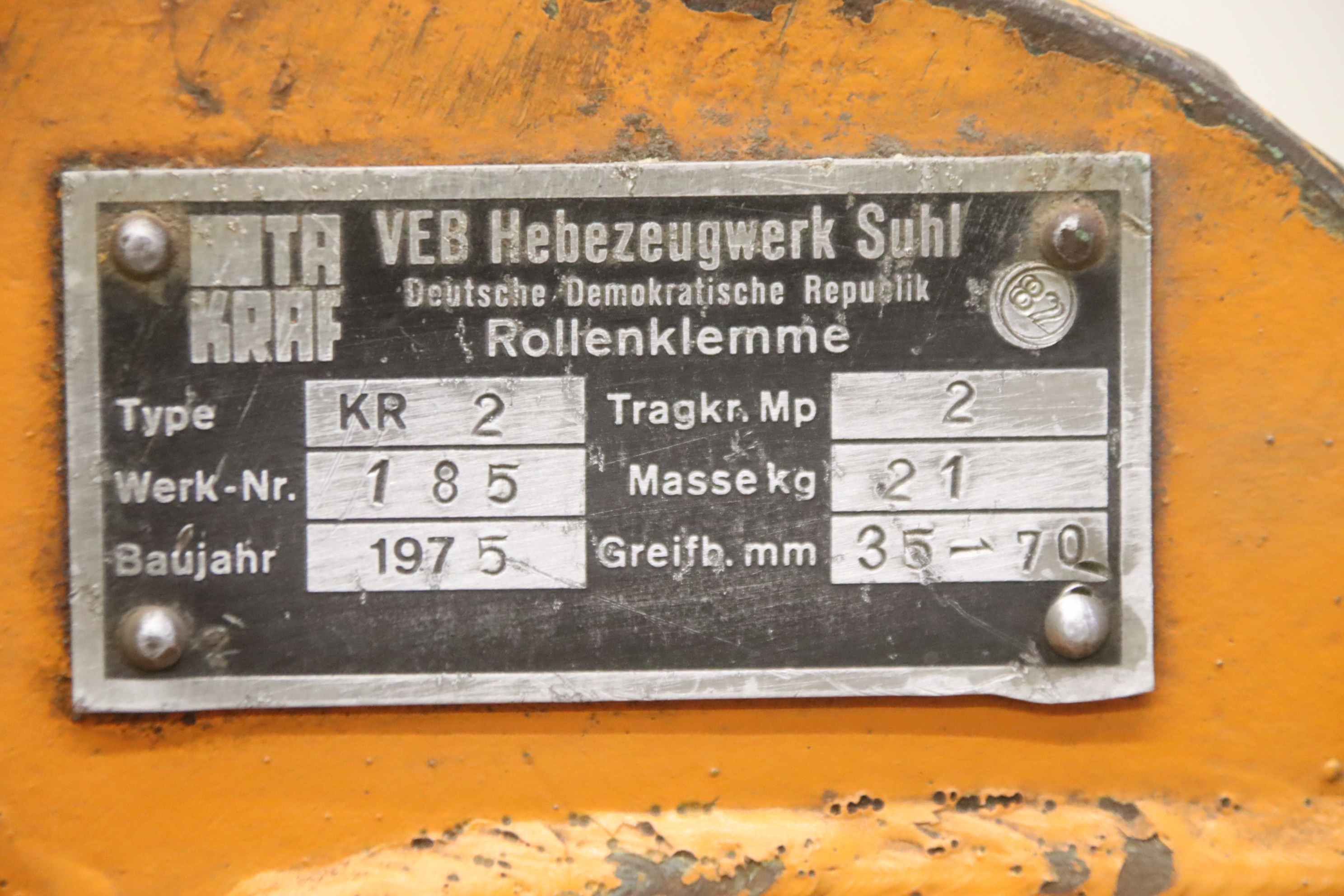 Beam claw, sheet metal clamp, sheet metal claw, beam clamp, sheet metal gripper, material gripper, material gripper, plate gripper, lifting claw, lifting clamp, lifting clamp, crane clamp, roller clamp-Manufacturer: VEB TAKRAF, roller clamp type WSI-Clamp range: 35-70mm-Load capacity: 2000 kg-Dimensions: 620/210/235 mm-Weight: 21 kg