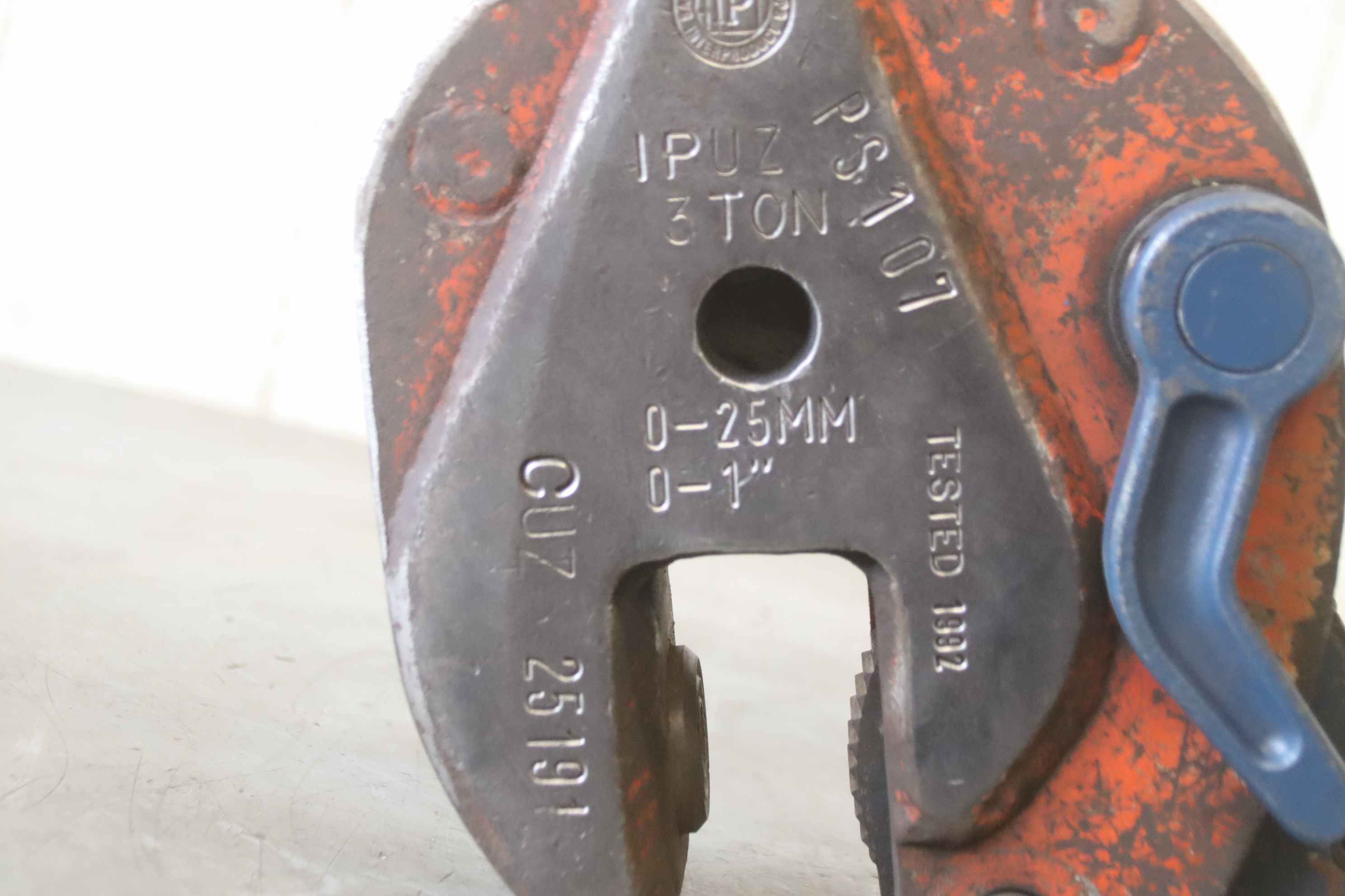 Beam claw, sheet metal clamp, sheet metal claw, beam clamp, sheet metal gripper, material gripper, material gripper, profile steel tongs, plate gripper, lifting claw, lifting clamp-Manufacturer: ip, safety lifting clamp type IPUZ with swiveling support ring-Clamping range: 0 - 25 mm-Load capacity: 3 t-Number: 1x terminals available-Price per piece-Dimensions: 230/90/H380 mm-Weight: 16 kg/pc.