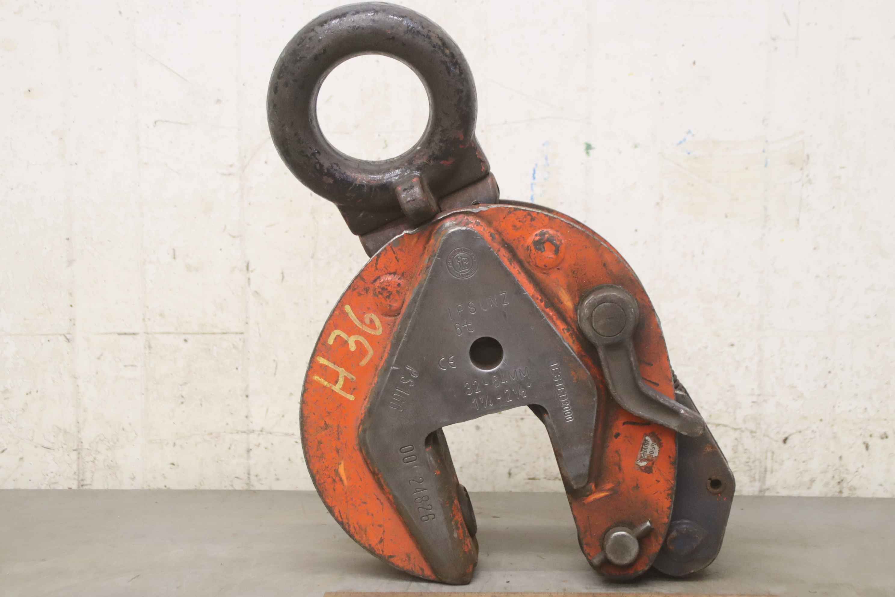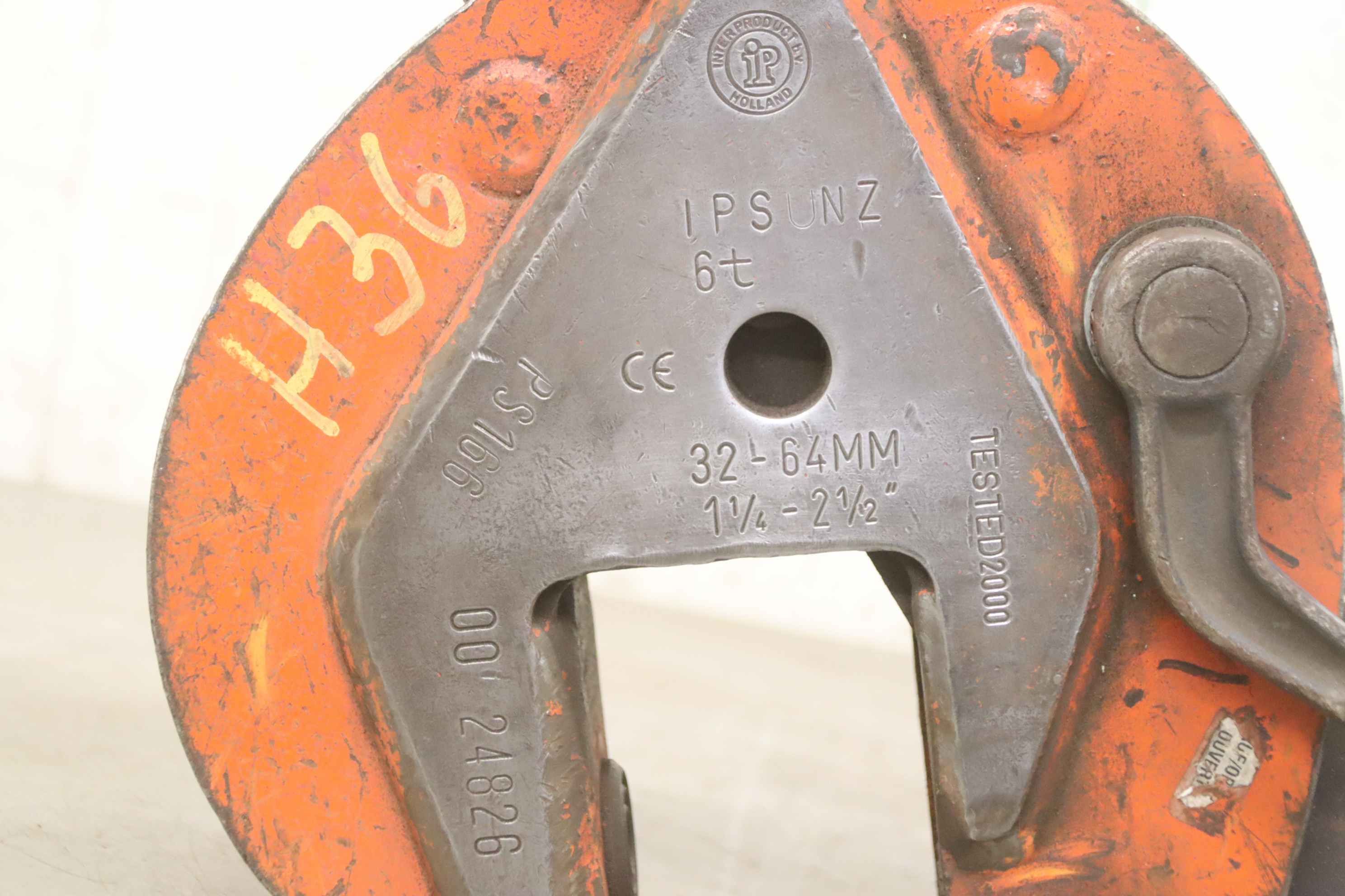 Beam claw, sheet metal clamp, sheet metal claw, beam clamp, sheet metal gripper, material gripper, material gripper, profile steel tongs, plate gripper, lifting claw, lifting clamp-Manufacturer: ip, safety lifting clamp type IPSUNZ 6t with swiveling support ring-Clamp range: 32-64 mm-Load capacity: 6 t-Number: 4x clamps available-Price per piece-Dimensions: 310/100/H420 mm-Weight: 24 kg/pc.