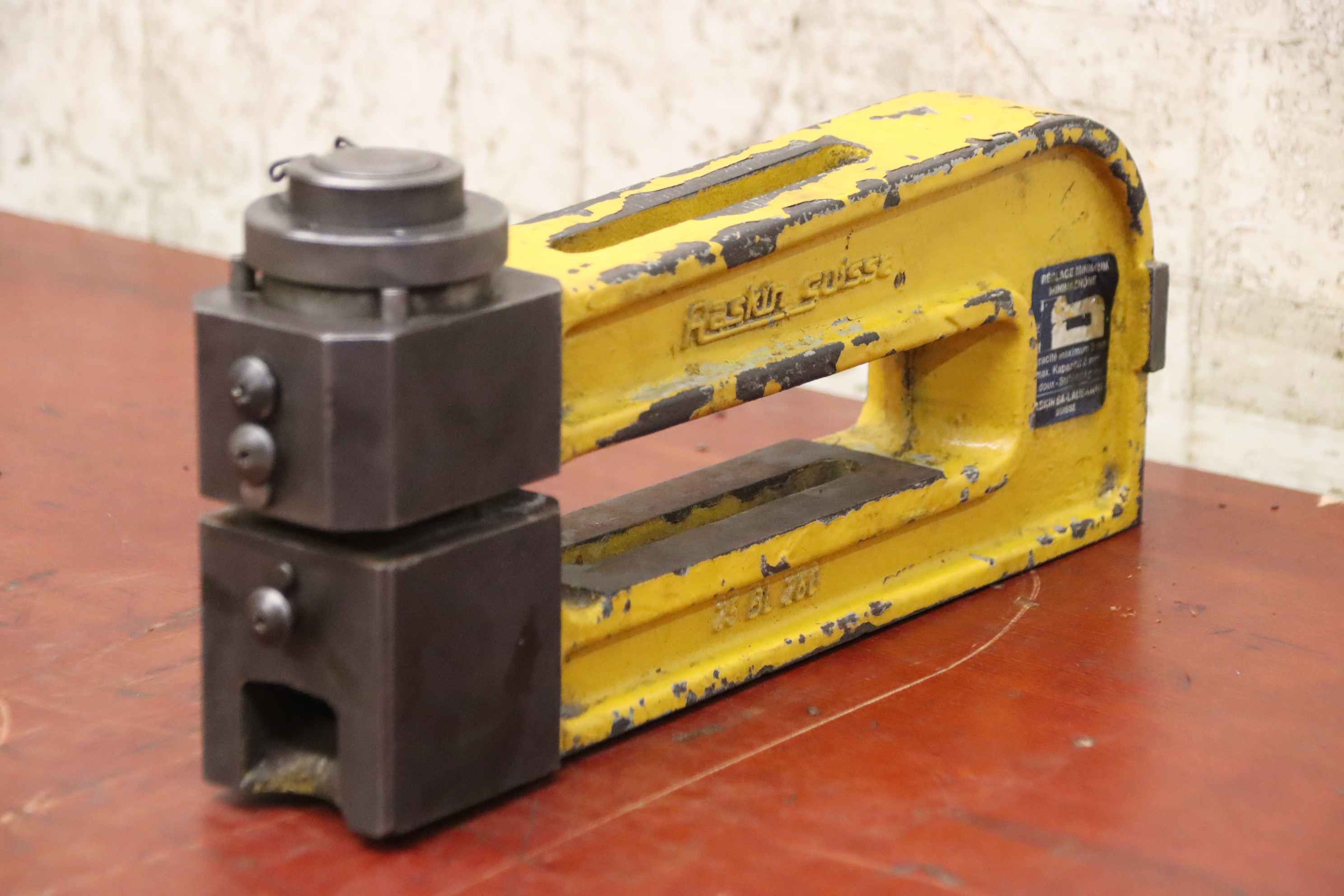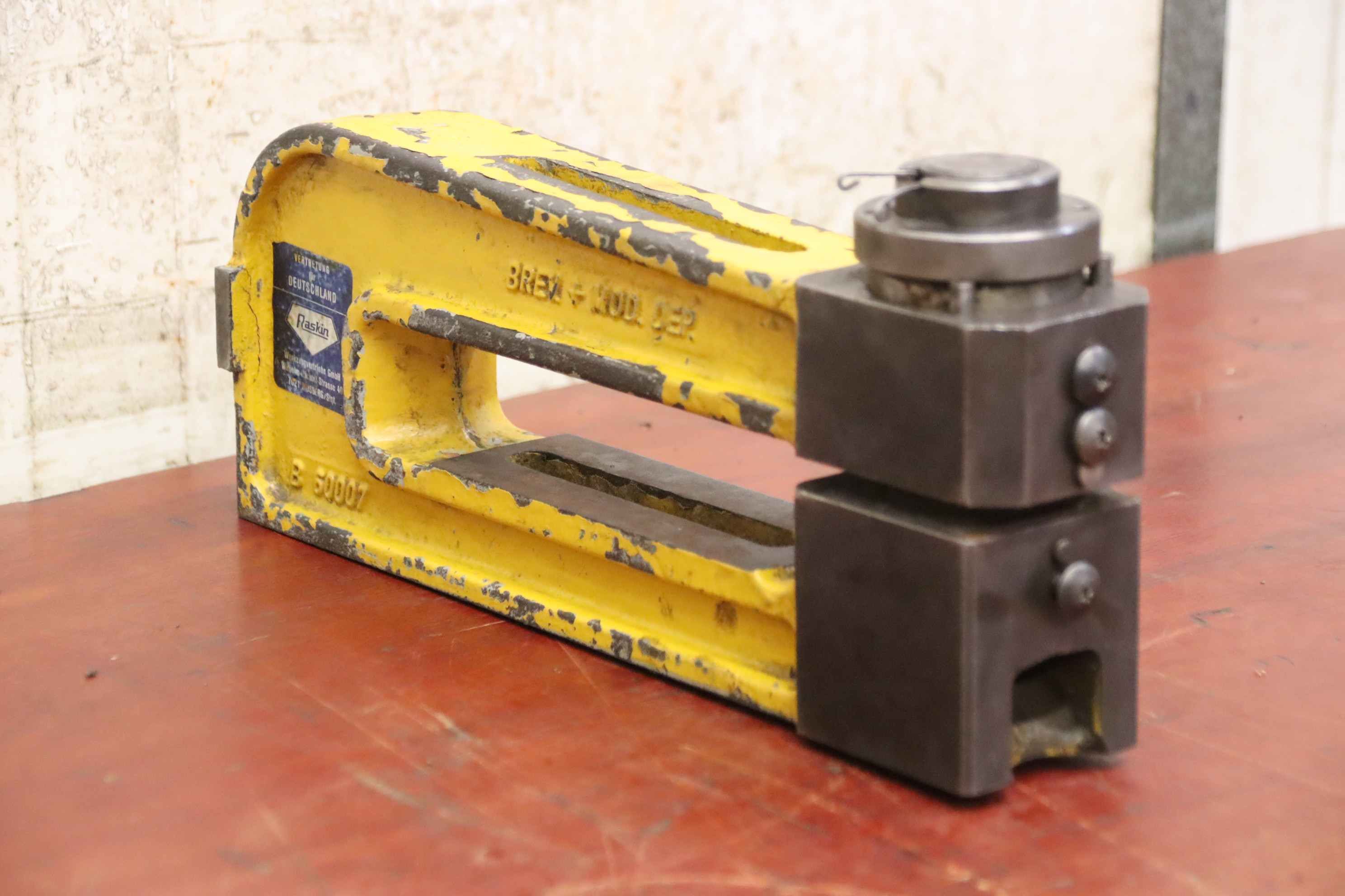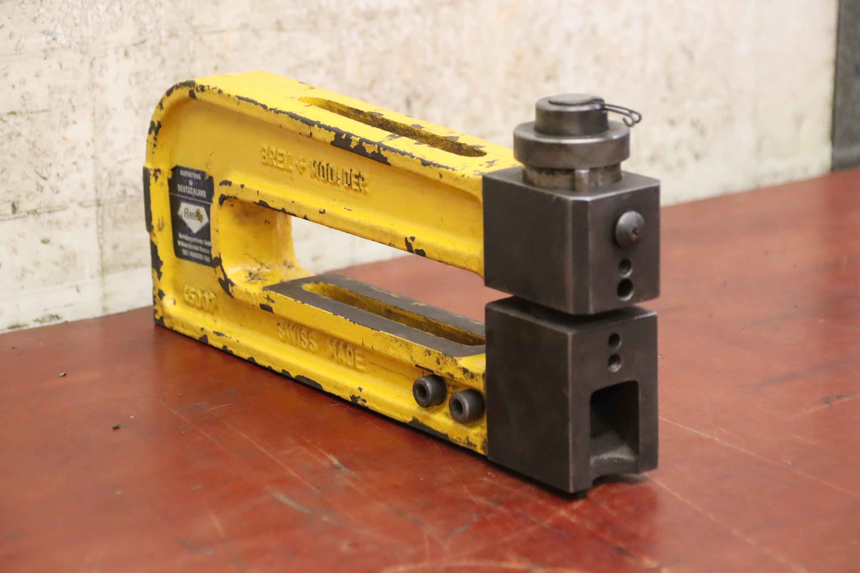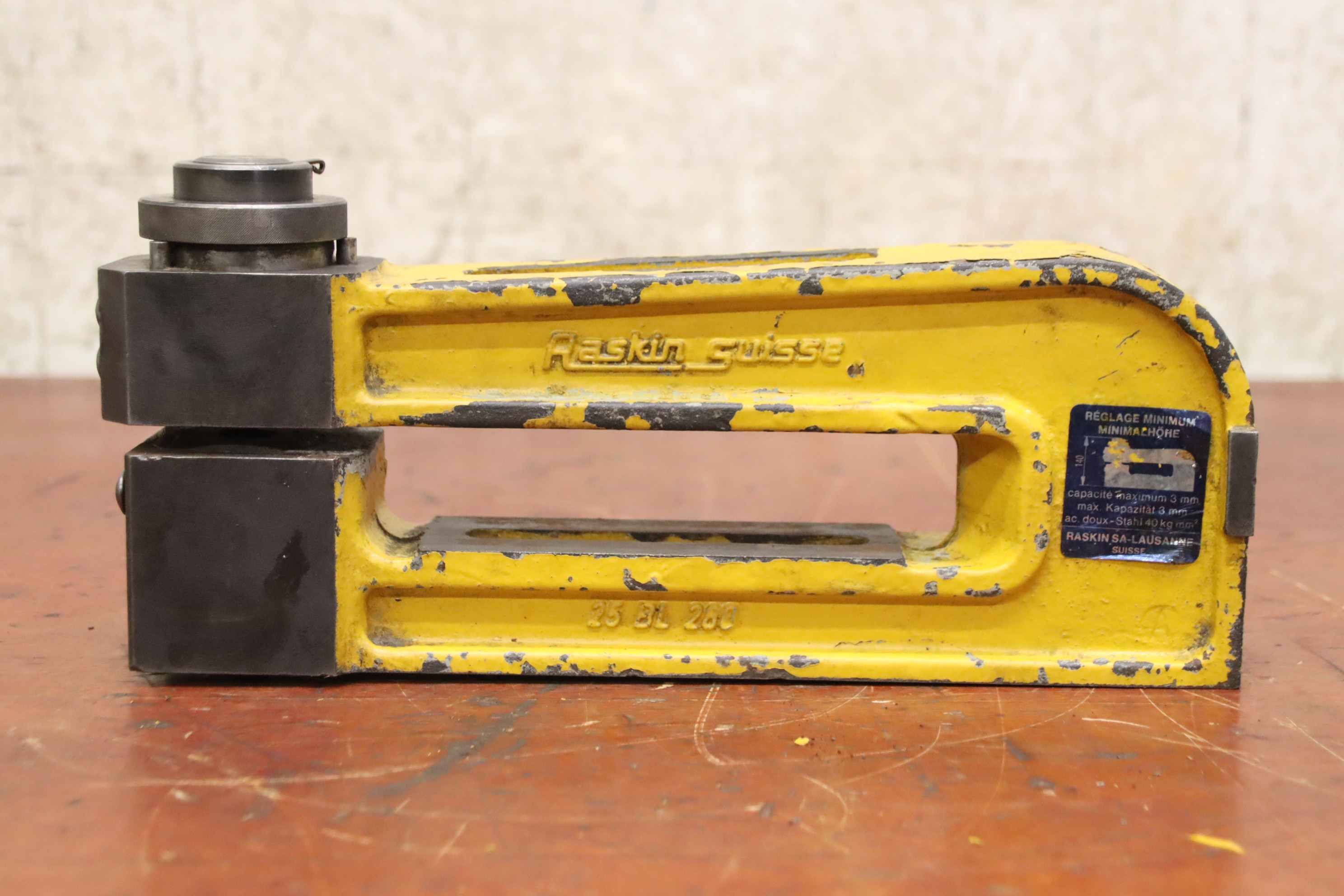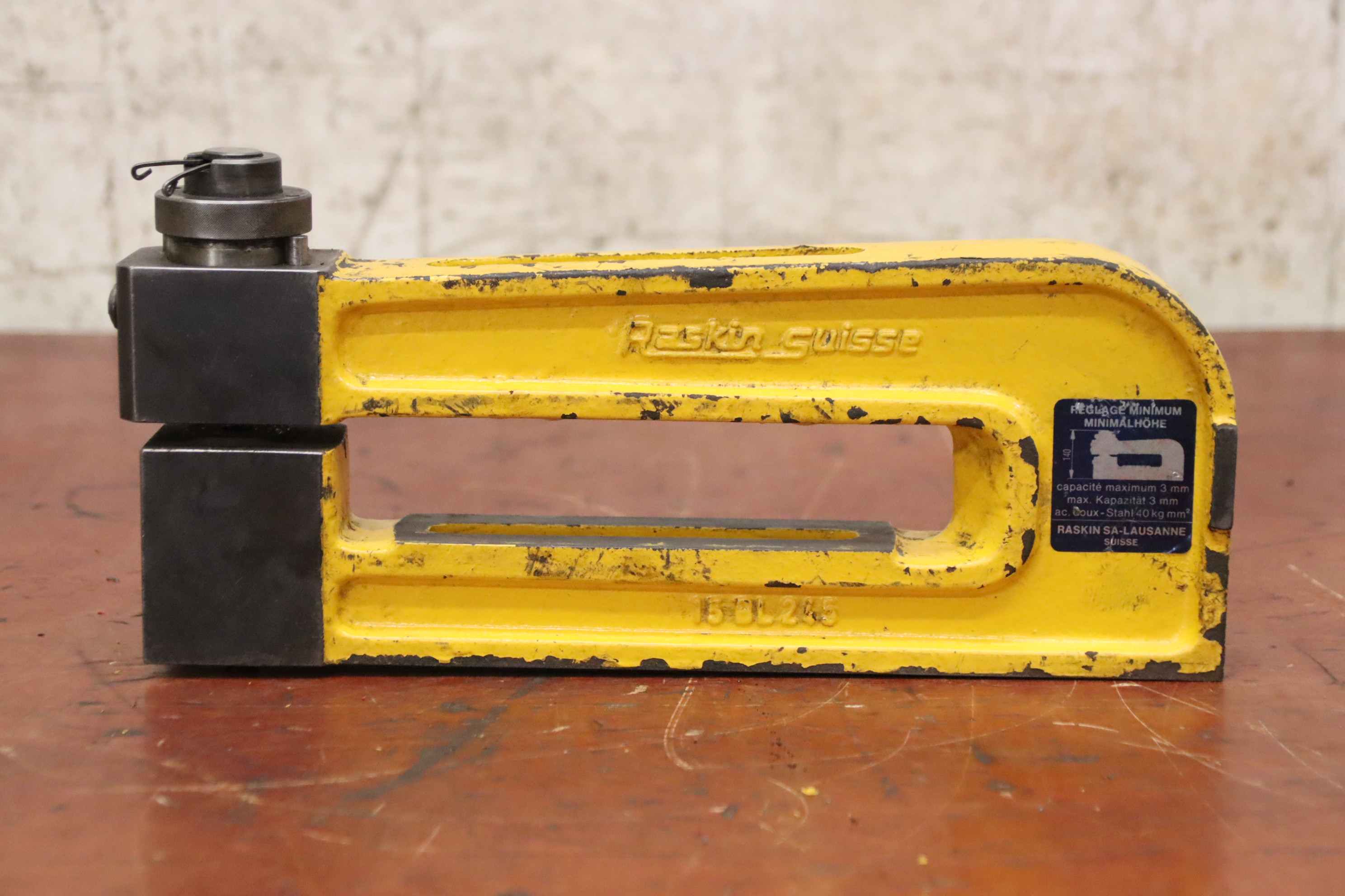 Punching units, punching unit, punching bracket, punching tool, non-driven clinking and shearing units, forming bracket-Manufacturer: Raskin, punching bracket type 15 BL 245 with punching tool-Throat: 210 mm-Punching capacity: 3mm-Matrix: Ø 34 mm-Punching tool: Ø 10 mm-Dimensions: 320/45/H150 mm-Weight: 6.8 kg