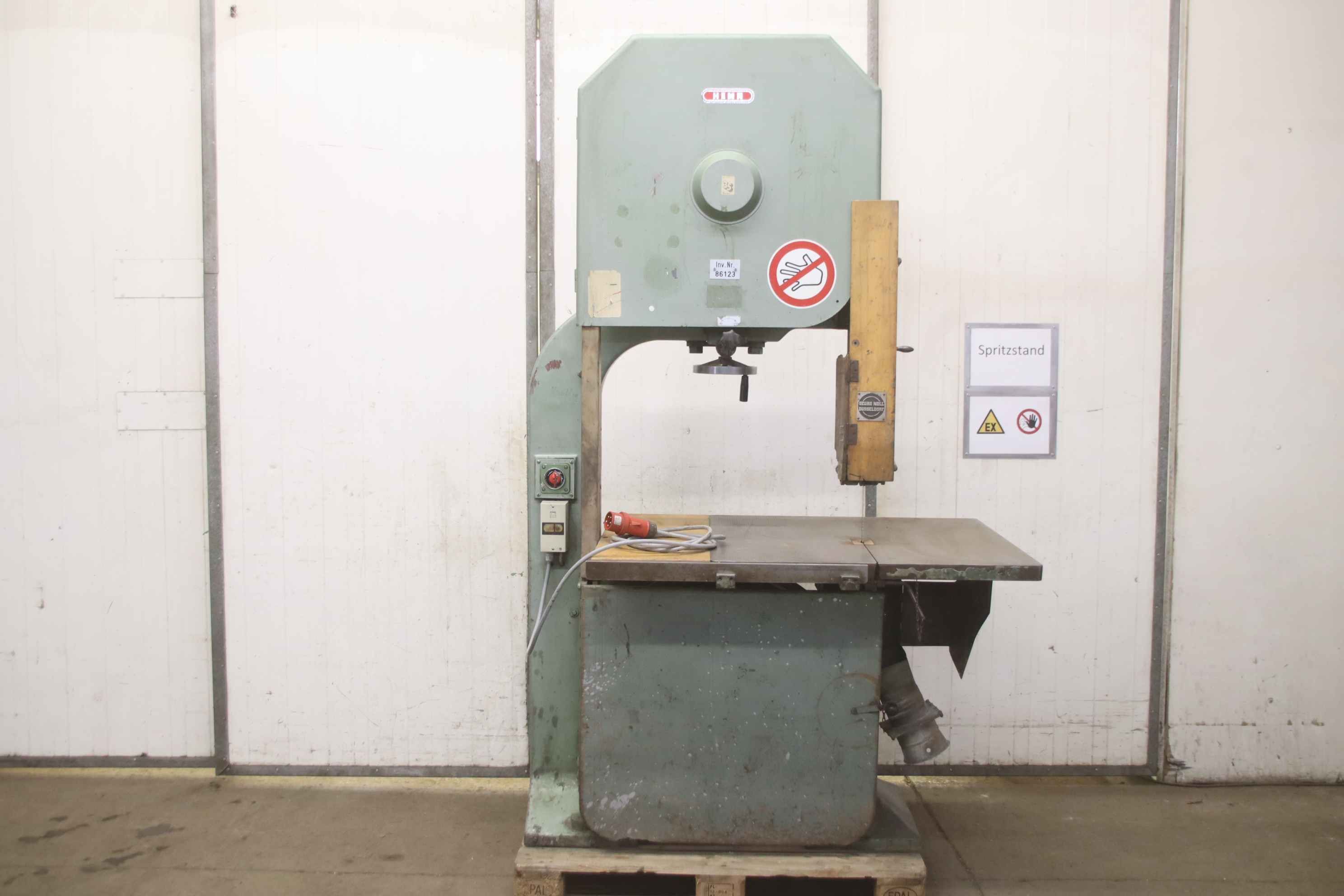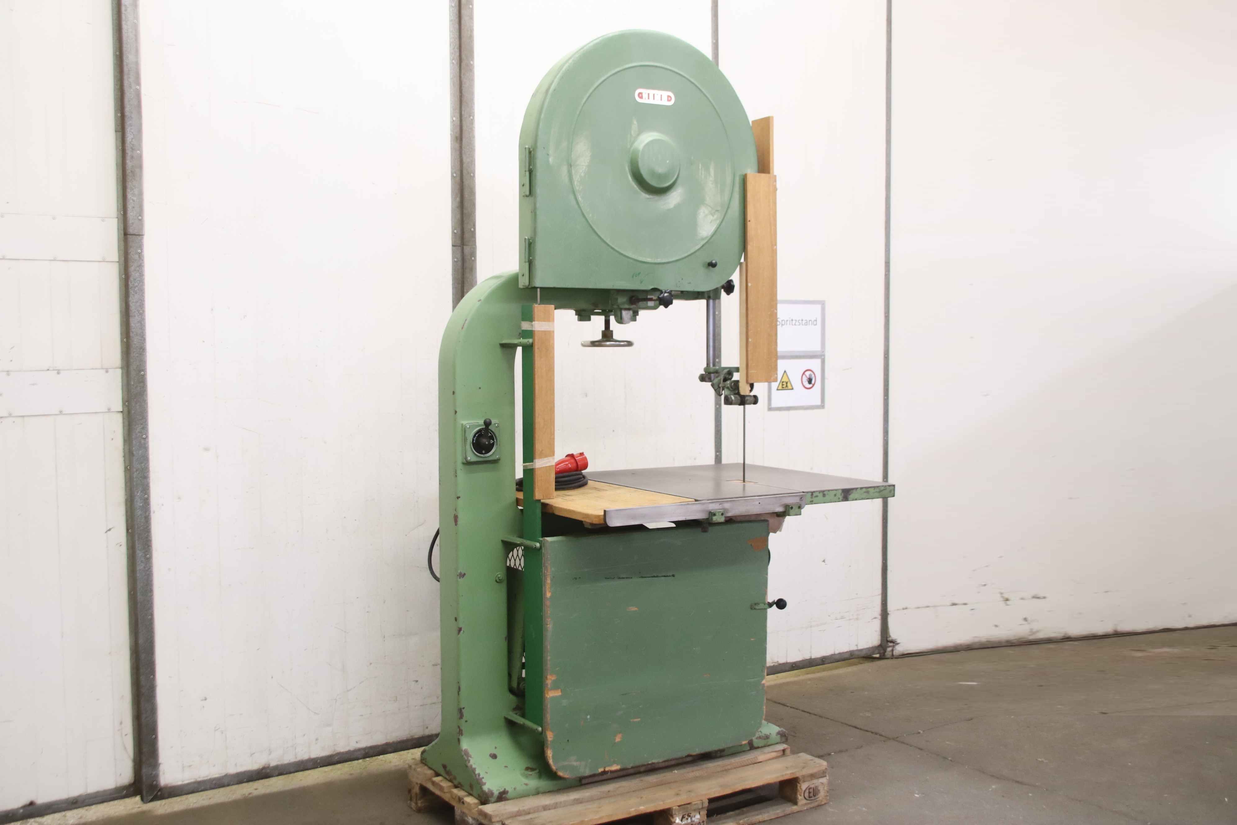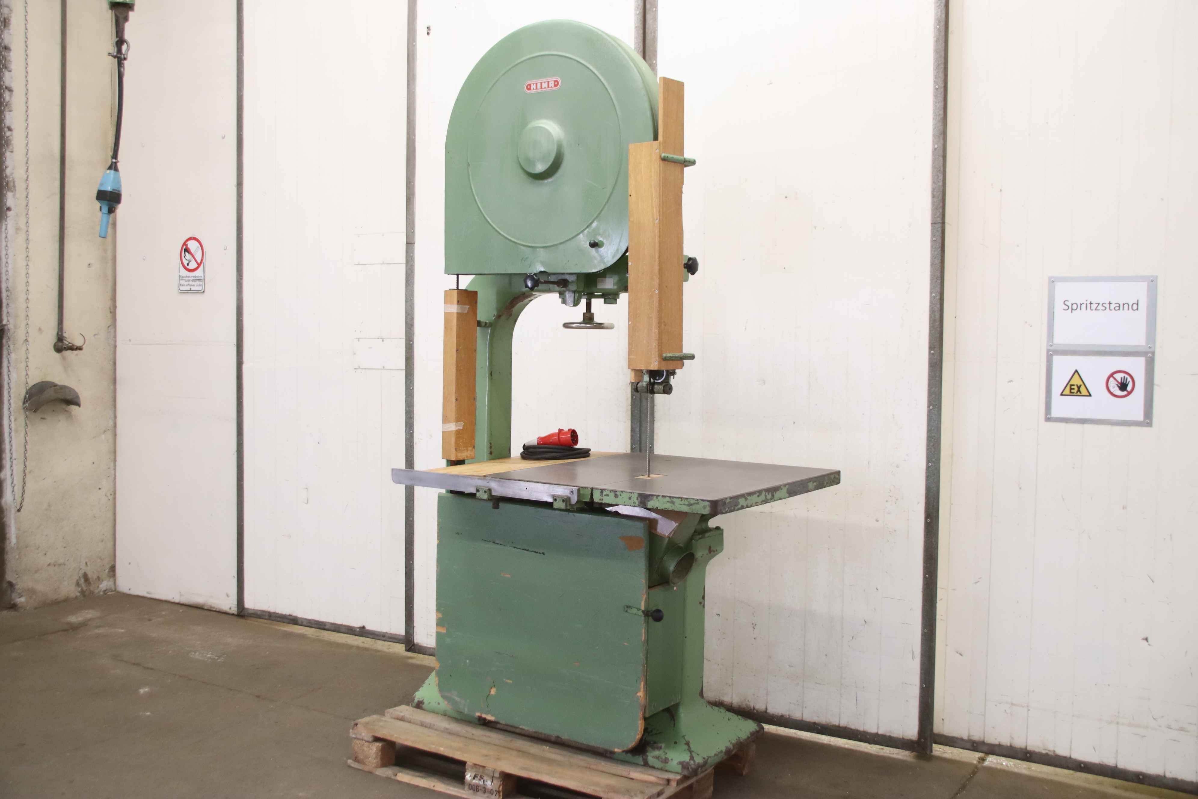 Wood band saw, band saw machine, band saw, vertical band saw-Manufacturer: Hema Paul and Gotthilf Heermann, vertical band saw-Type: unfortunately without type designation-Drive: 4 kW-Cutting width: max.770 mm-Cutting height: max.400 mm-Saw band: length 5330 mm-Work table: pivoting-Dimensions: 1470/935/H2390 mm-Total weight: 743 kg