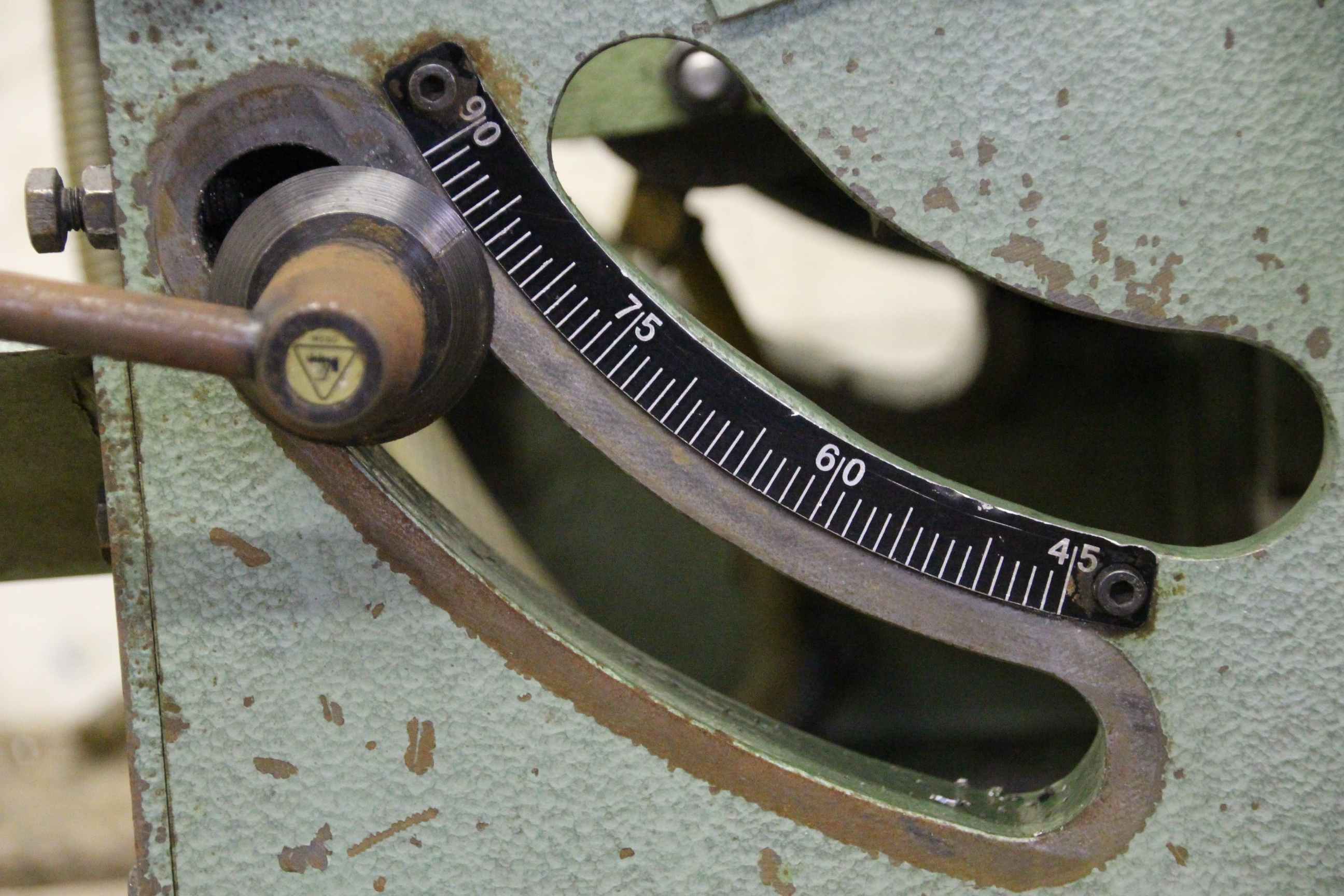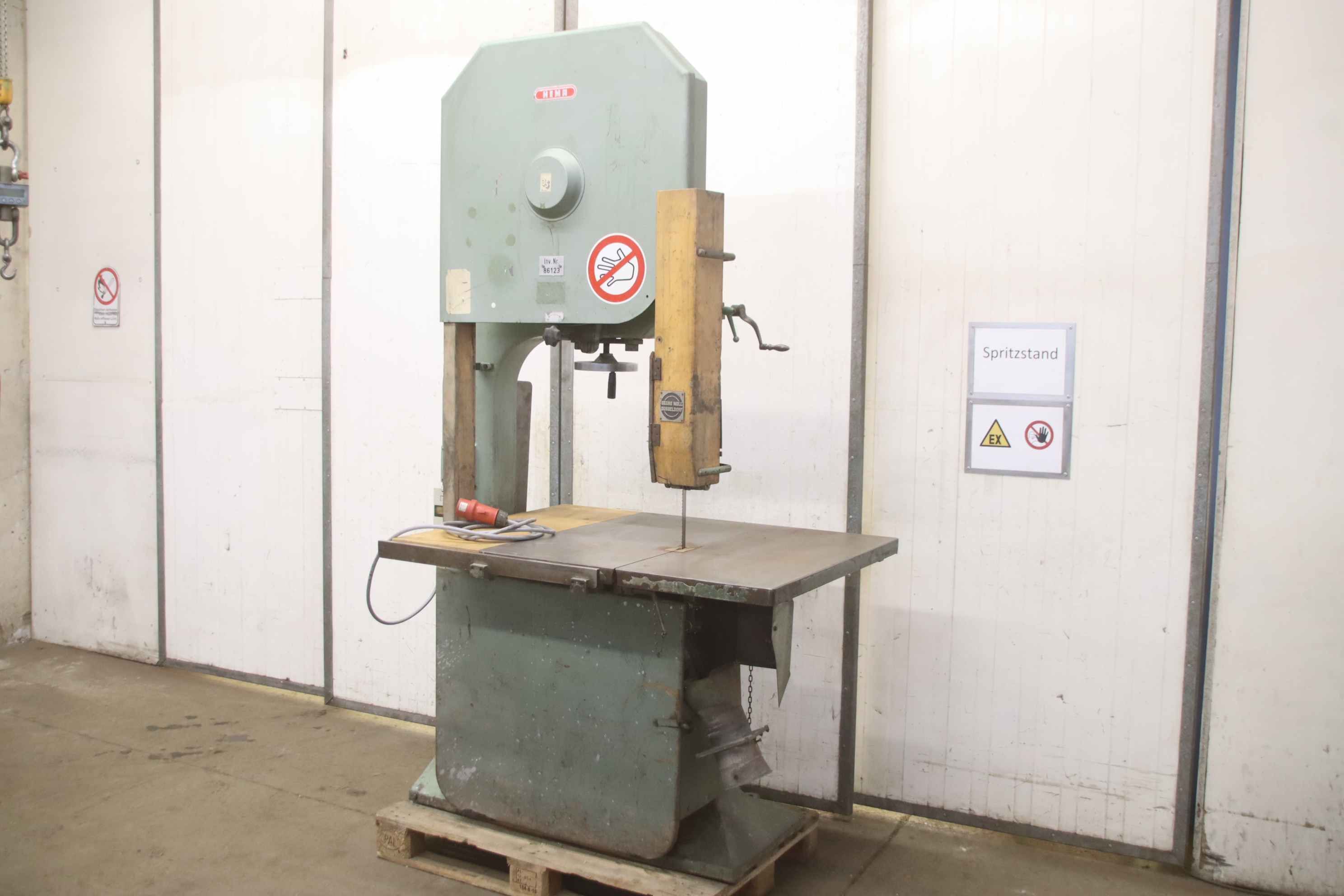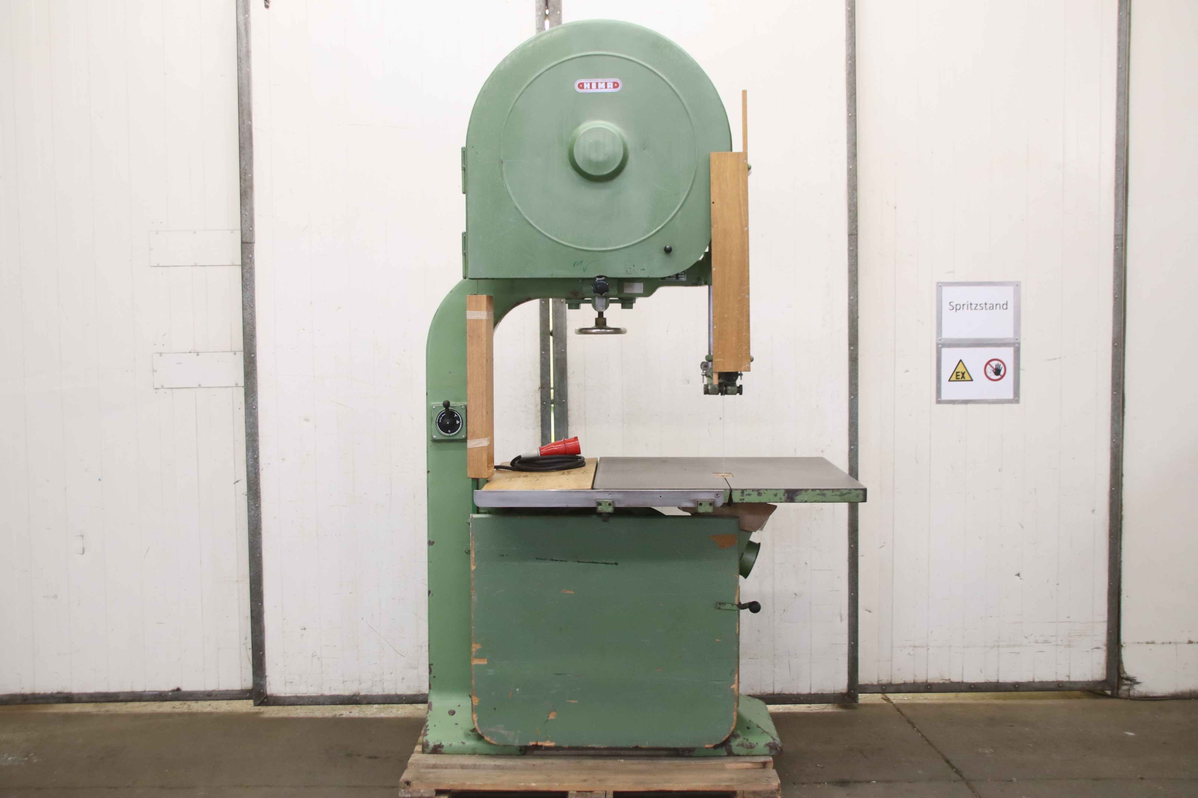Wood band saw, band saw machine, band saw, vertical band saw-Manufacturer: Hema Paul and Gotthilf Heermann, vertical band saw-Type: unfortunately without type designation-Drive: 4 kW-Cutting width: max.770 mm-Cutting height: max.400 mm-Saw band: length 5330 mm-Work table: pivoting-Dimensions: 1470/935/H2390 mm-Total weight: 743 kg