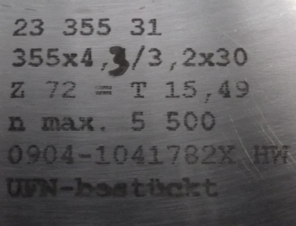 Saw blade, wood saw blade, circular saw blade -Ø 355x3.8/3.0 -Z72 = T 15.49 -n max. 5500 -0798-98541264x -UFN- equipped -Price: per piece -Number: 2x available -Weight: 2.6 kg/piece