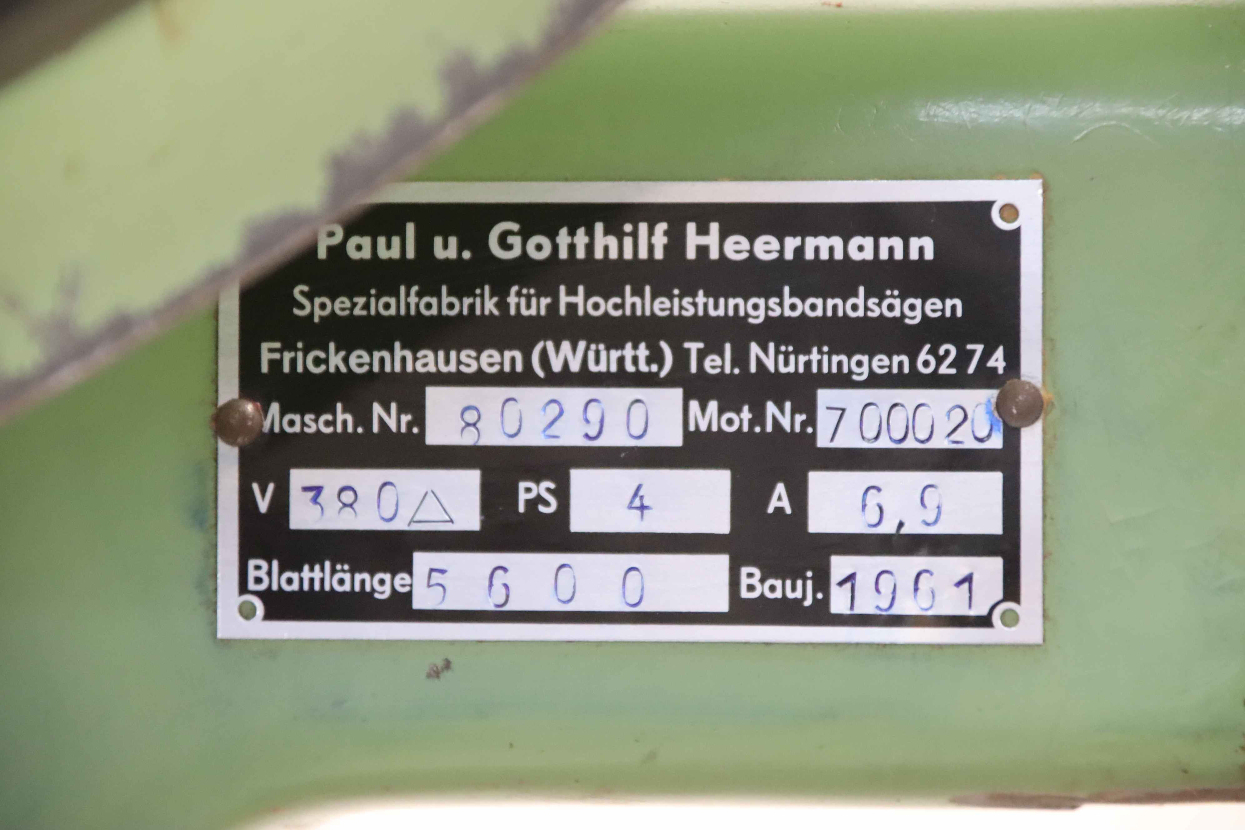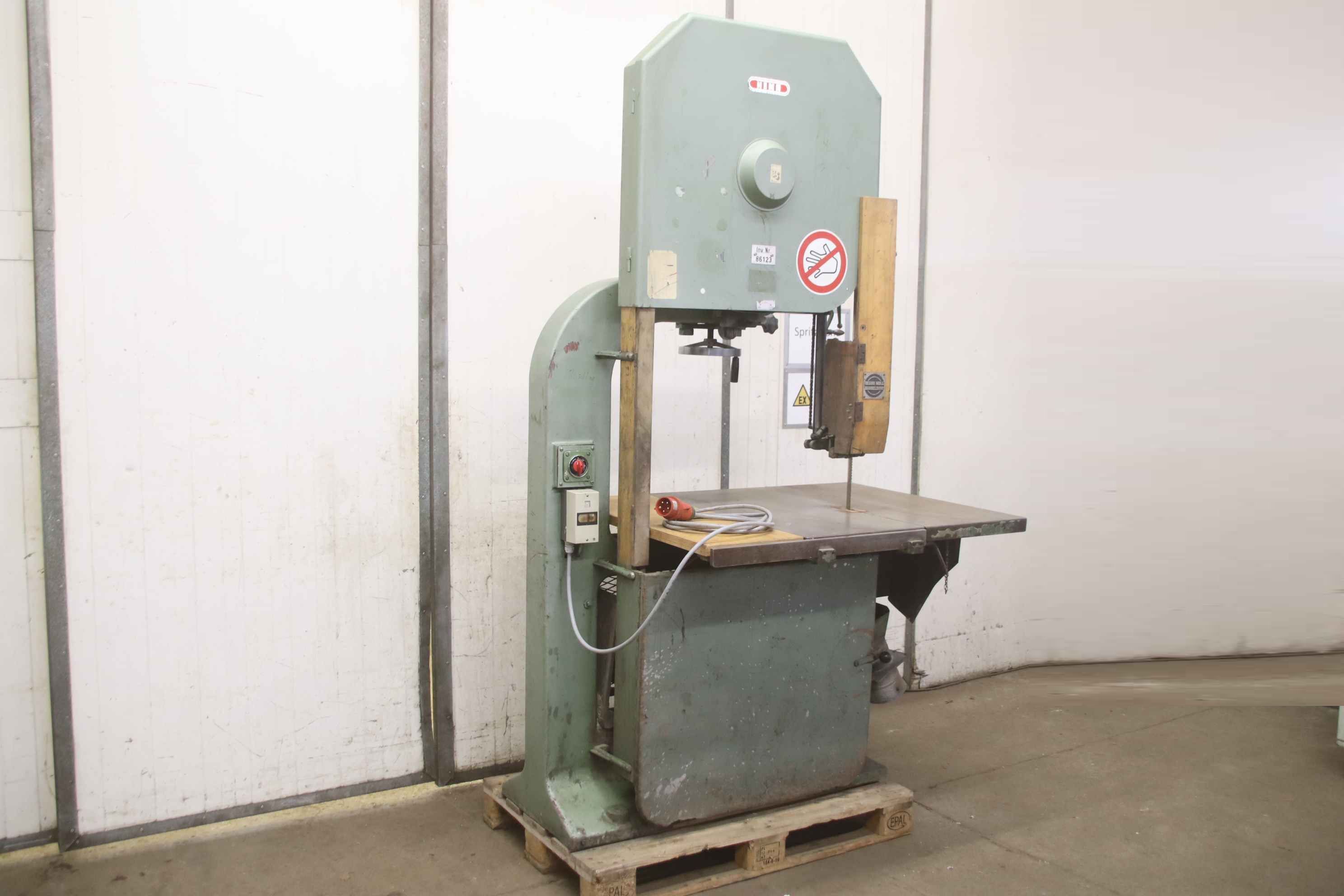 Wood band saw, band saw machine, band saw, vertical band saw-Manufacturer: Hema Paul and Gotthilf Heermann, vertical band saw-Type: unfortunately without type designation-Drive: 4 kW-Cutting width: max.780 mm-Cutting height: max.480 mm-Saw band: length 5600 mm-Work table: pivoting-Dimensions: 1420/920/H2400 mm-Total weight: 800 kg