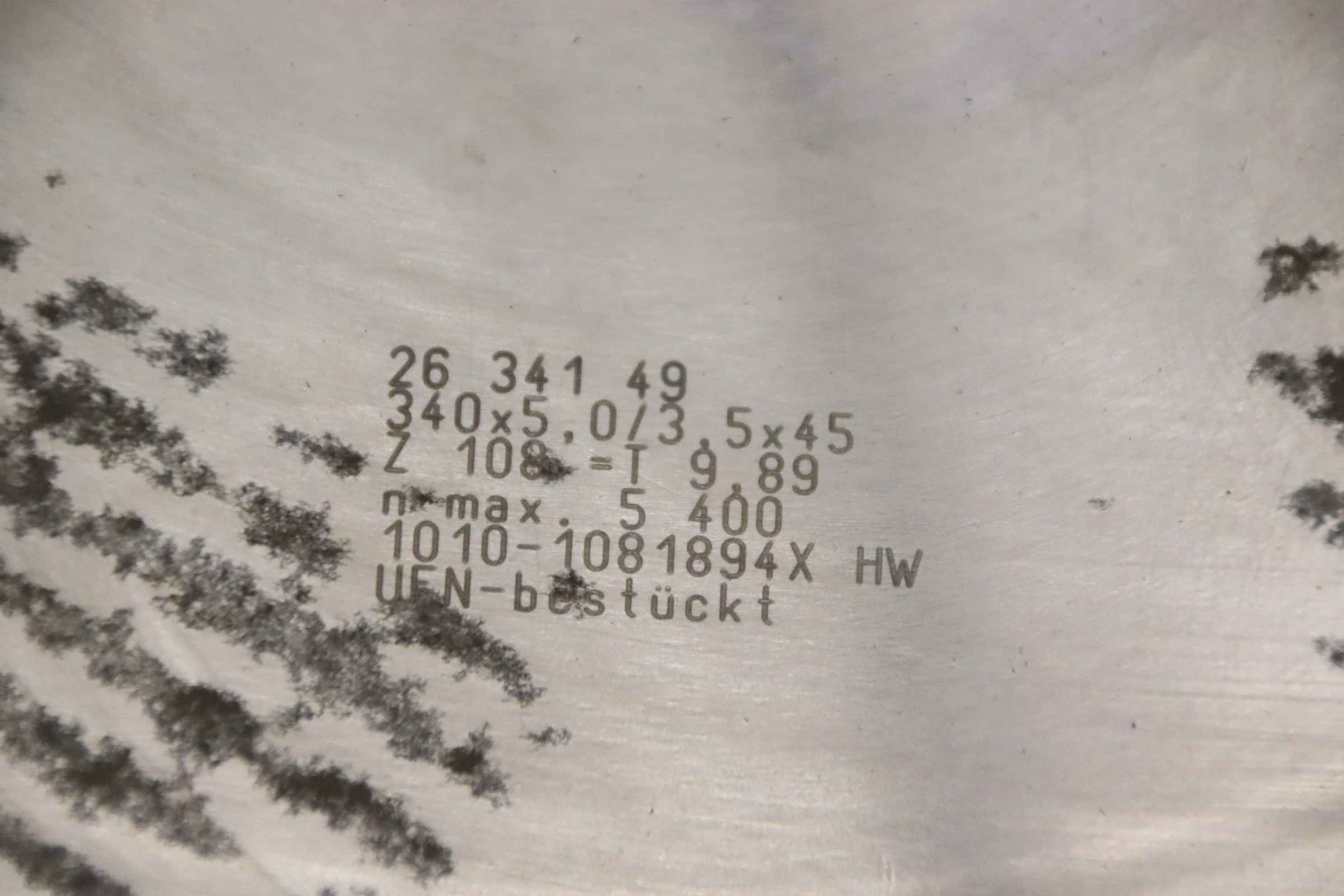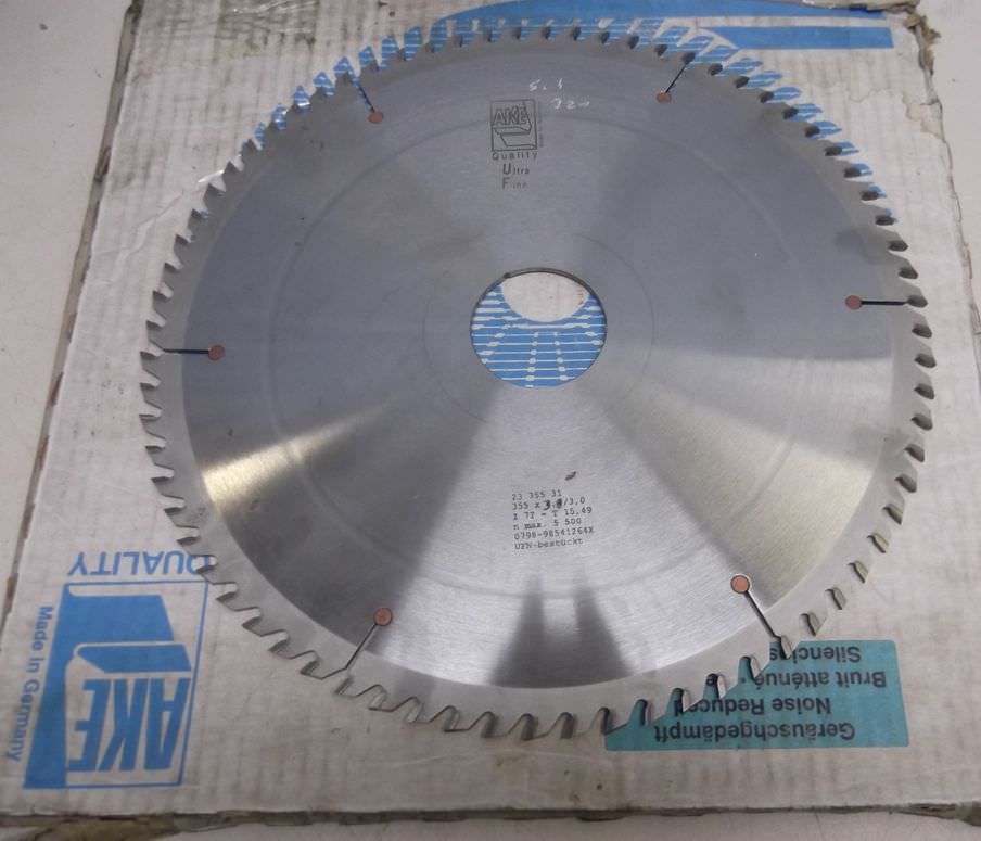 saw blade, wood saw blade, circular saw blade-Manufacturer: AKE, saw blade 904-37-Type: Ø 340x5.0/3.5 x 45 Z 108 = T 9.89-Art. No.: 1010-1081894X HW-Speed: n max. 5400 rpm-Number: 7x saw blade available-Price: per piece-Dimensions box: 410/410/H10 mm-Weight: 2.6 kg/piece
