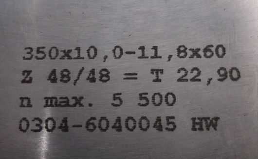 Saw blade, wood saw blade, circular saw blade -Ø 350x7.0/5.2x60 -Z48 = T 22.89 -n max. 5500 -UFN - equipped -0304-5040117x HW 2 pieces -0600-5002097x HW 3 pieces -Price: per piece -Number: 5x available -Weight: 3.8kg / piece