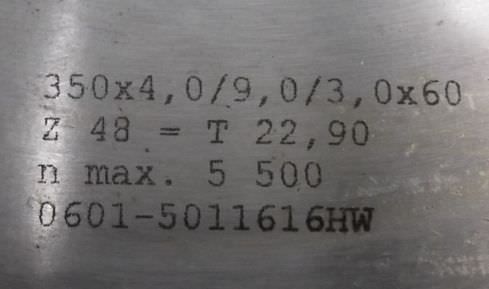 Saw blade, wood saw blade, circular saw blade -Ø 350x4.0/9.0/3.0x60 -Z48 = T 22.90 -n max. 5500 -0601-5011616 HW -Price: per piece -Number: 6x available -Weight: 1.6 kg/piece