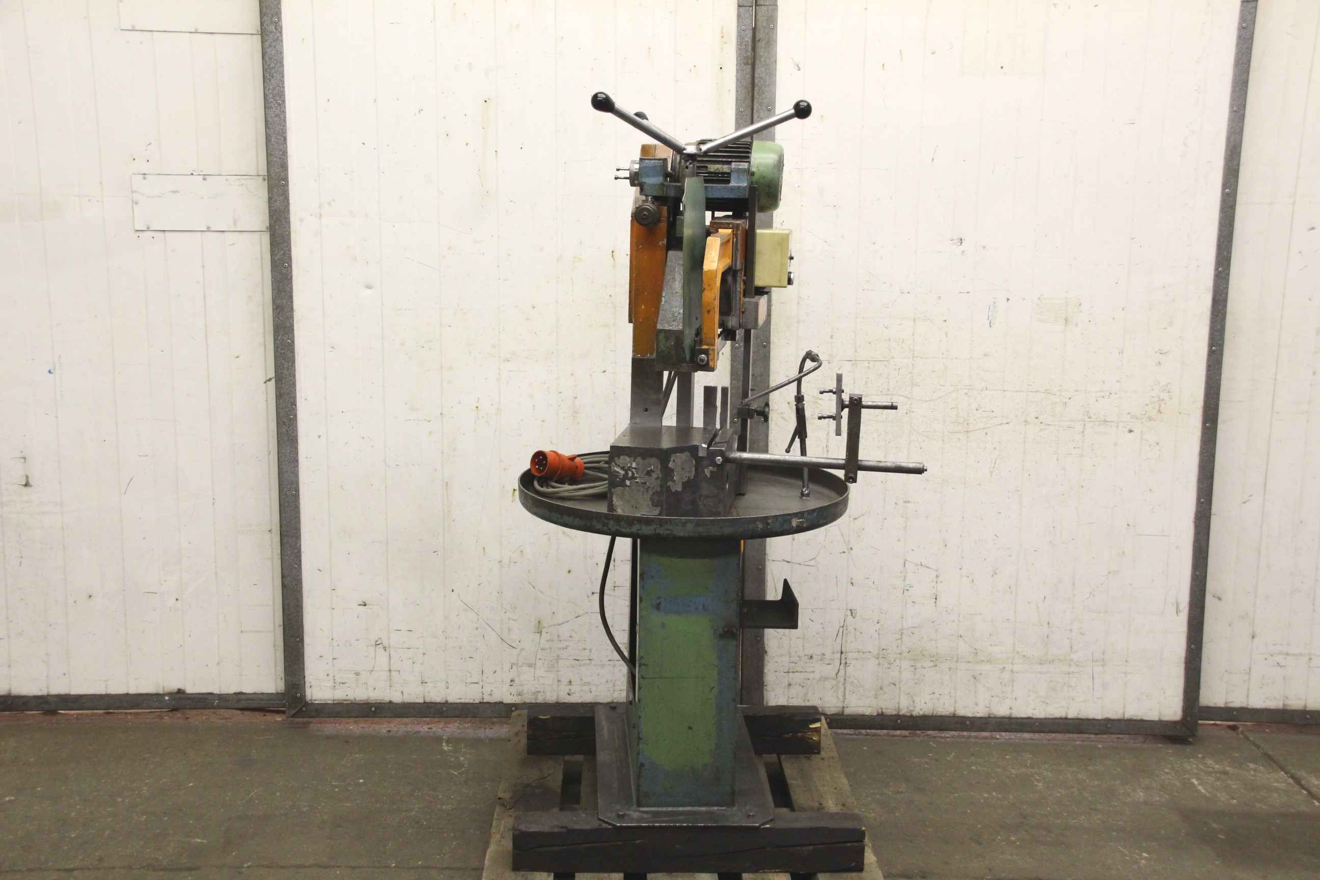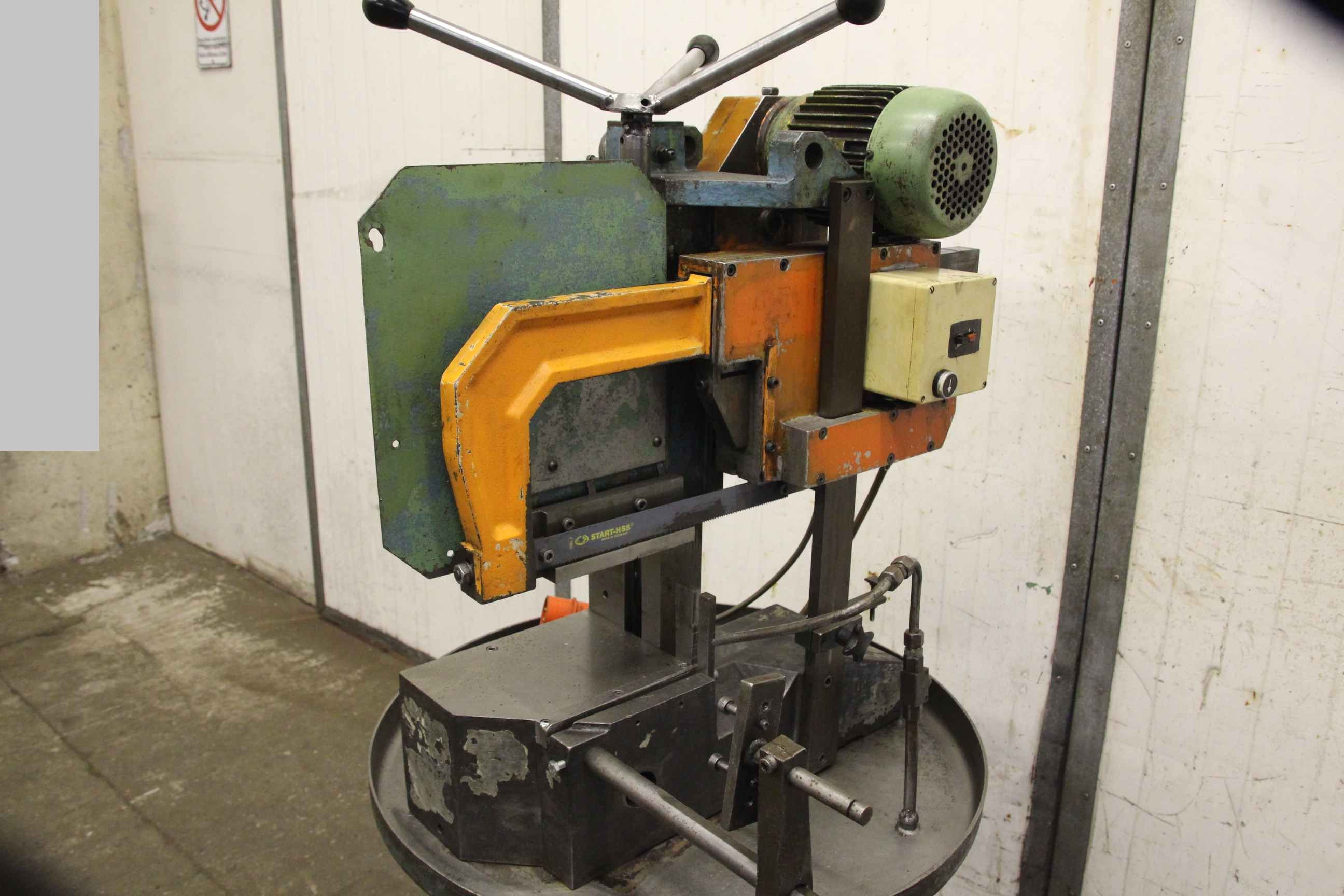 Hacksaw, hacksaw machine -Hoop saw: electric, with coolant system -Type: unfortunately no type designation -Power: 0.55 / 0.75 kW -Max. cutting height: approx. 145 mm -Max. cutting width: approx. 180 mm -Saw blade: Length approx. 325 mm -Machine dimensions: 800/700/H1520 mm -Weight: 224 kg