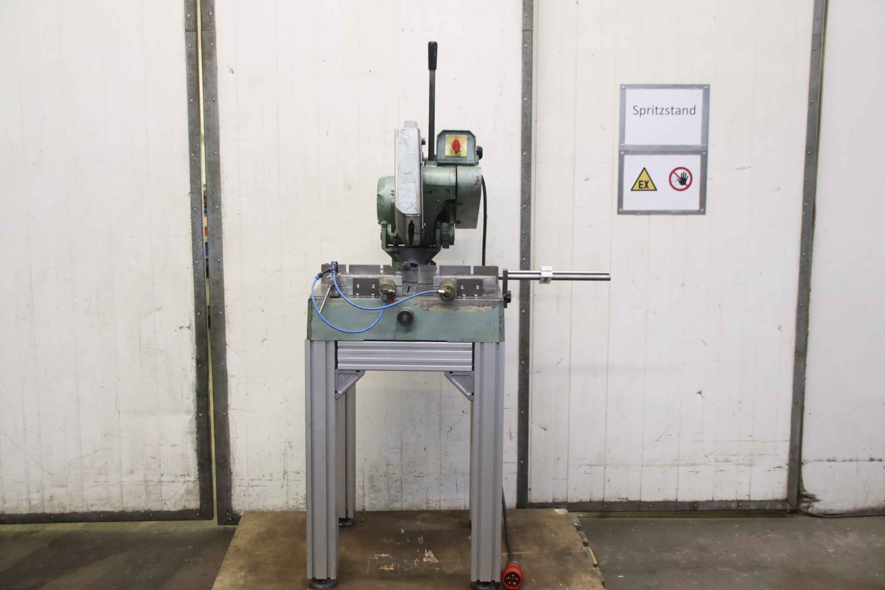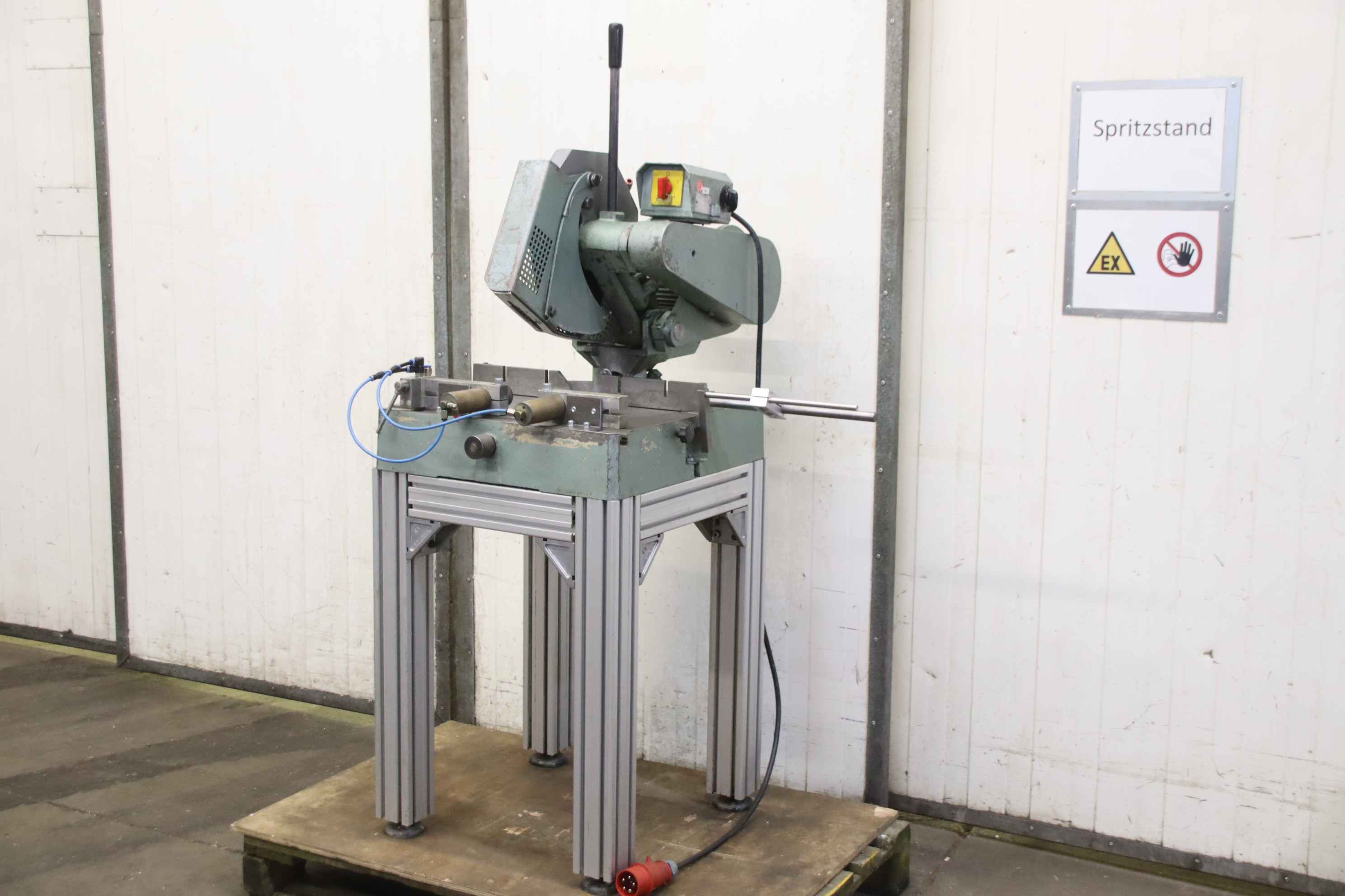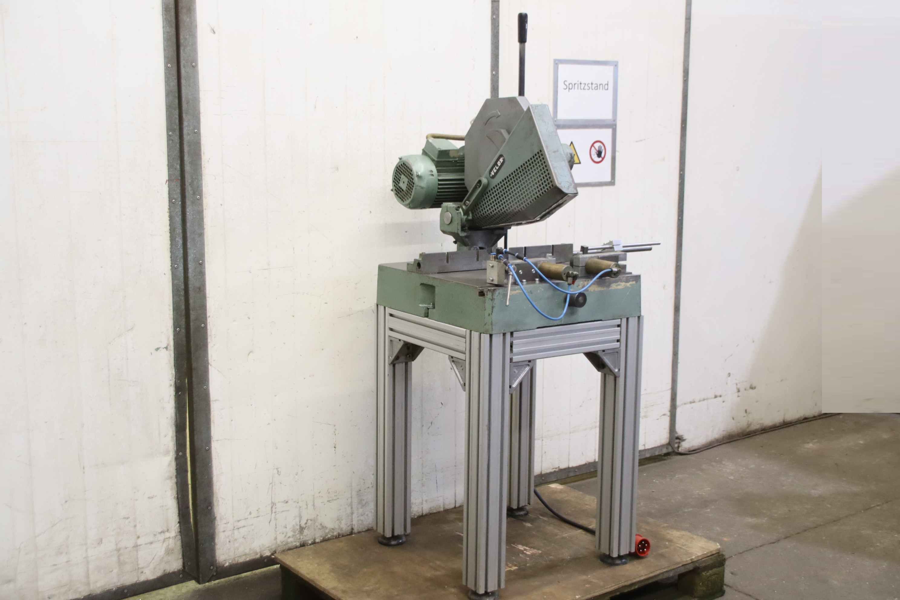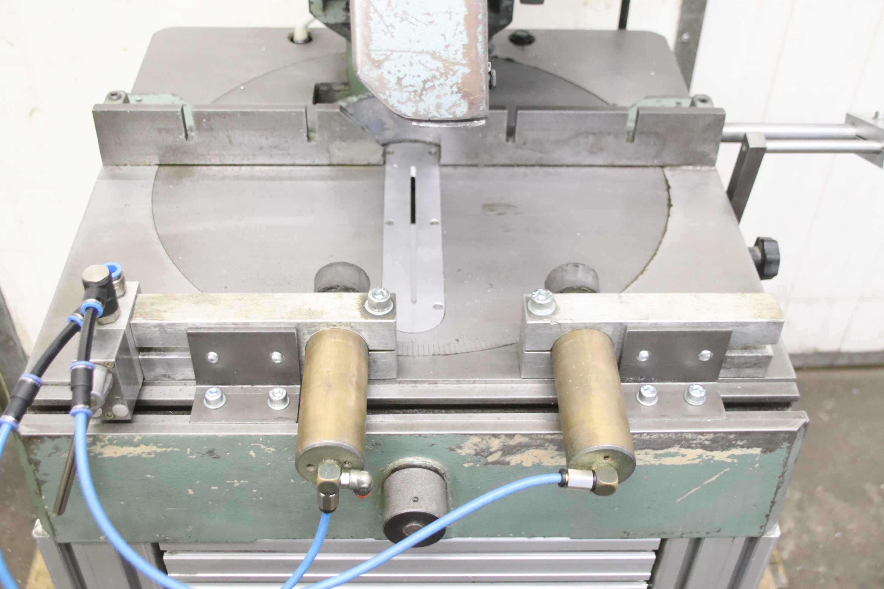 Aluminum crosscut saw, aluminum circular saw, aluminum semi-automatic circular saw, crosscut saw, glazing bead saw, metal crosscut saw, crosscut and miter saw, aluminum metal circular saw, light metal circular saw-Manufacturer: Berg & Schmidt, aluminum metal circular saw Velox 350 with solid base frame-Saw blade: Ø 350 mm / 1400/2800 rpm-Cutting height: 100 mm-Cutting width: 170 mm-Double miter: 45°-Drive: 1.3 / 1.7 kW-Double clamping device: pneumatic-Dimensions: 890/600/H1670 mm-Weight: 198 kg
