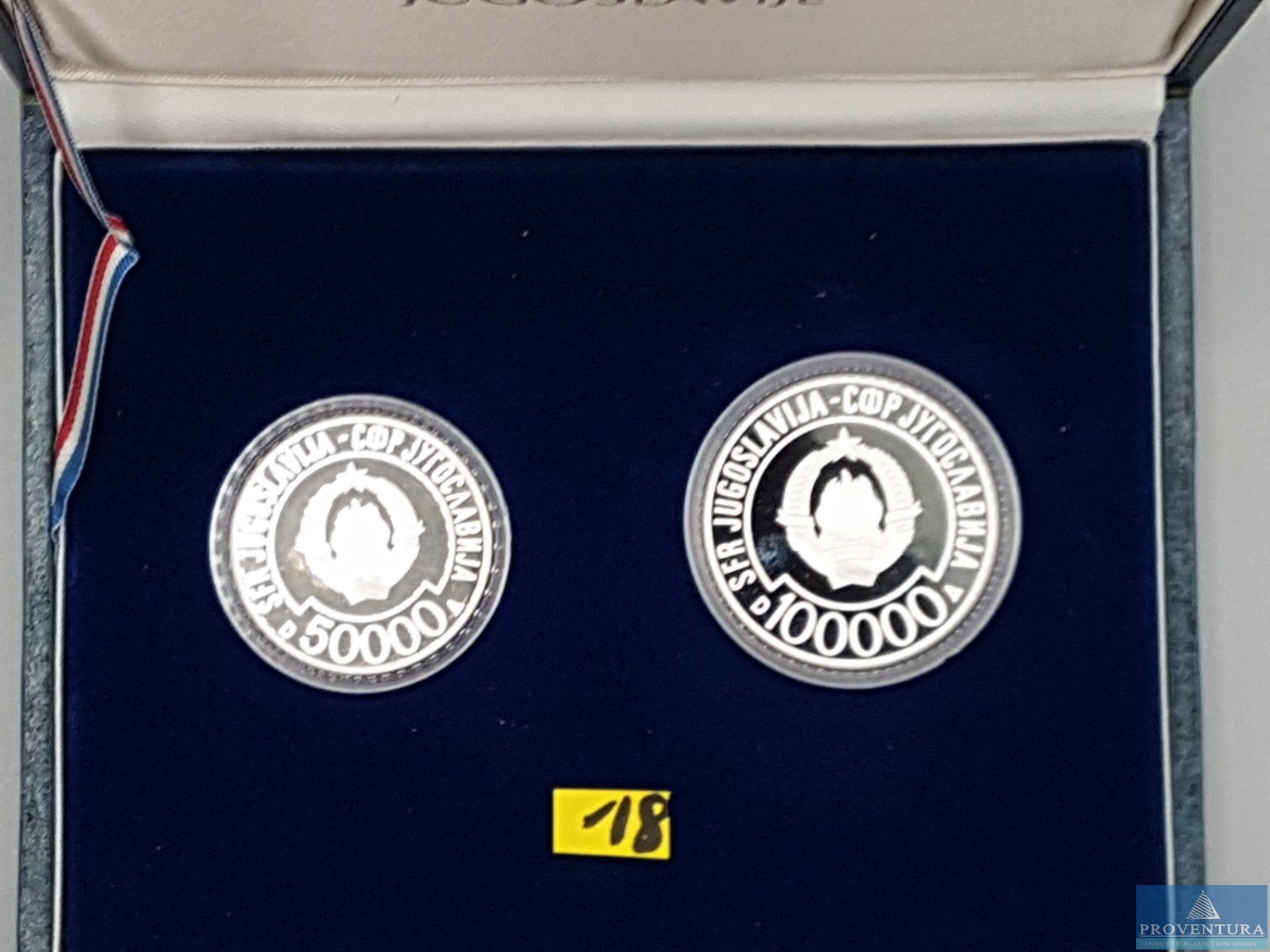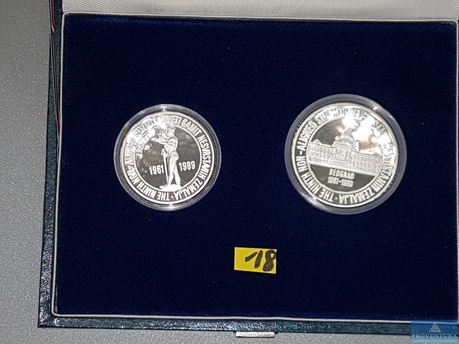 Серебряный набор монет Югославия на саммите стран неприсоединившихся 50 000 и 100 000 динаров 1989 года пруф серебро .925 13 гр KM 136 и серебро .925 17 гр KM137, инкапсулированный, коллекционный футля