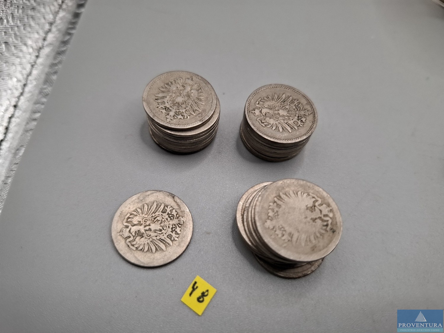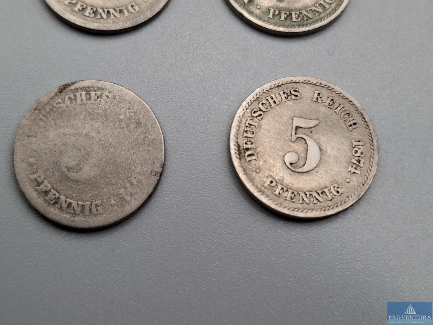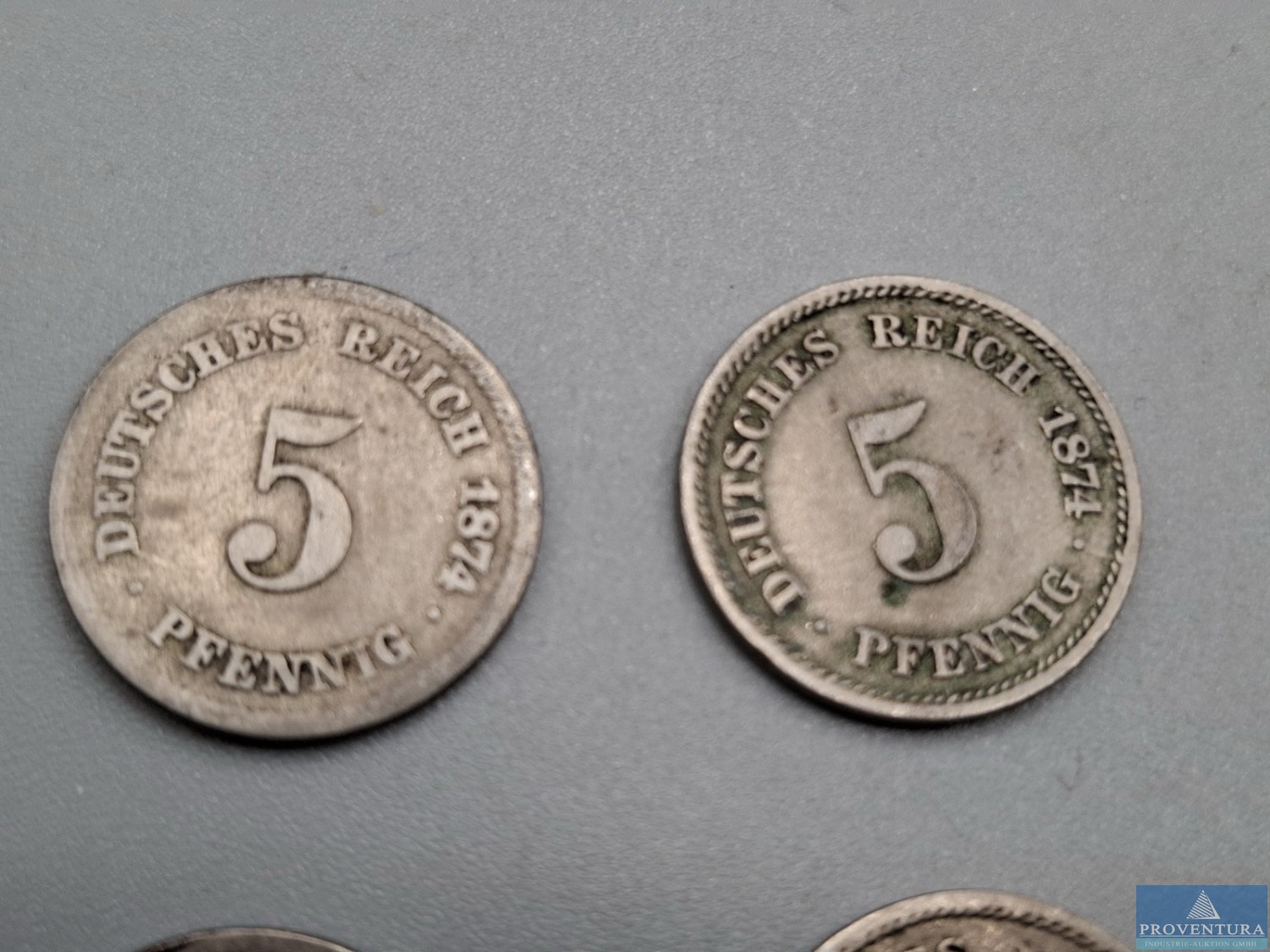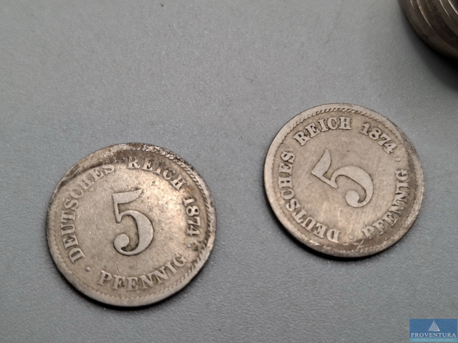 Оборотные монеты: Германская империя 31x5, пфенниг 6x 1874, 18x 1875, 4x 1876, 1888A, 1889AA, KM3