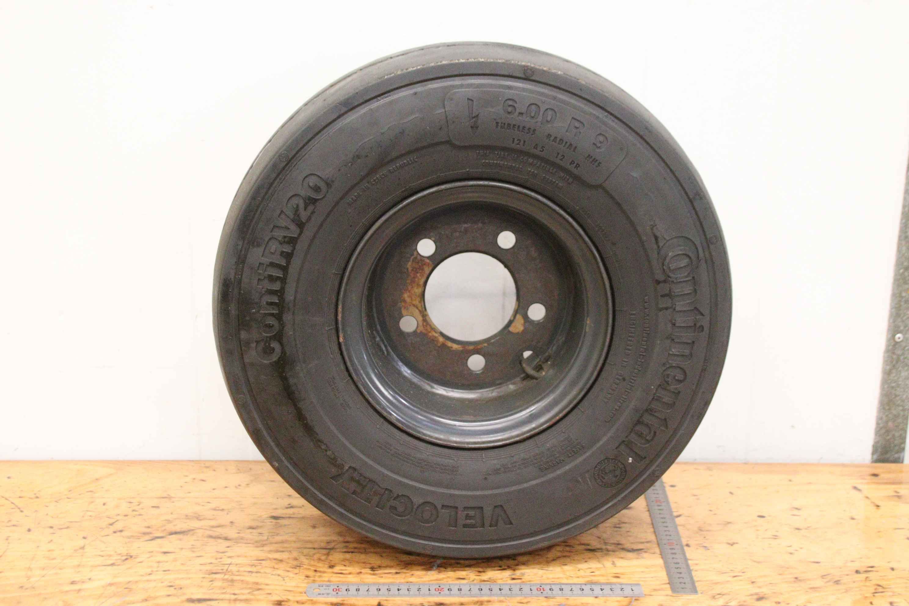 Tires with rim, trailer tires, heavy-duty tires, heavy-duty wheels, forklift tires, complete wheels -Manufacturer: Continental, 2 pieces of tires ContiRV20 Velocity with rim from electric tractor Still -Tire size: 6.00 R 9 -Bolt circle: Ø 140 x 18 mm -Recess: Ø 94 mm -Price/Delivery: complete -Dimensions: Ø 520 x 160 mm/piece -Weight: 22 kg/piece