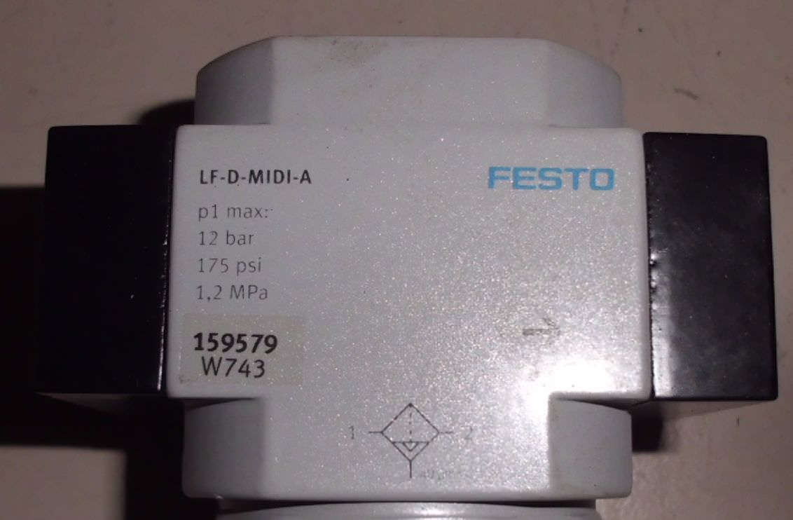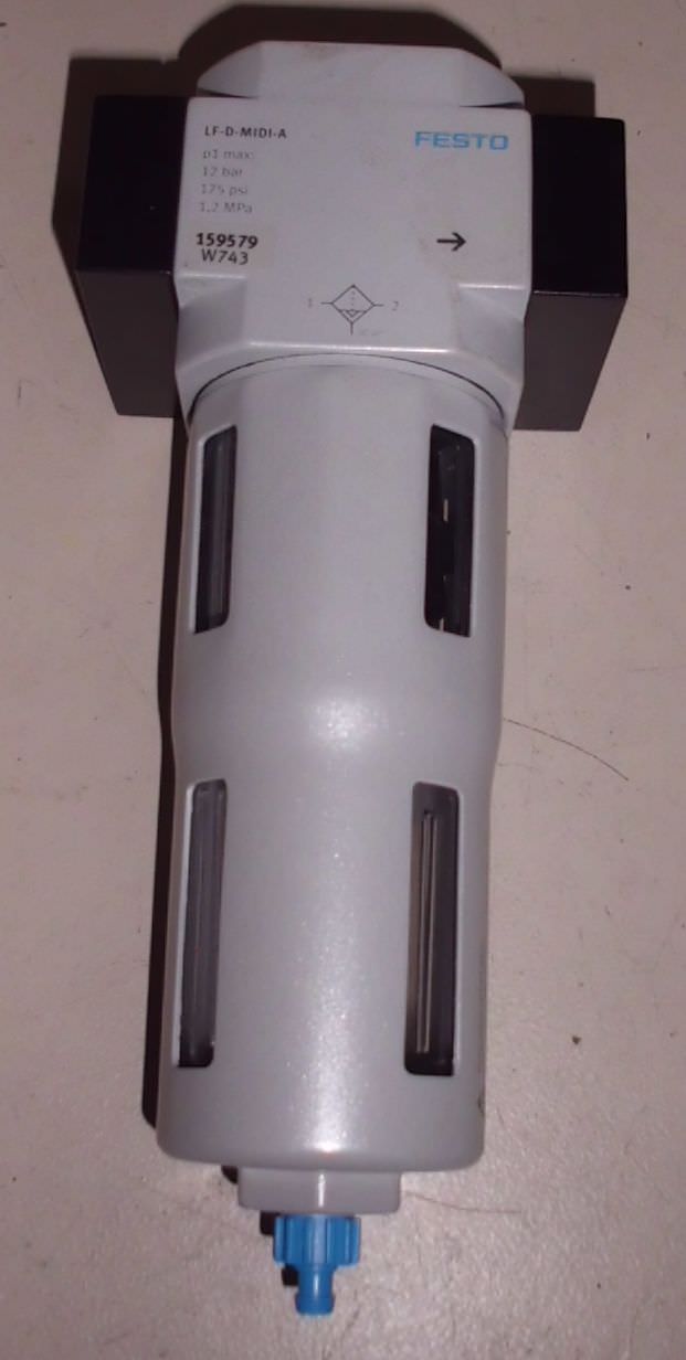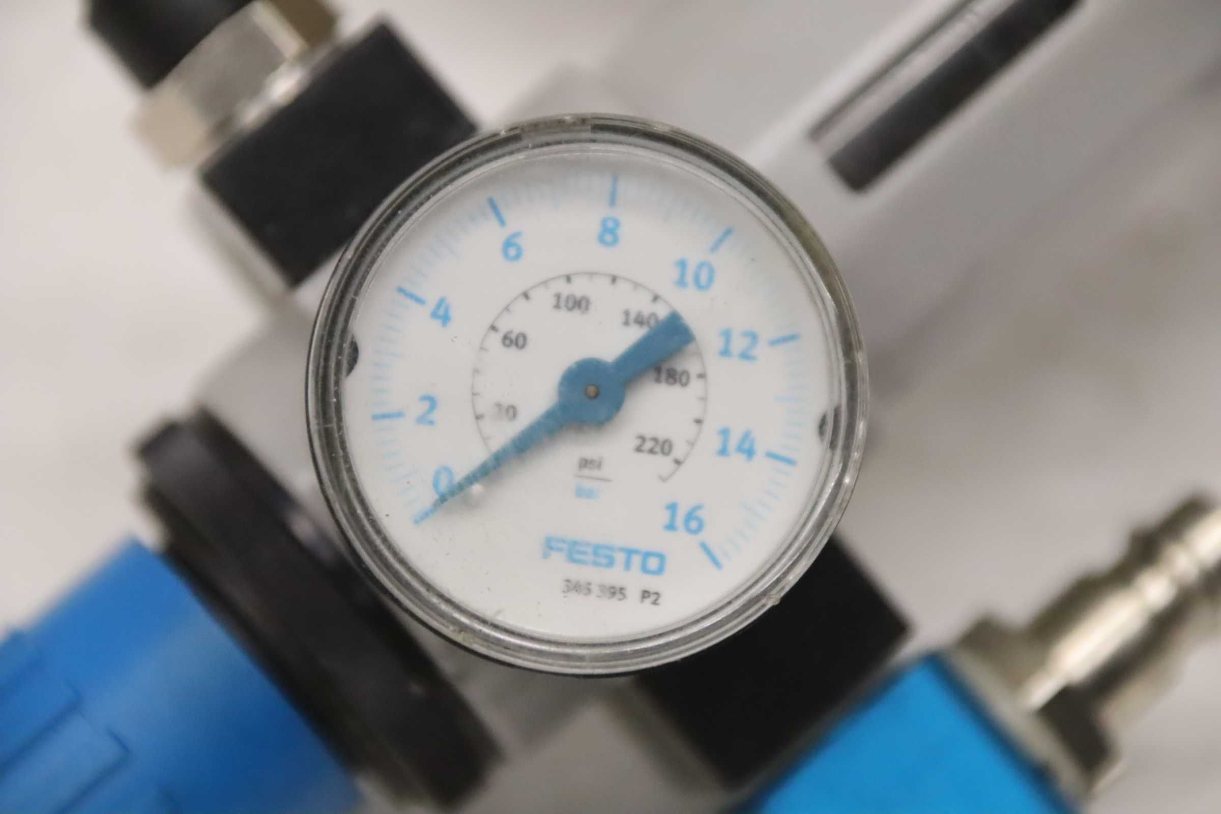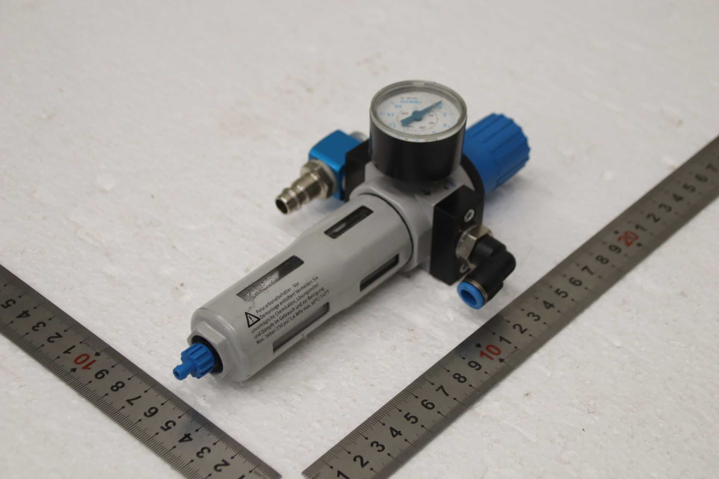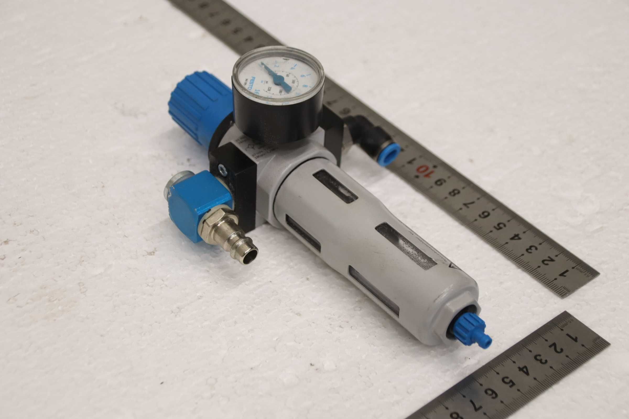 Filter control valve, switching valve, maintenance unit, water separator, filter bowl, pneumatic filter, filter regulator, maintenance unit combination, filter control valve -Manufacturer: Festo, filter regulator with pressure gauge -Type:LFR-1/4-D-MINI 159631 -Pressure: max. 16 bar -Quantity: 1x filter control valve available -Dimensions: 210/120/75 mm -Weight: 0.6 kg