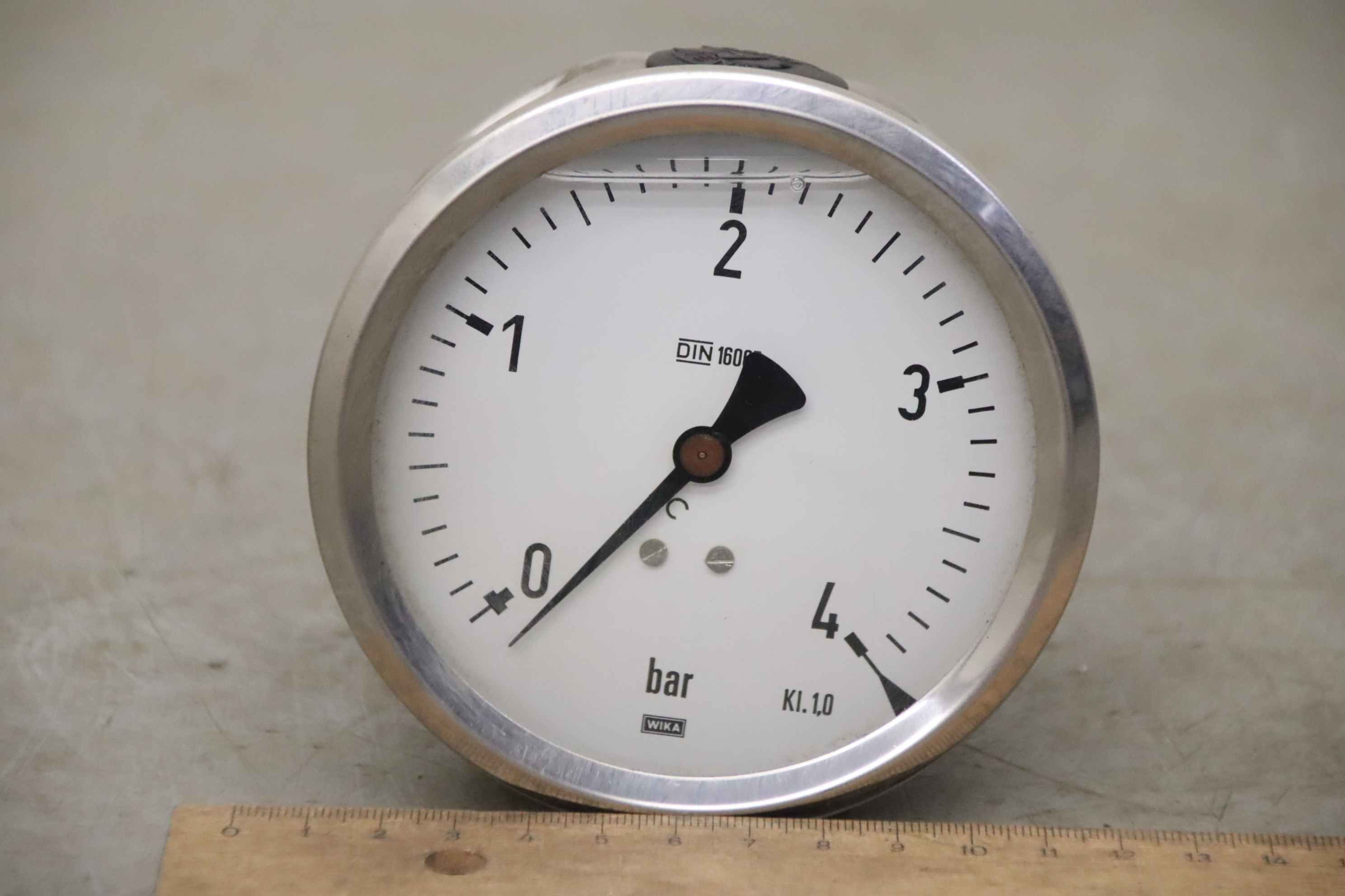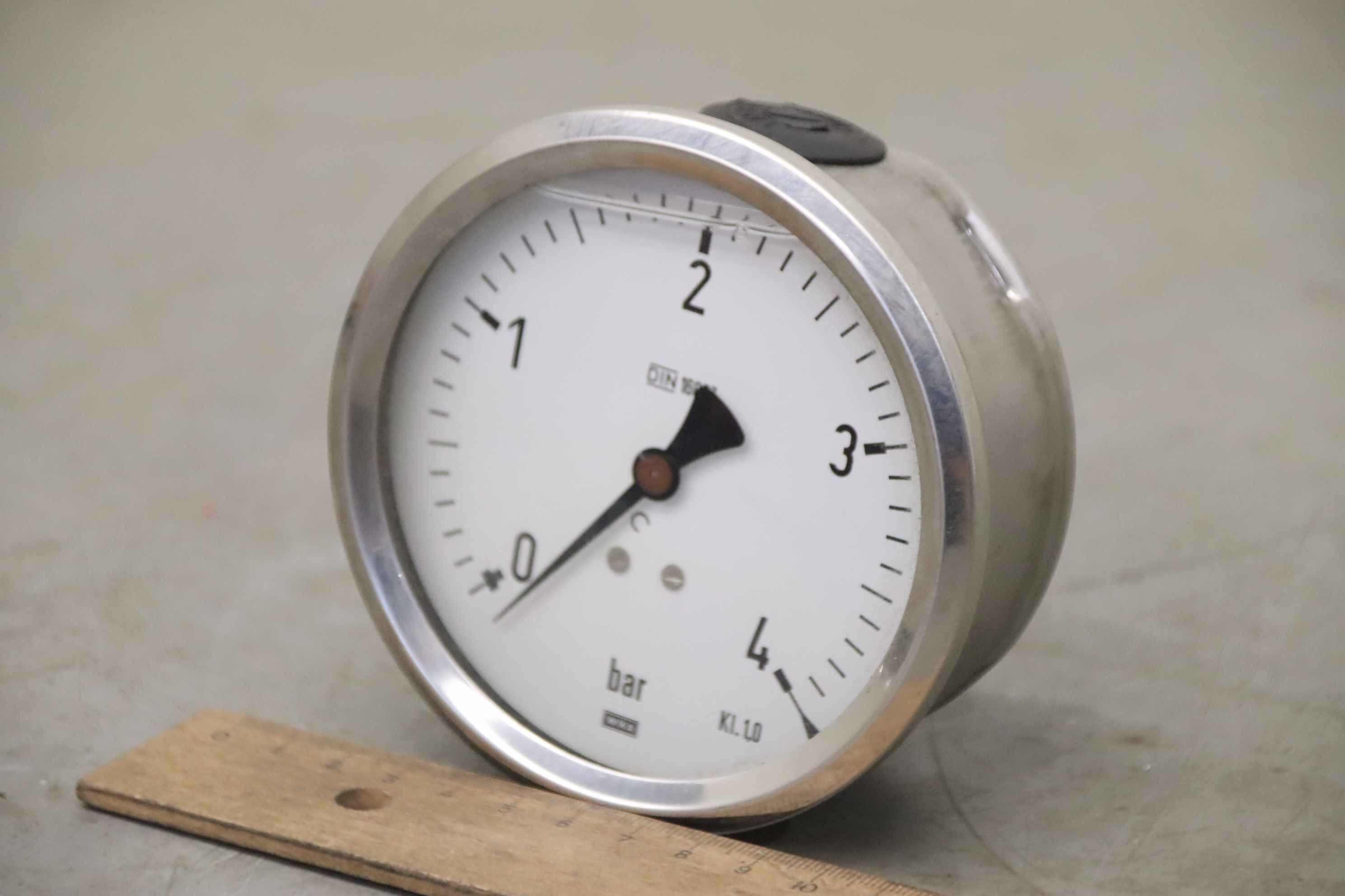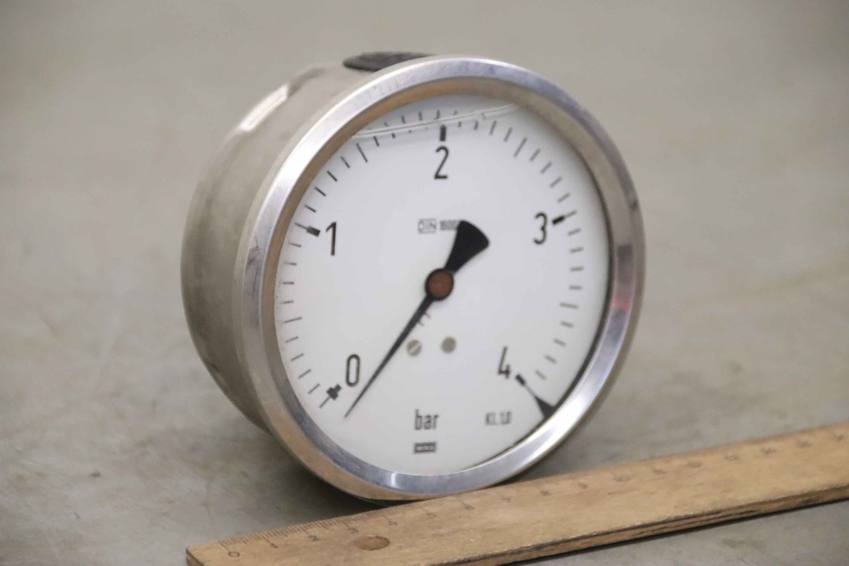Manometer, test manometer, pressure gauge with Bourdon tube, pressure and temperature measurement technology-Manufacturer: Wika, capsule spring pressure gauge, unused original packaging-Type: 0 to 4 bar-Screw connection: see photos-Number: 9x manometer available-Price per piece-Dimension: 110/85/H110 mm-Weight: 0.8 kg/pcs