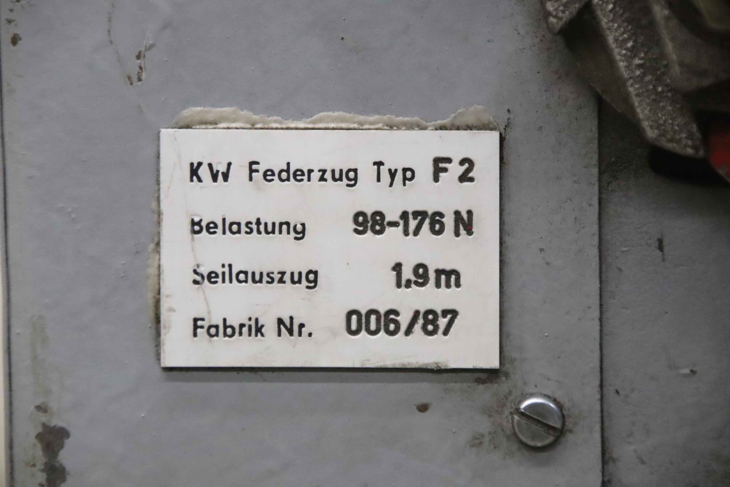 Balancer, machine balancer, spring balancer, cable extension, weight compensator -Manufacturer: KW, spring balancer type F2 with locking mechanism -Load: 98-176 N -Cable extension: 1.9 m -Quantity: 2x spring balance available Price: per piece -Dimensions: 225/125/H340 mm -Weight: 10.3 kg/pc.