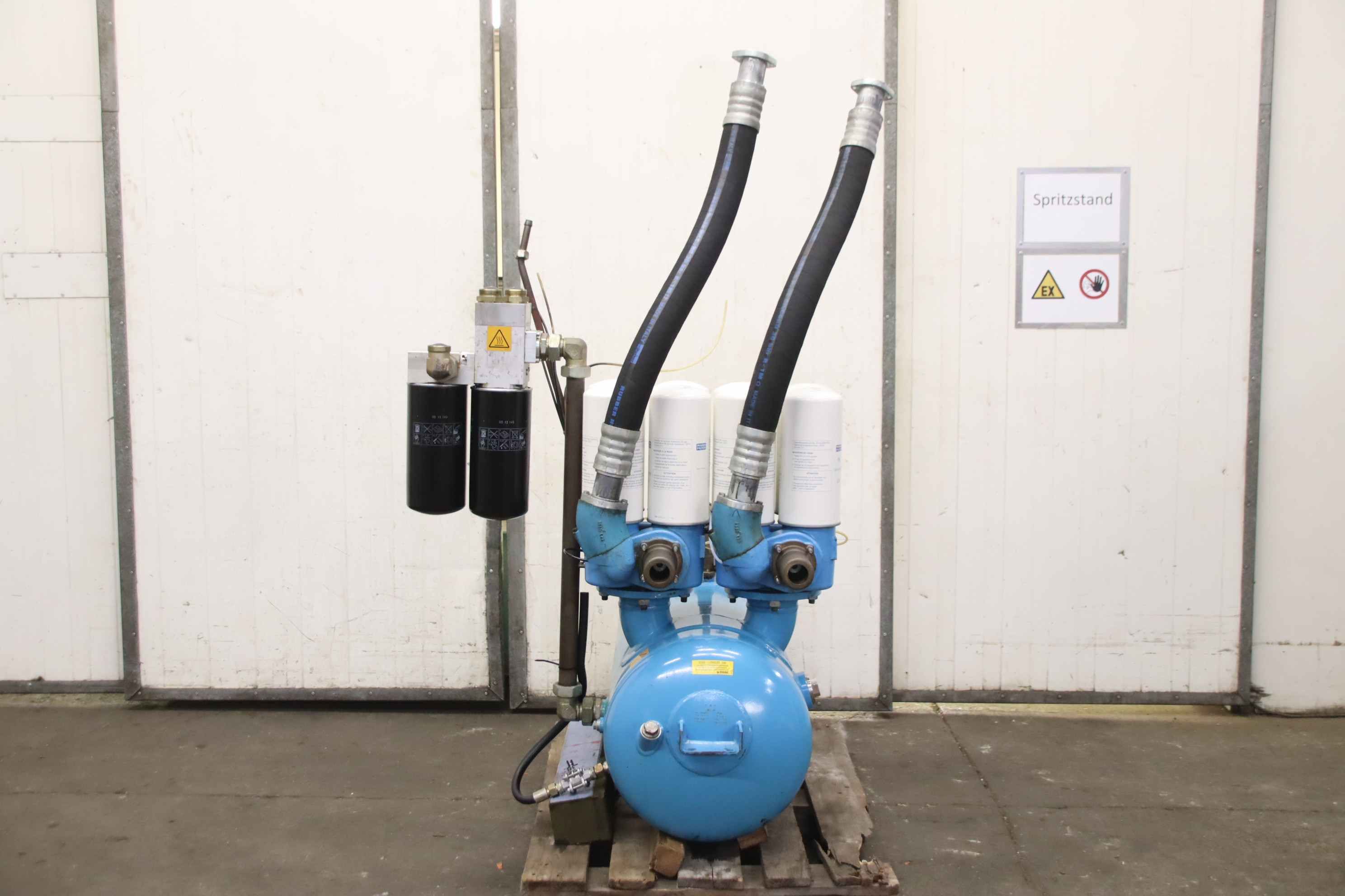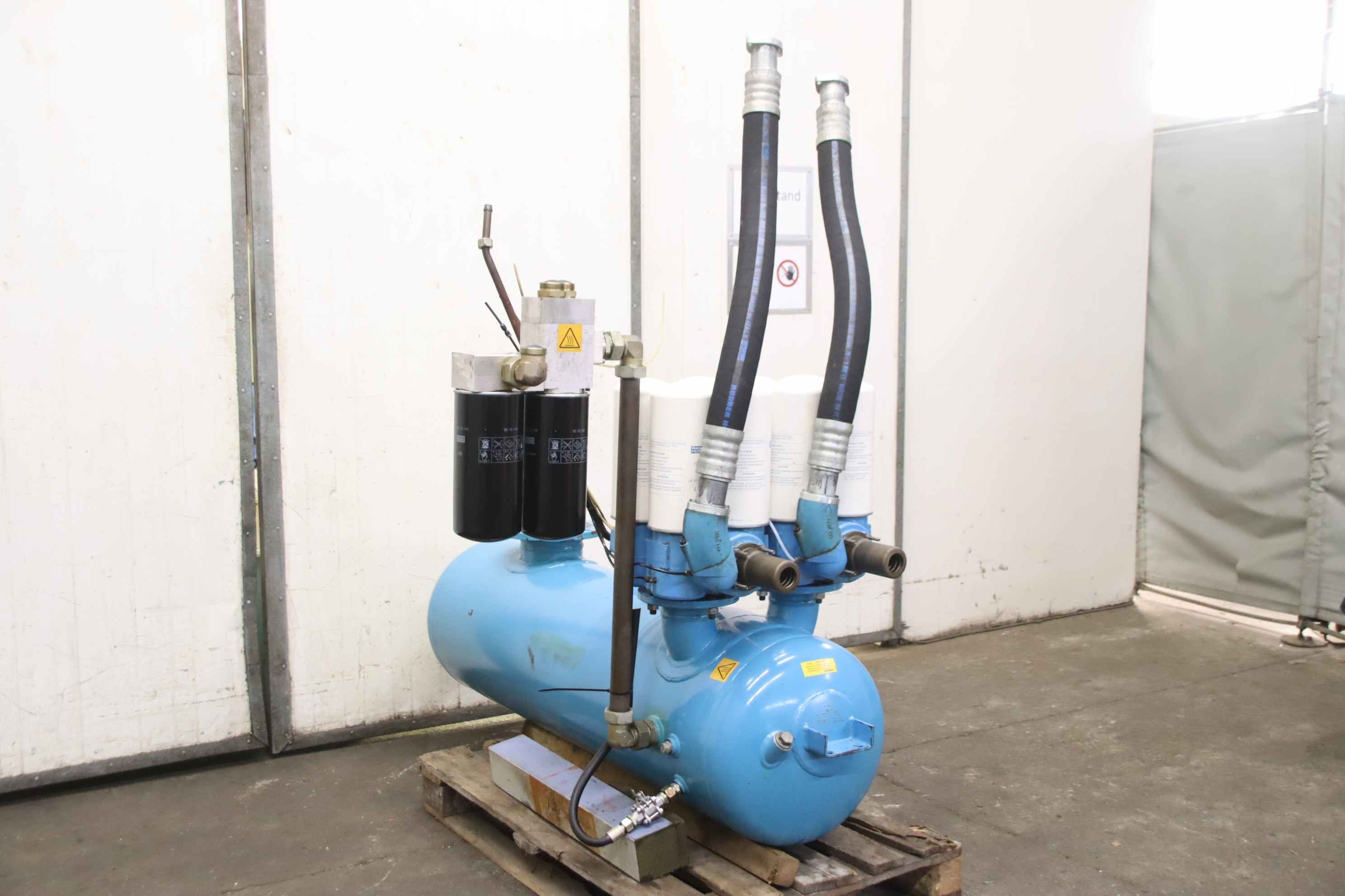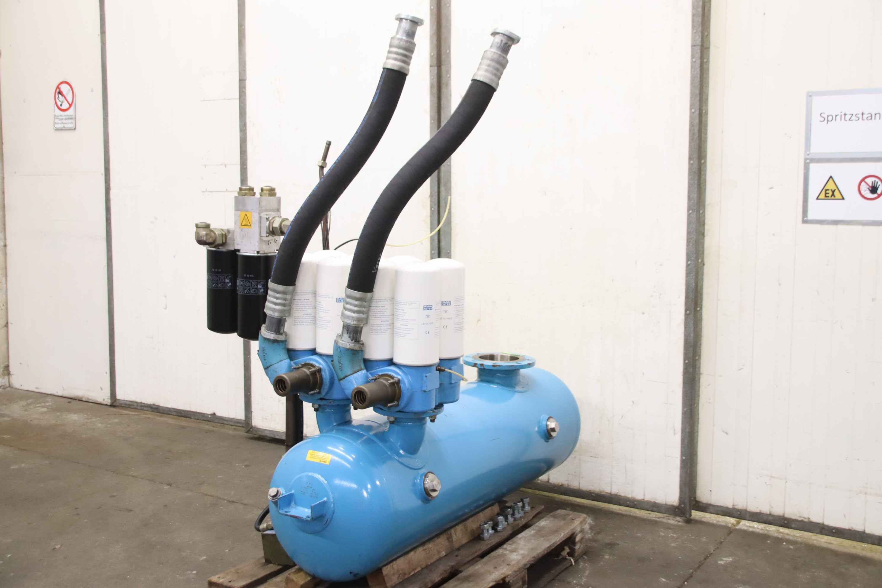 Compressed air tank, pressure container, pressure tank, compressed air boiler, pressure vessel, compressor tank, pressure accumulator for screw compressor, compressor, compressed air unit, stationary compressed air compressor, screw block, compressor, compressor stage -Manufacturer: Boge, pressure accumulator with filter block from compressor type SL 270 -Pressure accumulator: Type 306022 V 230 L -Final pressure: max. 15 bar -Hole circle: Ø 240 x 22 mm -Filter units: see photos of individual components -Dimensions: 1600/980/H1270 mm -Weight: 289kg