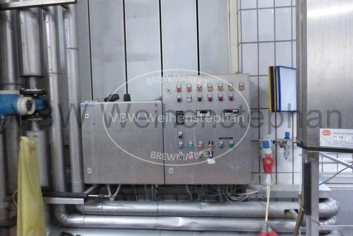 This plate heat exchanger from APV offers efficient and reliable heat transfer with a capacity of up to 240 hl/h in two stages. With a generous heat exchange area of 134 m² and a robust design for operating pressures up to 23 bar, this unit is well suited for demanding applications in breweries and the beverage industry. Thanks to its solid construction and compact design, it can be easily integrated into existing systems while ensuring high thermal performance and energy efficiency. An excellent and cost-effective solution for wort cooling, product heating, or other process applications. Our team at VBW Asset Trade will be happy to answer your questions., Capacity: 240 hl/h 2 stages, Heat exchange area: 134 m² plate tracery min. 880 mm, max. 910 mm, actual 885 mm, Operating pressure: 23 bar, Length: 2000 mm, Width: 700 mm, Height: 2000 mm