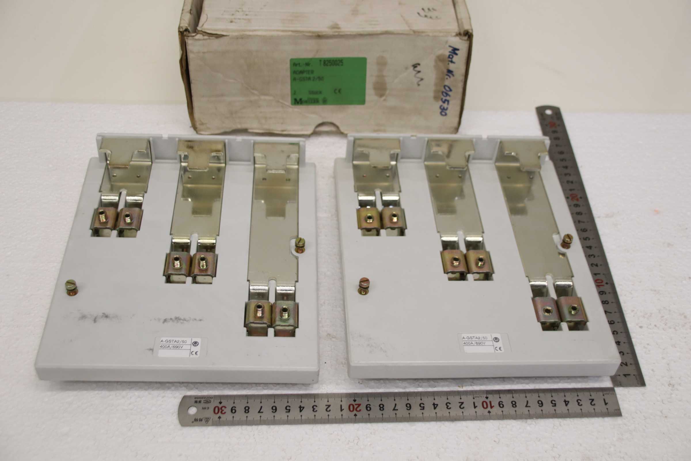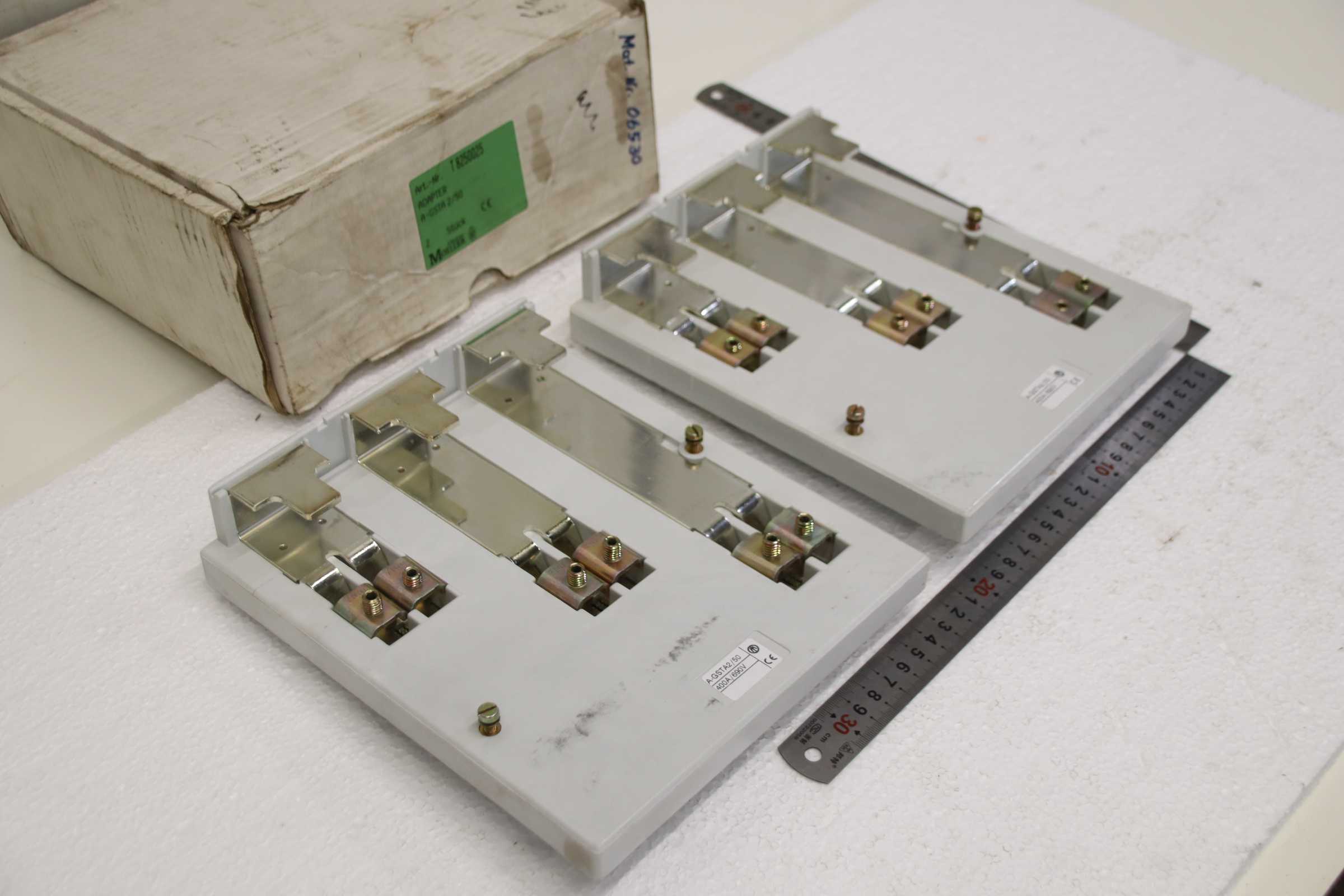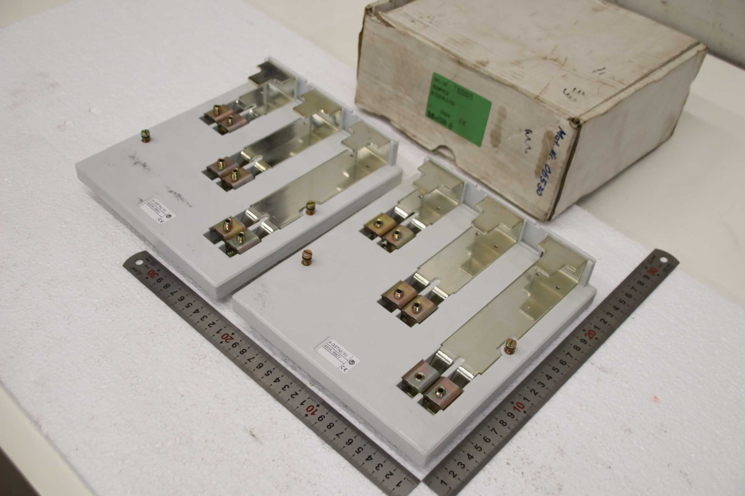 Auxiliary circuit breaker, miniature circuit breaker, fuse, line switch, miniature circuit breaker, load break switch, terminal block, load disconnector, fuse-switch disconnector, NH fuse base -Manufacturer: Klöckner Moeller, adapter plate, 2 pieces, unused, original packaging -Type: A-GSTA2/50 400A -Item No.: T 8250025 -Quantity: 1x box with 2 pcs. available -Cardboard dimensions: 260/235/H115 mm -Total weight: 2.6 kg
