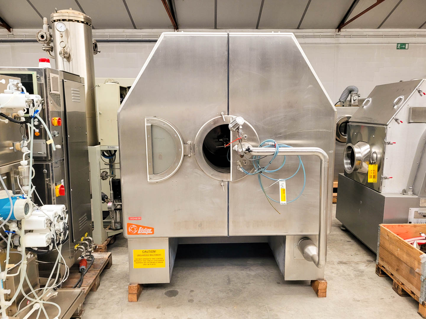 General SKU049Z263 MakeLödige Paderborn TypeLHC-130 Hi-Coater No.12919 Year of construction1992 LocationBarneveld Main Features MaterialStainless steel Motor20 KW Inlet diameter1300 mm Specified Features - Coating pan MaterialStainless steel 1.4401 (316) Coating installationcheck Film and sugar coating unit Batch sizemax. 150 kg Pan diameter1300 mm Cylindrical width350 mm Motor± 3,0 kW, 415 Volt (Ex) With frequency controllercheck With steam heatingcheck air supply unit, type NHK-HYD With fantype KXE-160 Capacity1800 m3/hr Motor20,0 kW, 415 Volt (Ex) With spraying armcheck Information With switchgear2,8 x 0,5 x 2,1 m Floorspace2,2 x 1,8 m Total height2,3 m Weightcoater 1650 kg ATEX compatiblecheck Extra Specifications- Partially perforated drum (4 zones of 290x230 mm)- Drum equipped with pneumatically operated outlet valve (± 300x70 mm)- Material: optiso ...