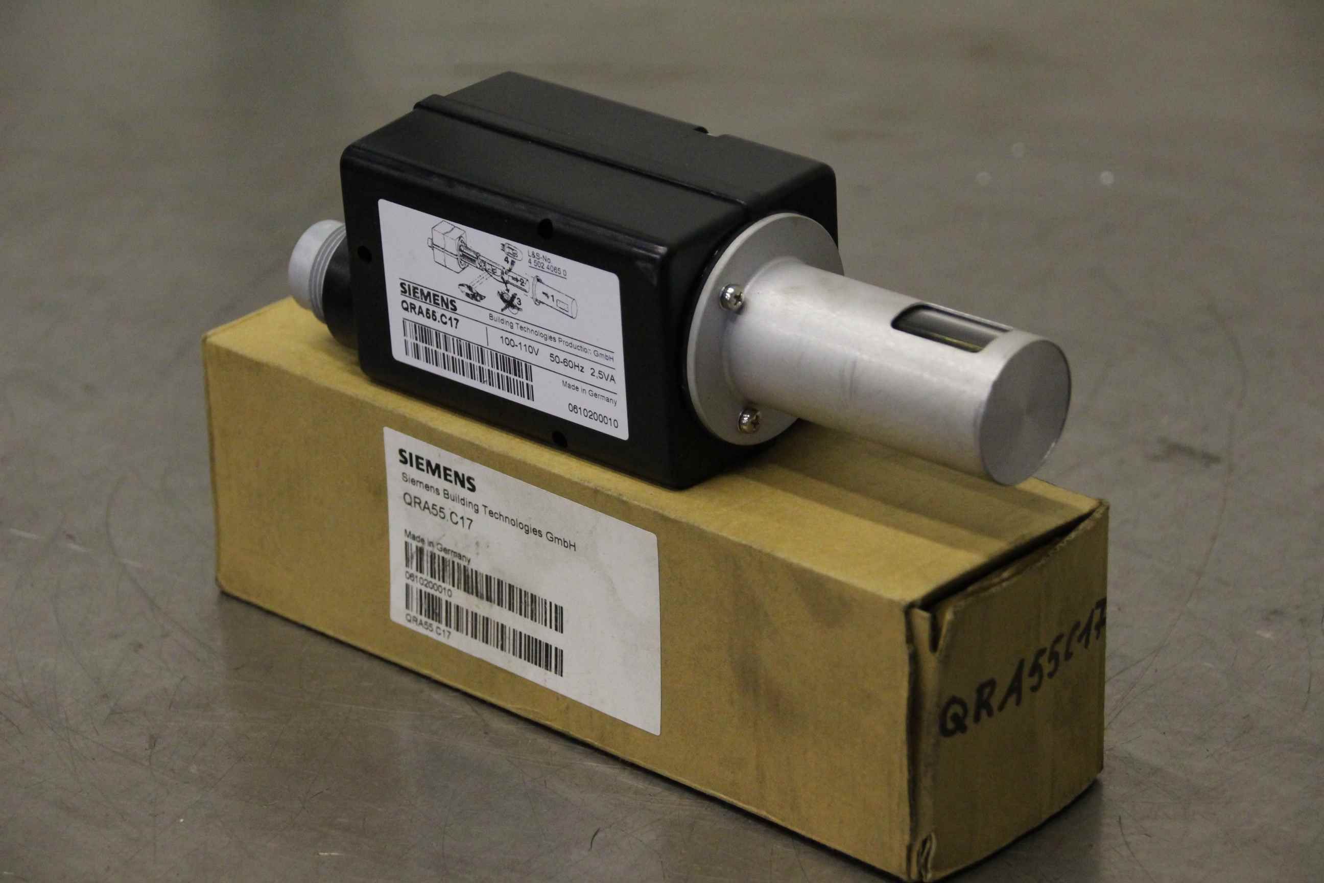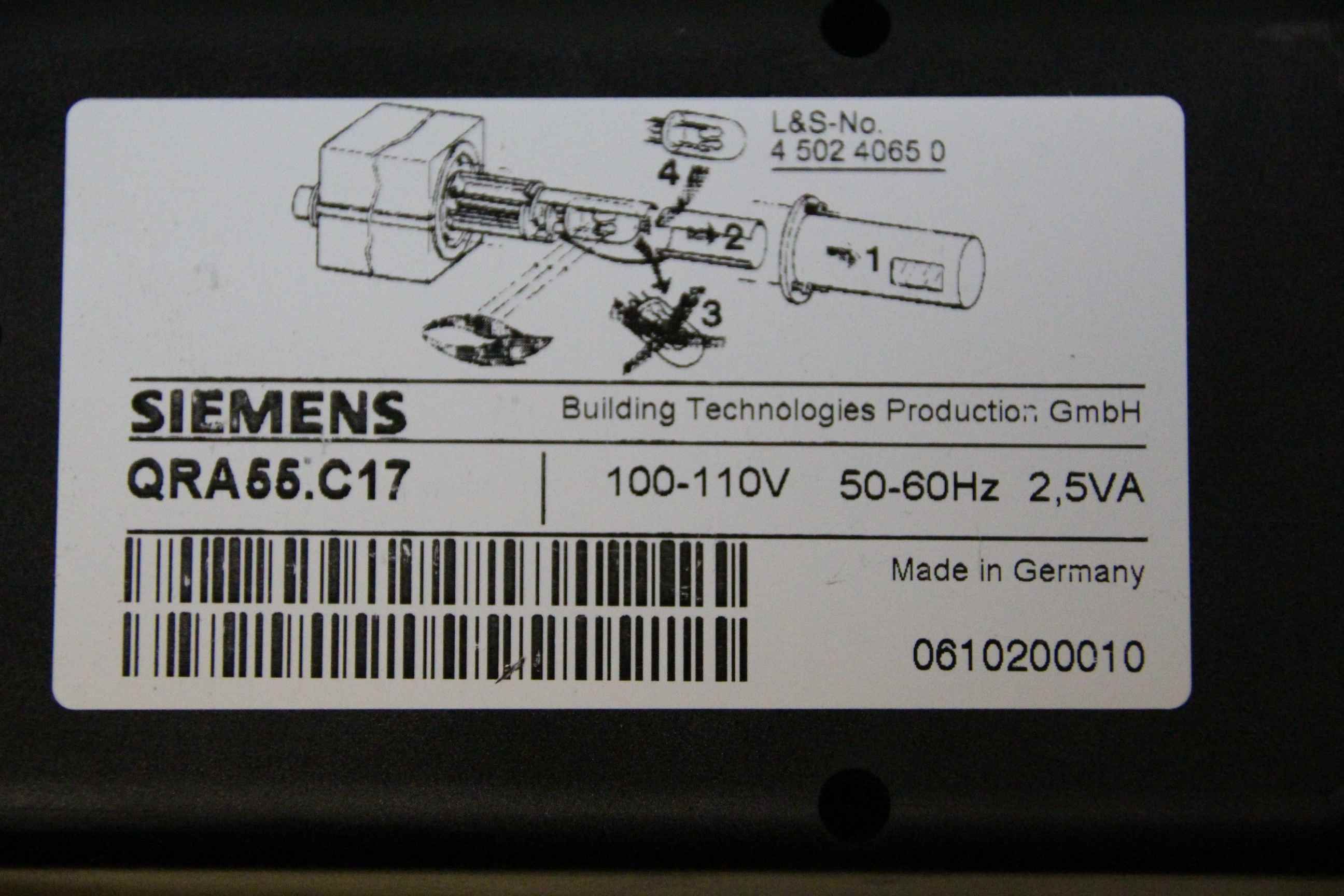 Switchgear, control, flame sensor, flame monitor, UV flame sensor, UV sensor-Manufacturer: Siemens, infrared flame sensor OVP-Type: QRA55.C17-Voltage: 100-110 V-Dimension box: 220/65/H65 mm-Weight: 0.5 kg