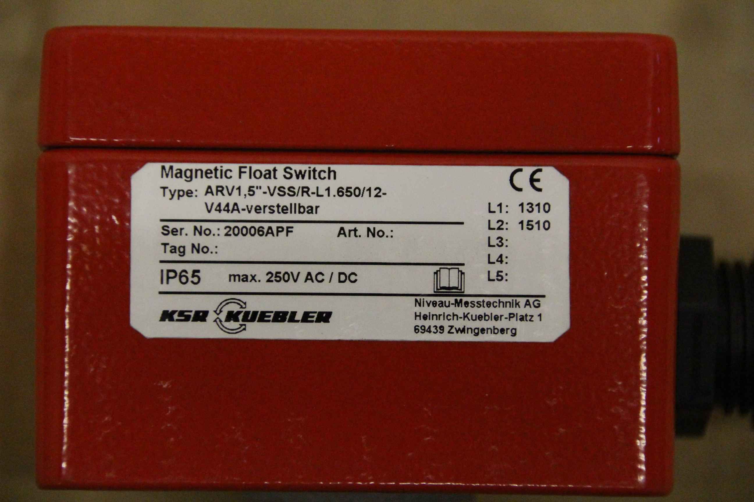 Level sensor, Sensor, probe, immersion probe, float switch, magnetic switch, magnetic float switch-Manufacturer: KSR Kuebler, Magnetic Float Switch-Type: ARV1.5 -VSS/R-L1.650/12-V44A-adjustable-Immersion depth: approx. 1650 mm-Dimensions: 1785/75/90 mm-Weight: 1.4 kg