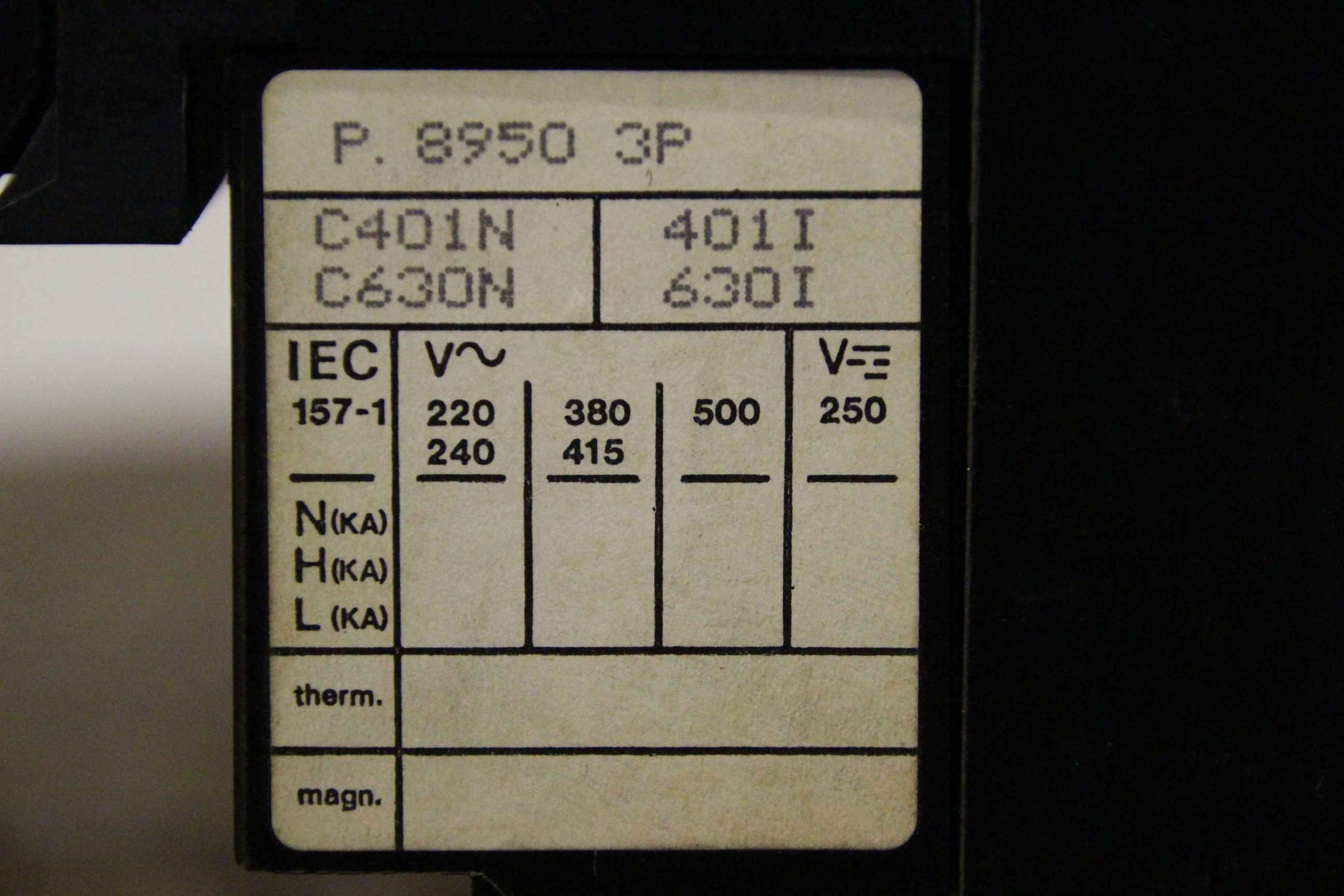 Auxiliary switch, automatic circuit breaker, fuse, line switch, line circuit breaker, switch disconnector, terminal plate, switch disconnector, circuit breaker, circuit breaker-Manufacturer: Merlin Gerin, circuit breaker type compact C630NI-Drive: 230 V/AC-Triggering: MX triggering via a relay or button with 24 VDC-Current strength: 630 A-Dimensions: 290/155/H250 mm-Weight: 10.4 kg